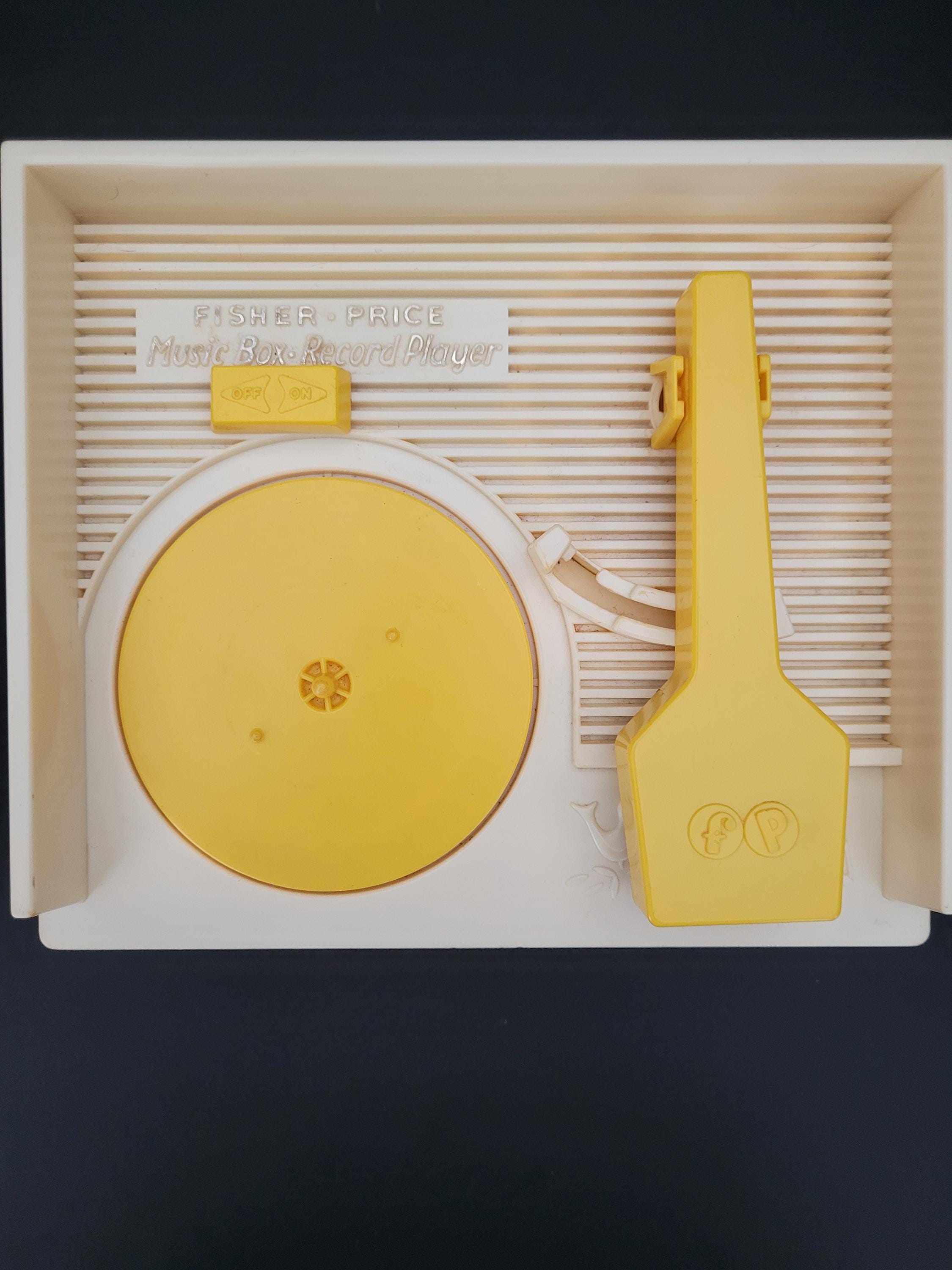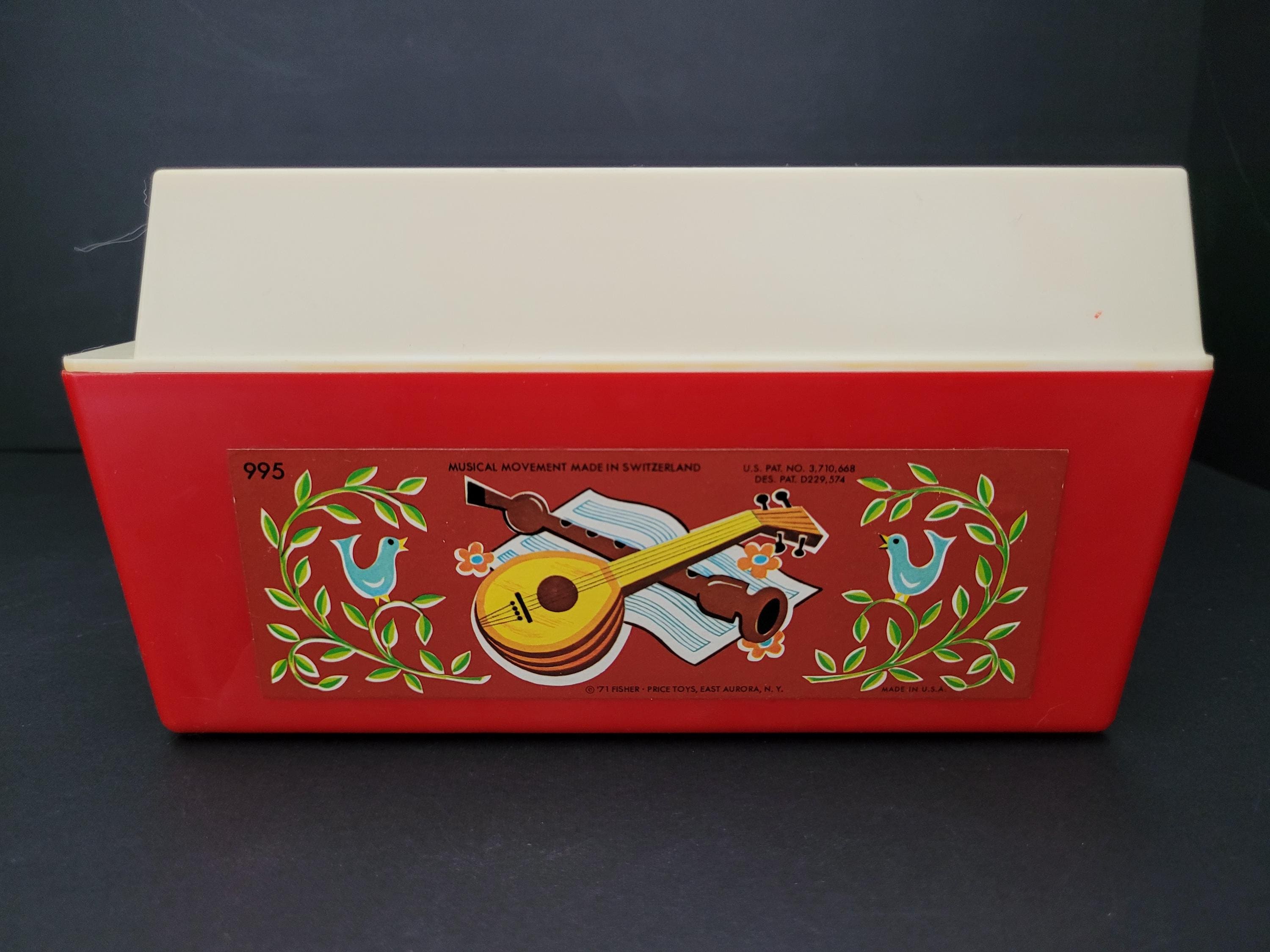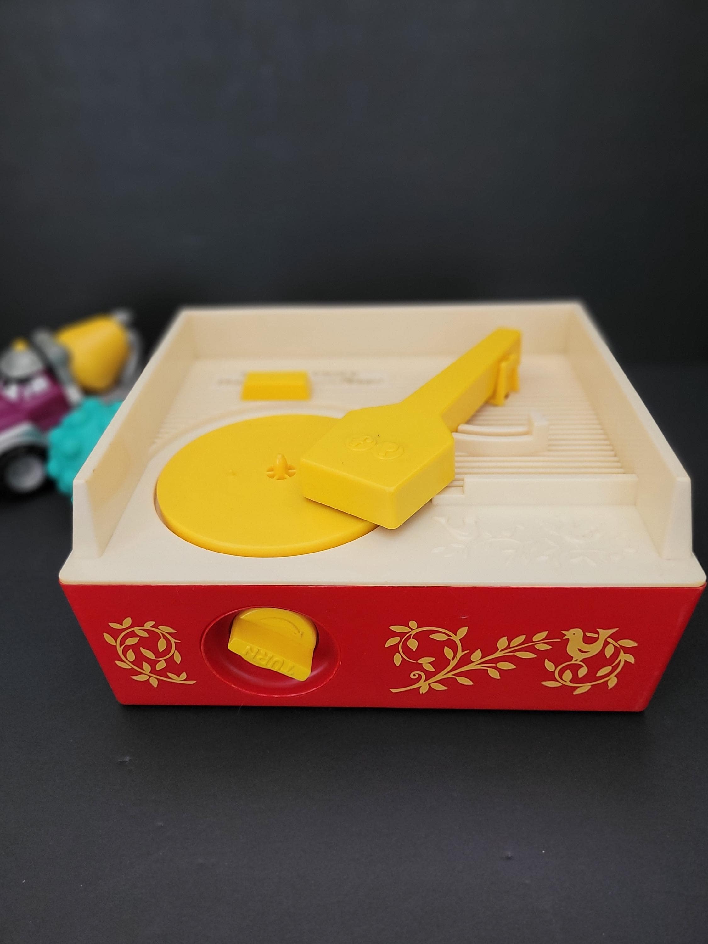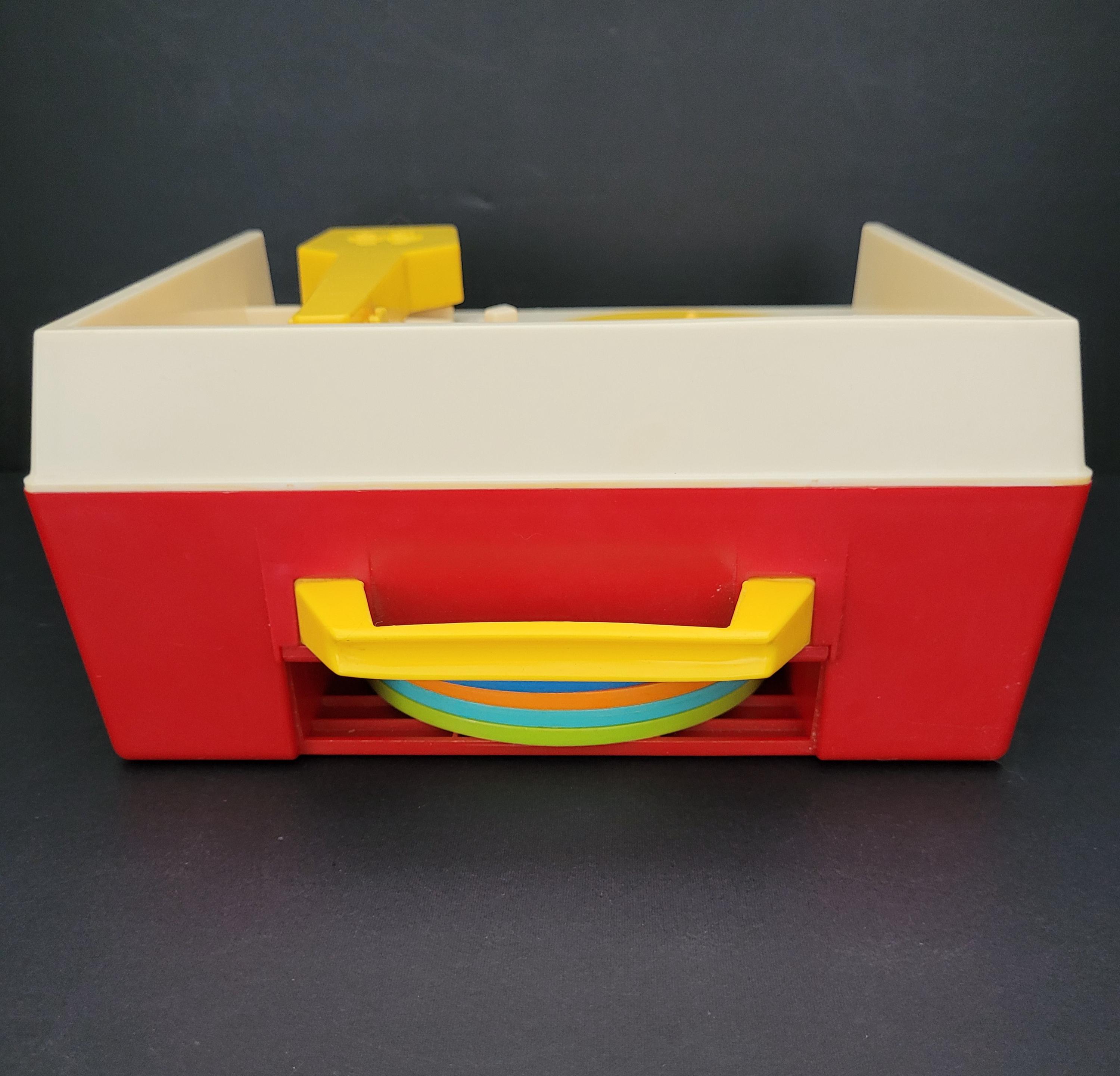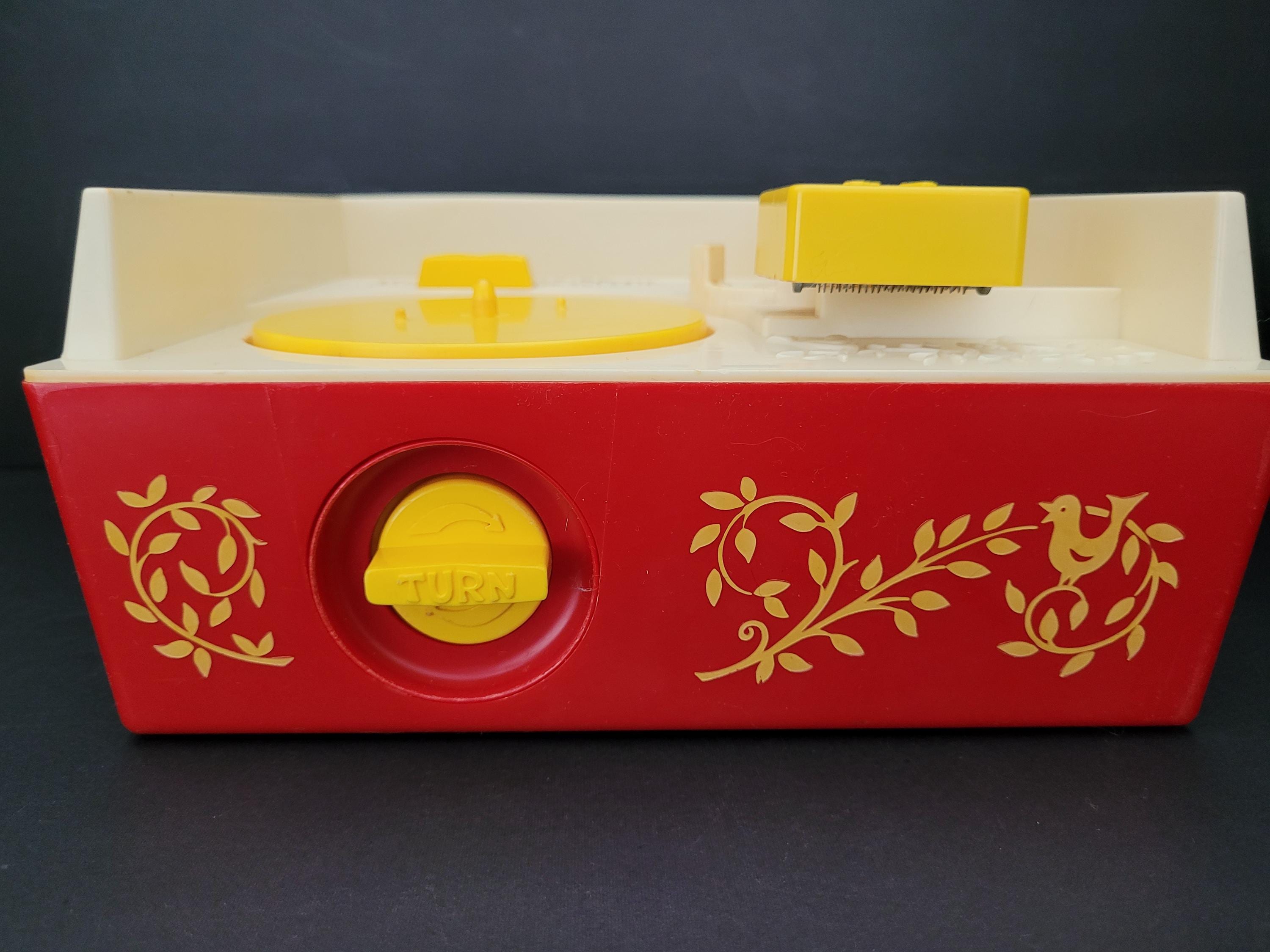 First issued in 1971, this beloved toy from Fisher Price was re-released in 2010 as one of the "classic toys" line. Personally, I prefer this older version of #995 Music Box Record Player, and love the wind up mechanism and "on/off" switch. In very good to excellent condition for it's age, and includes the five original records. Body of player is free of damage, and lithographs are in outstanding condition. As seen in video, the winding mechanism and turntable are functional however it should be noted that play is a little slow. Suitable for gifting or to add to your collection of nostalgic vintage toys. Measures 9" x 9" x 4.5". Please view all photos. Made in USA.