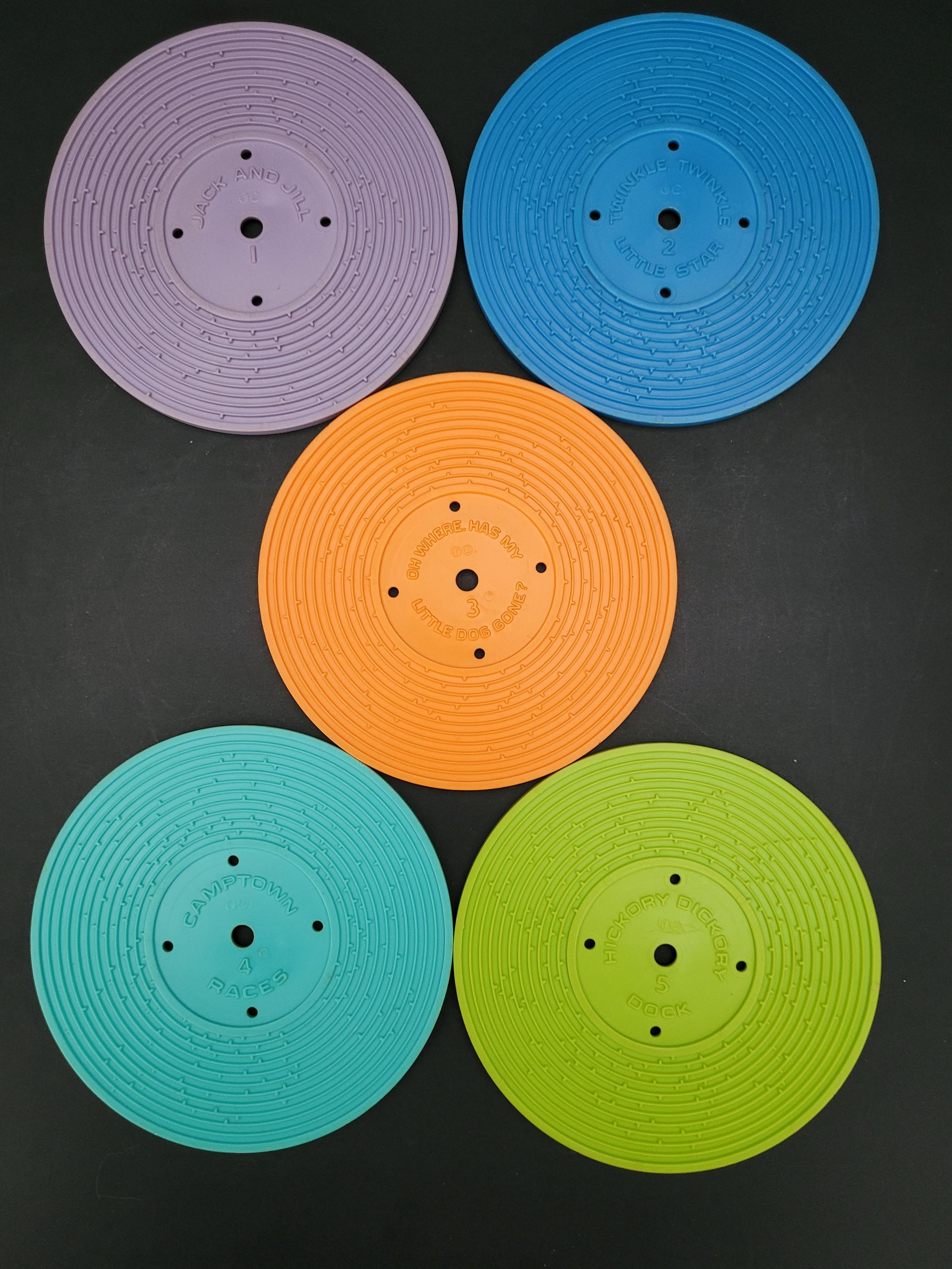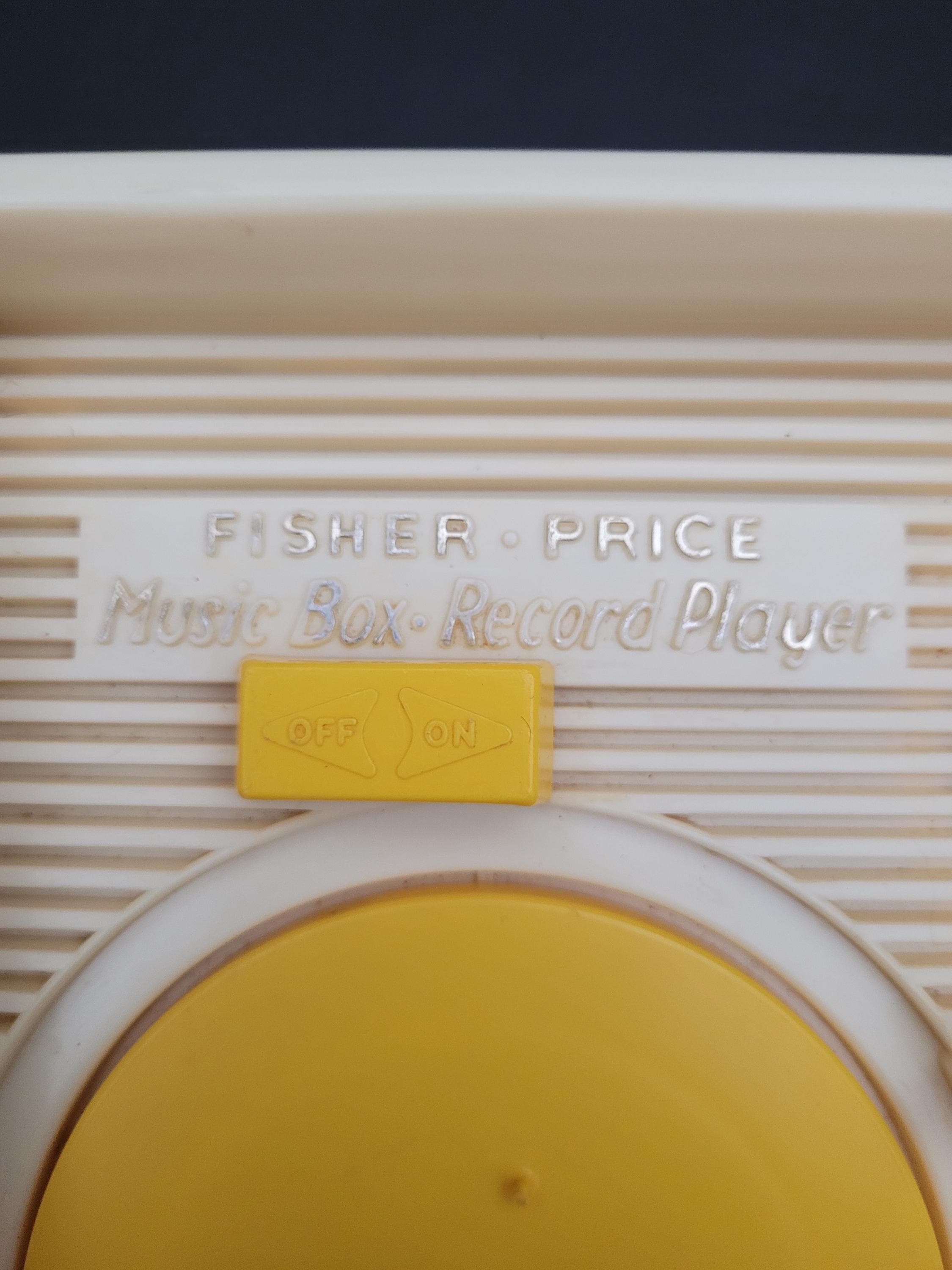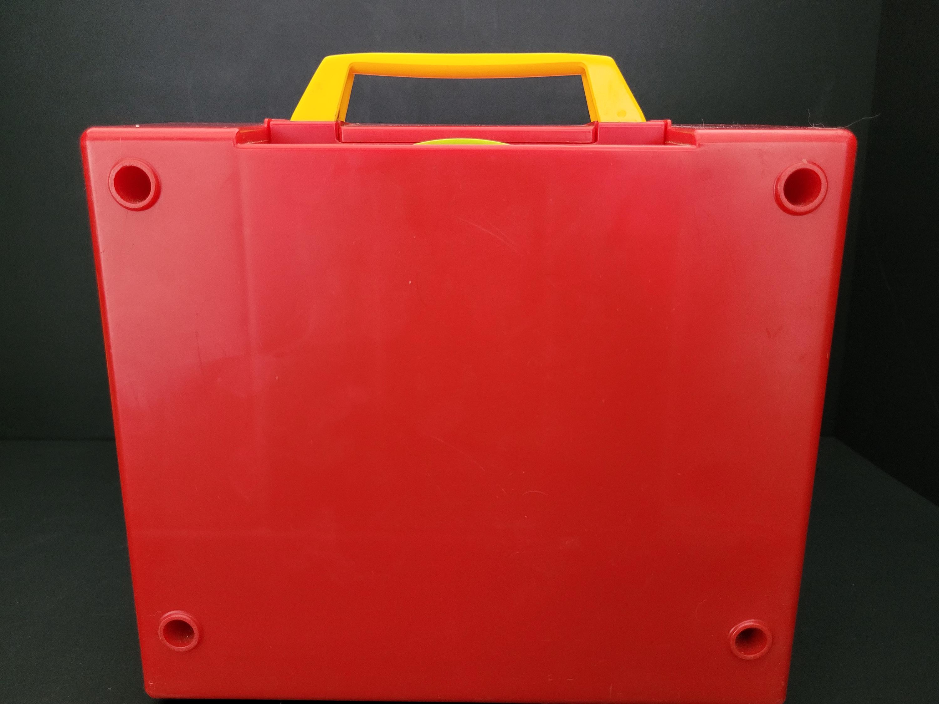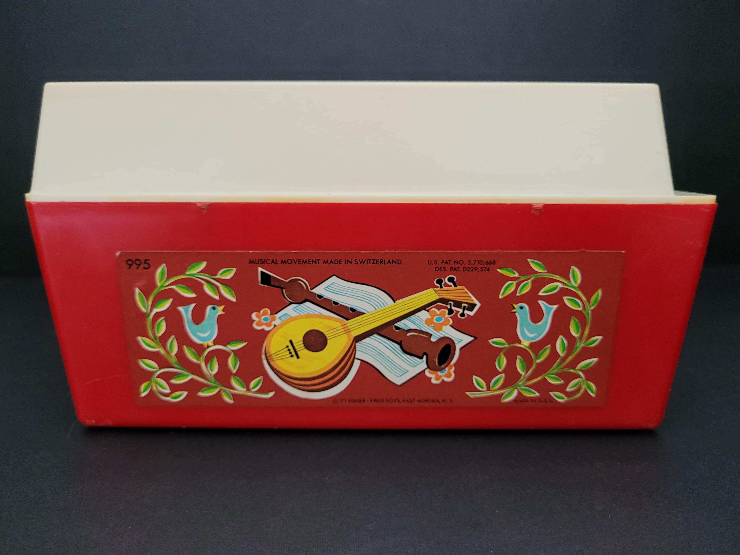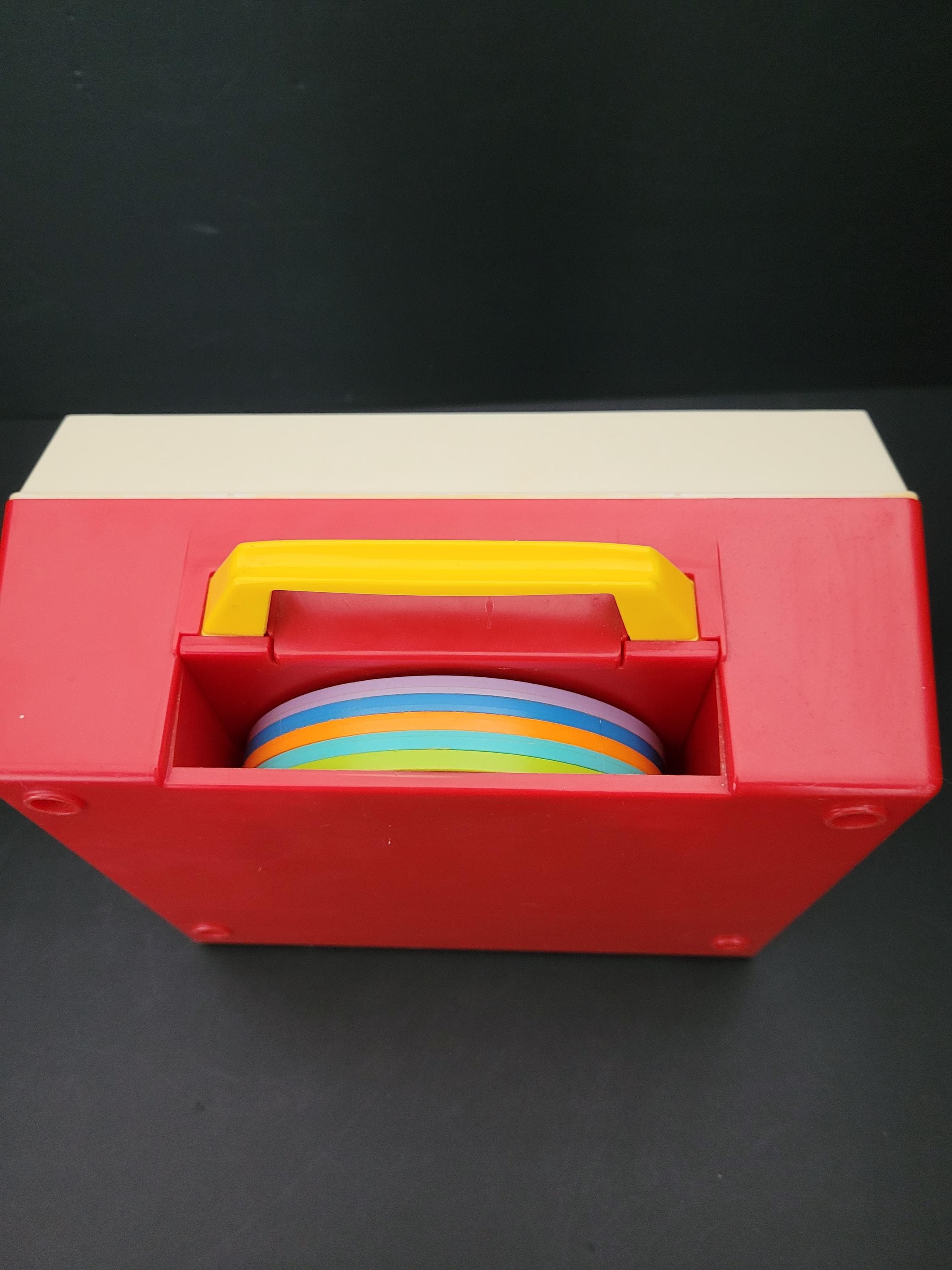 First issued in 1971, this beloved toy from Fisher Price was re-released in 2010 as one of the "classic toys" line. Personally, I prefer this older version of #995 Music Box Record Player, and love the wind up mechanism and "on/off" switch. In very good to excellent condition for it's age, and includes the five original records. Body of player is free of damage, and lithographs are in outstanding condition. As seen in video, the winding mechanism and turntable are functional however it should be noted that play is a little slow. Suitable for gifting or to add to your collection of nostalgic vintage toys. Measures 9" x 9" x 4.5". Please view all photos. Made in USA.