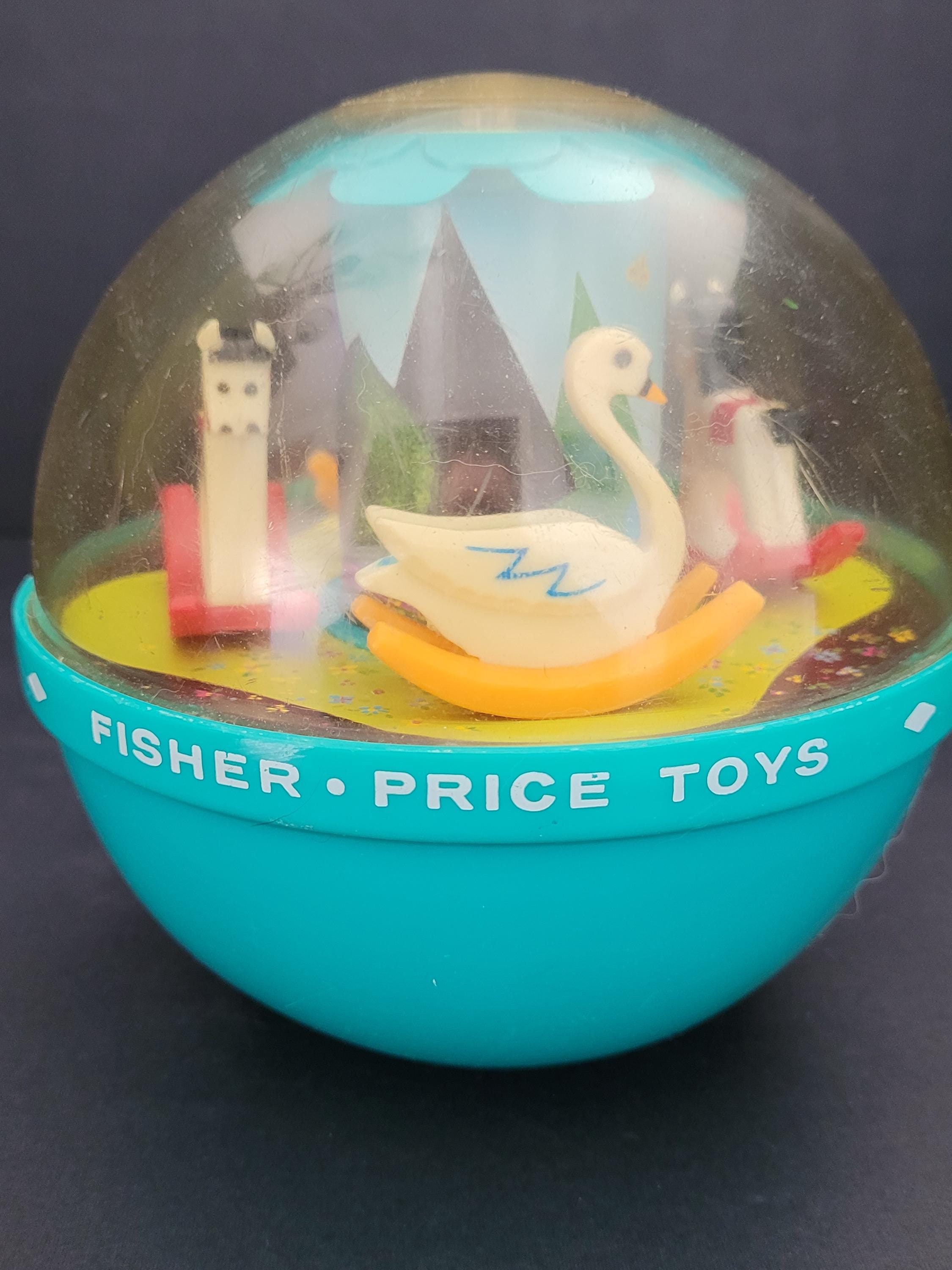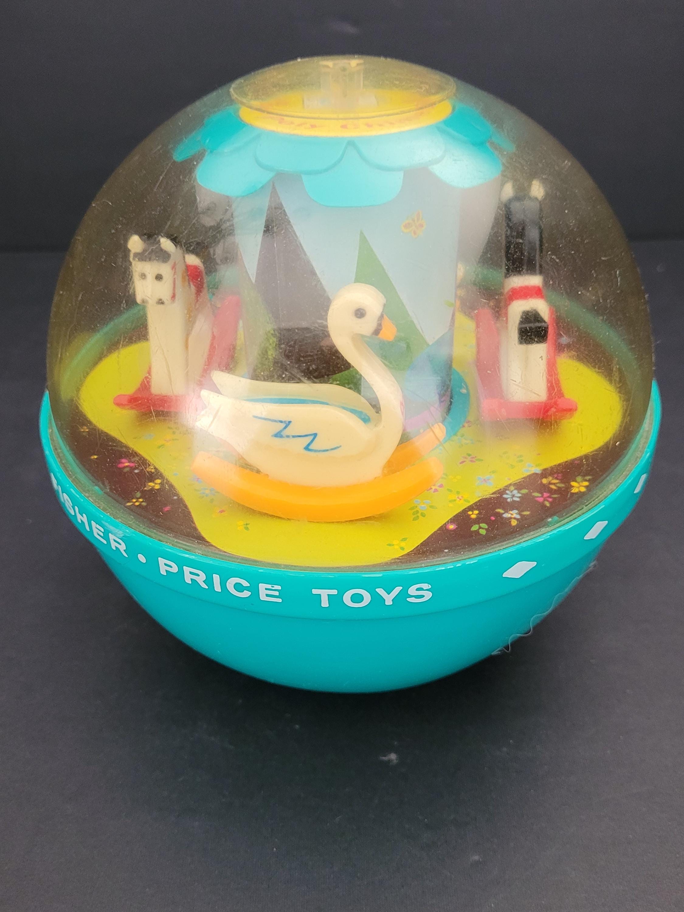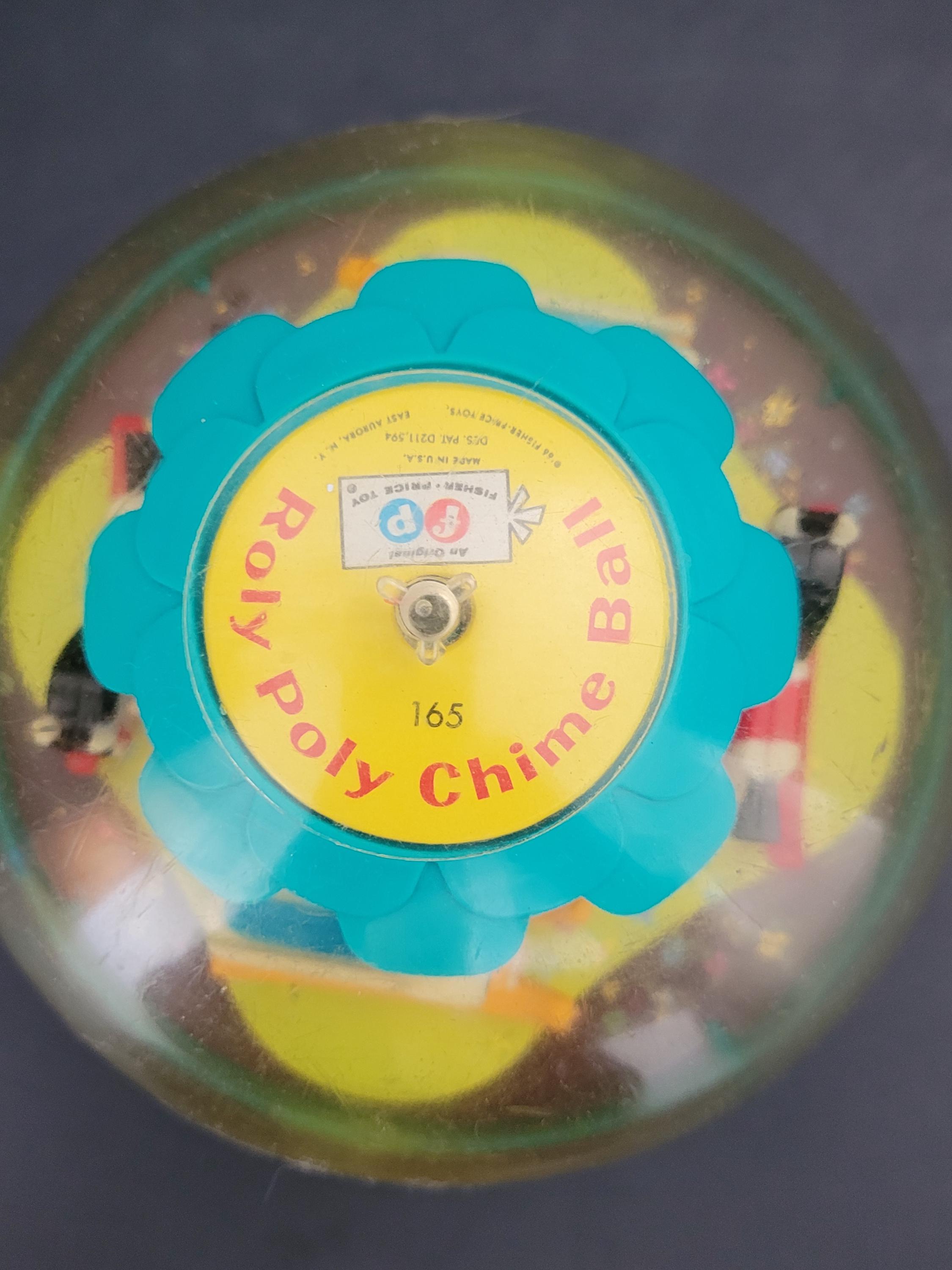 The Fisher Price # 165 Roly Poly Chime Ball is truly a classic! Whether a collectible for yourself, or a gift for a special little person, this example is in excellent condition, especially when it's age of almost 60 years is considered. The transparent top half is clear with very minor rub marks/scratches; minimal discoloration of white plastic rocking horses and swans. One of the nicest we've seen. Made in USA.
