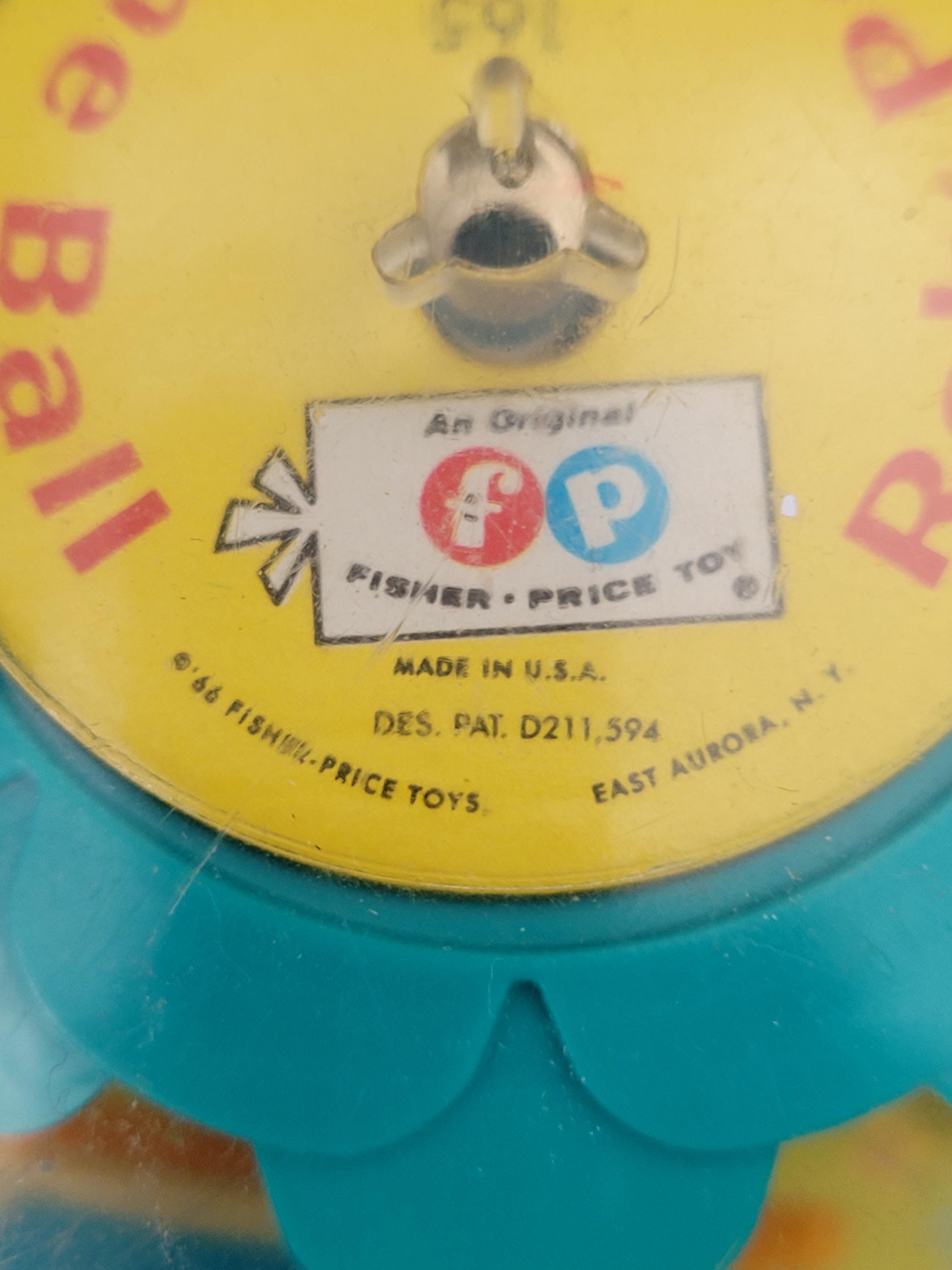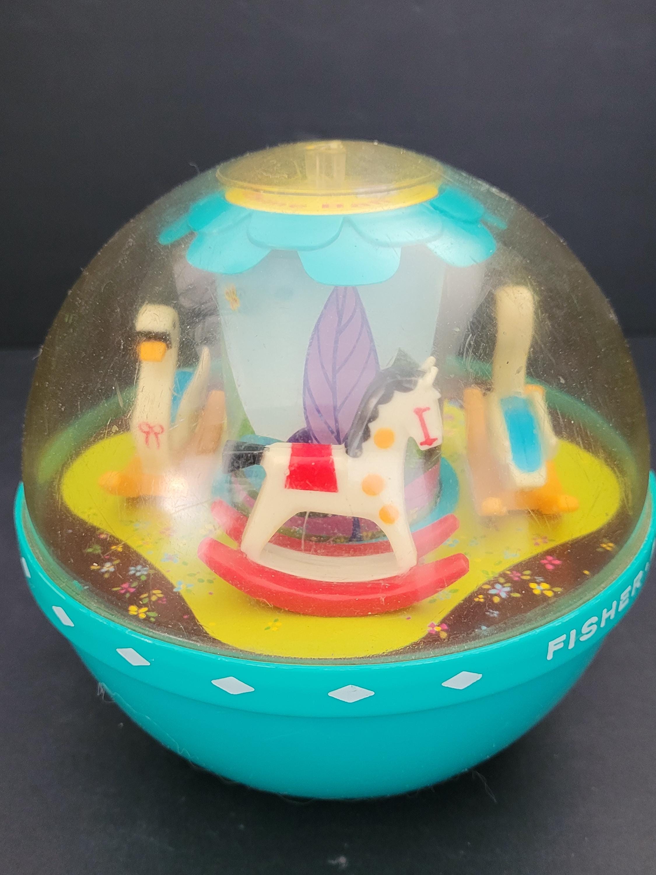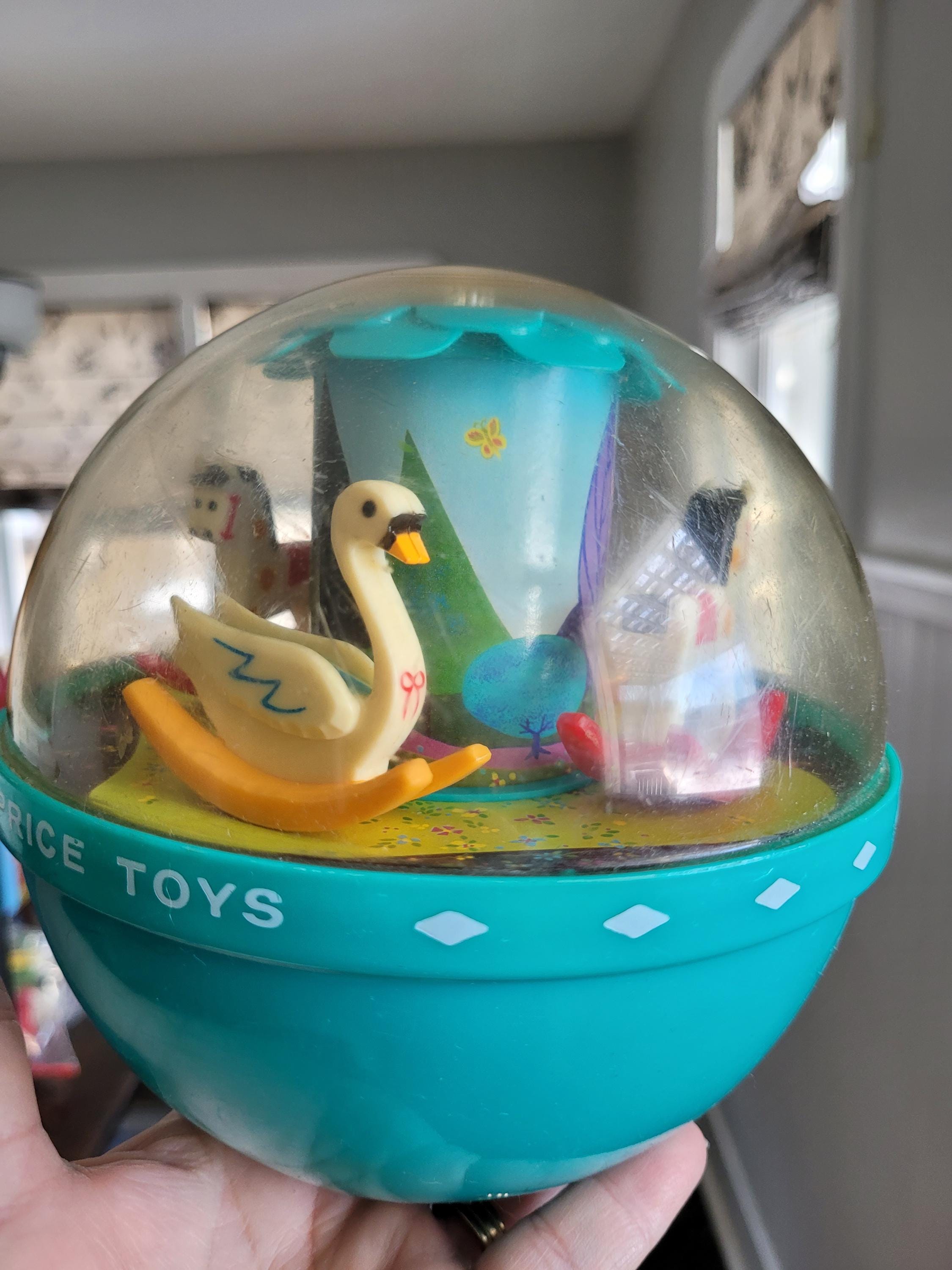 The Fisher Price # 165 Roly Poly Chime Ball is truly a classic! Whether a collectible for yourself, or a gift for a special little person, this example is in excellent condition, especially when it's age of almost 60 years is considered. The transparent top half is clear with very minor rub marks/scratches; minimal discoloration of white plastic rocking horses and swans. One of the nicest we've seen. Made in USA.