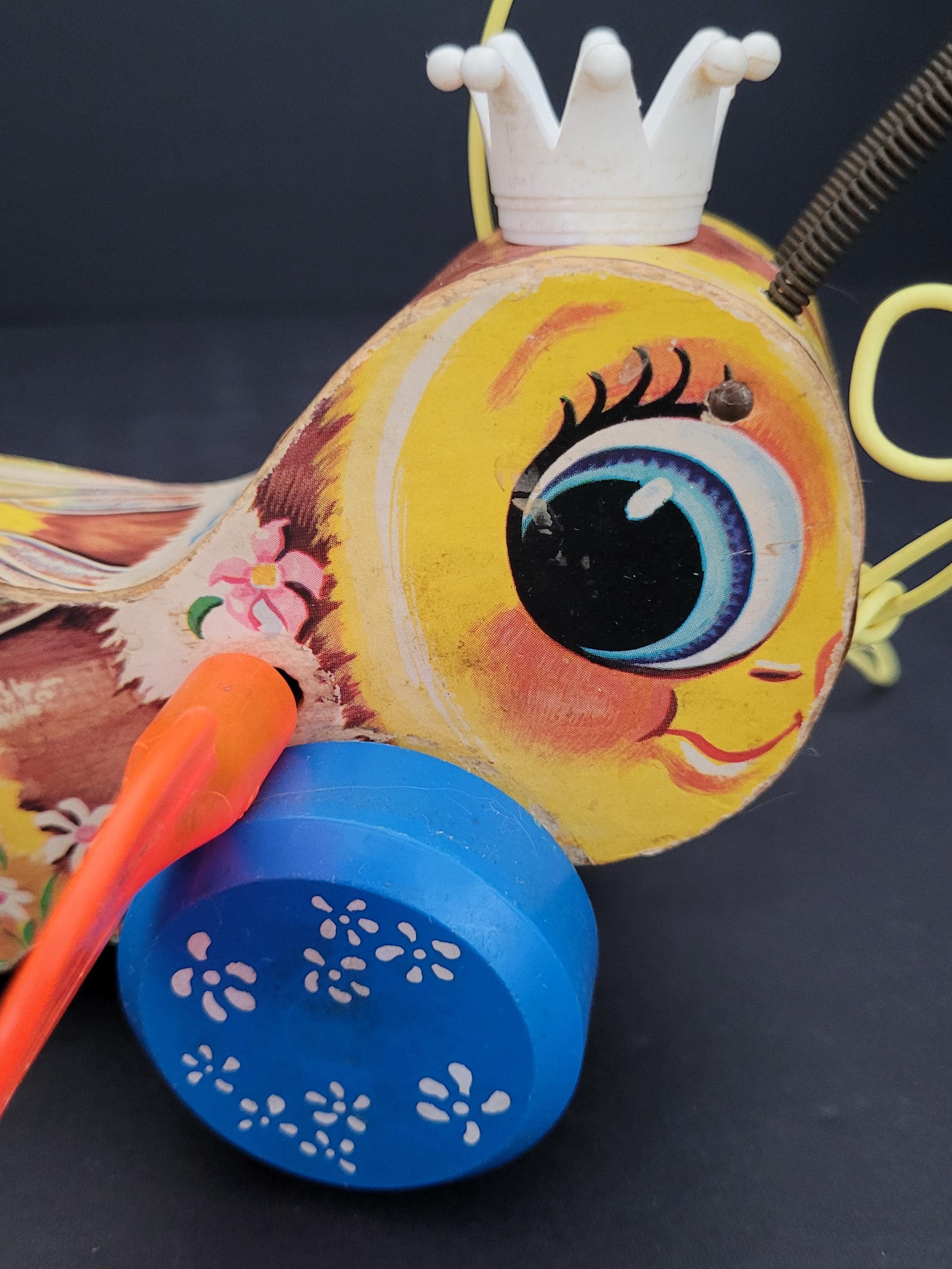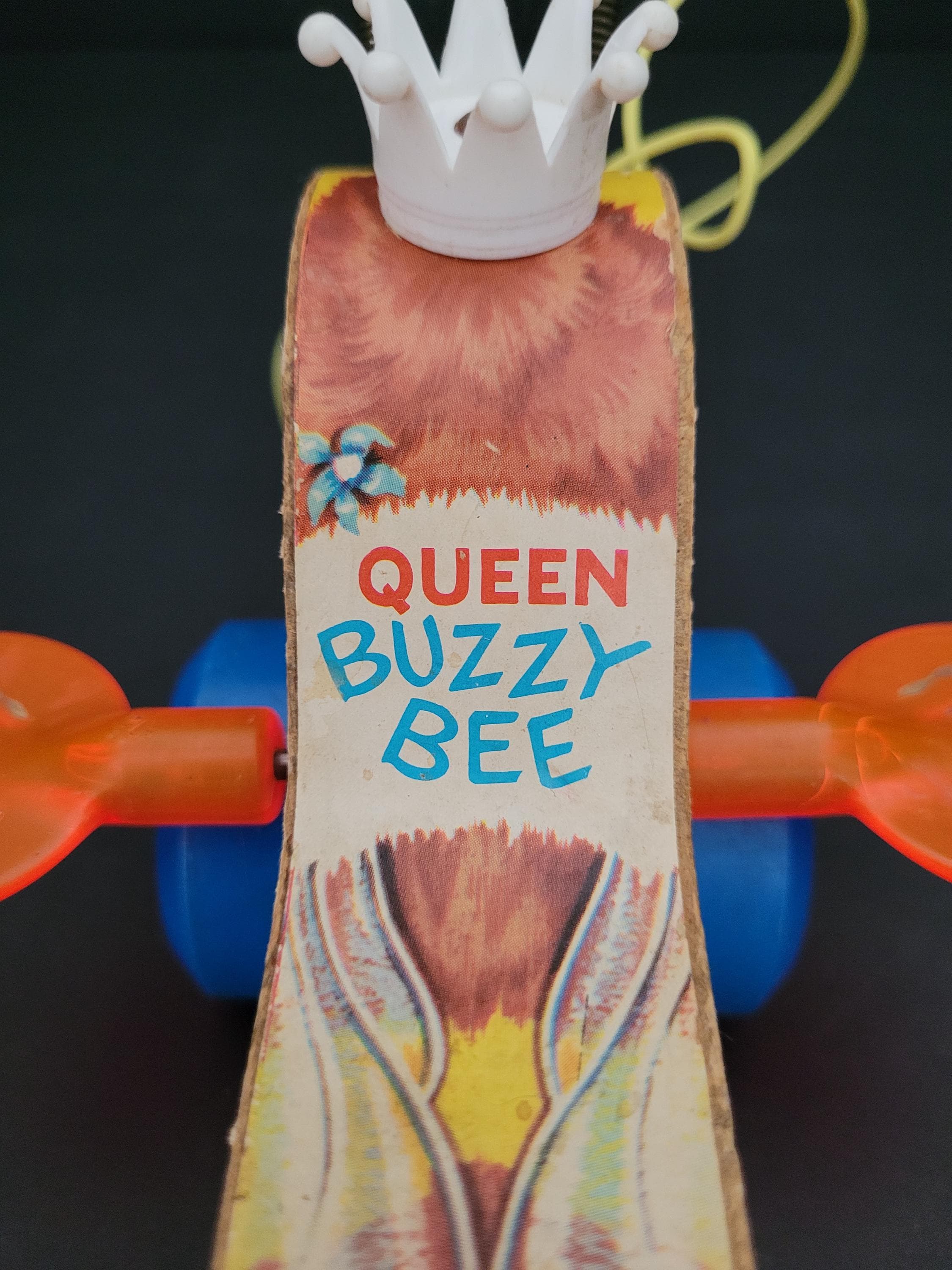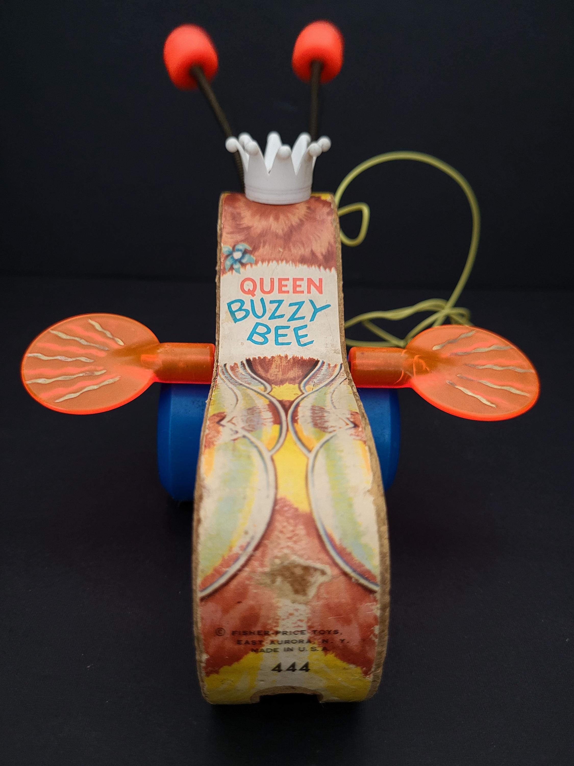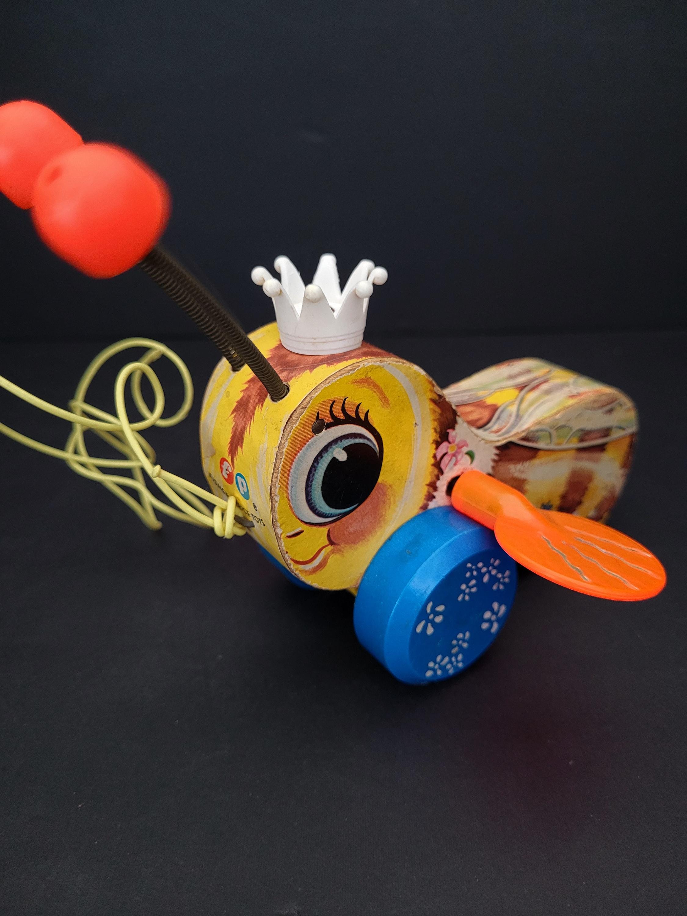 The Fisher Price #444 Queen Buzzy Bee was produced from 1962 - 1985, and featured a delightful buzzing sound, when pulled along. This adorable toy is in excellent condition: minimal wear to lithographs, save one very small worn/picked area on the rear (see photos); the white plastic crown is unbroken and clean, as are her vibrant orange wings; the blue plastic wheels indicate that the toy was gently played with; original yellow pull-string remains intact; orange/red beads atop metal spring antennae. An excellent addition to any vintage toy collection. Adult supervision recommended if played with by young children. Made in the USA.