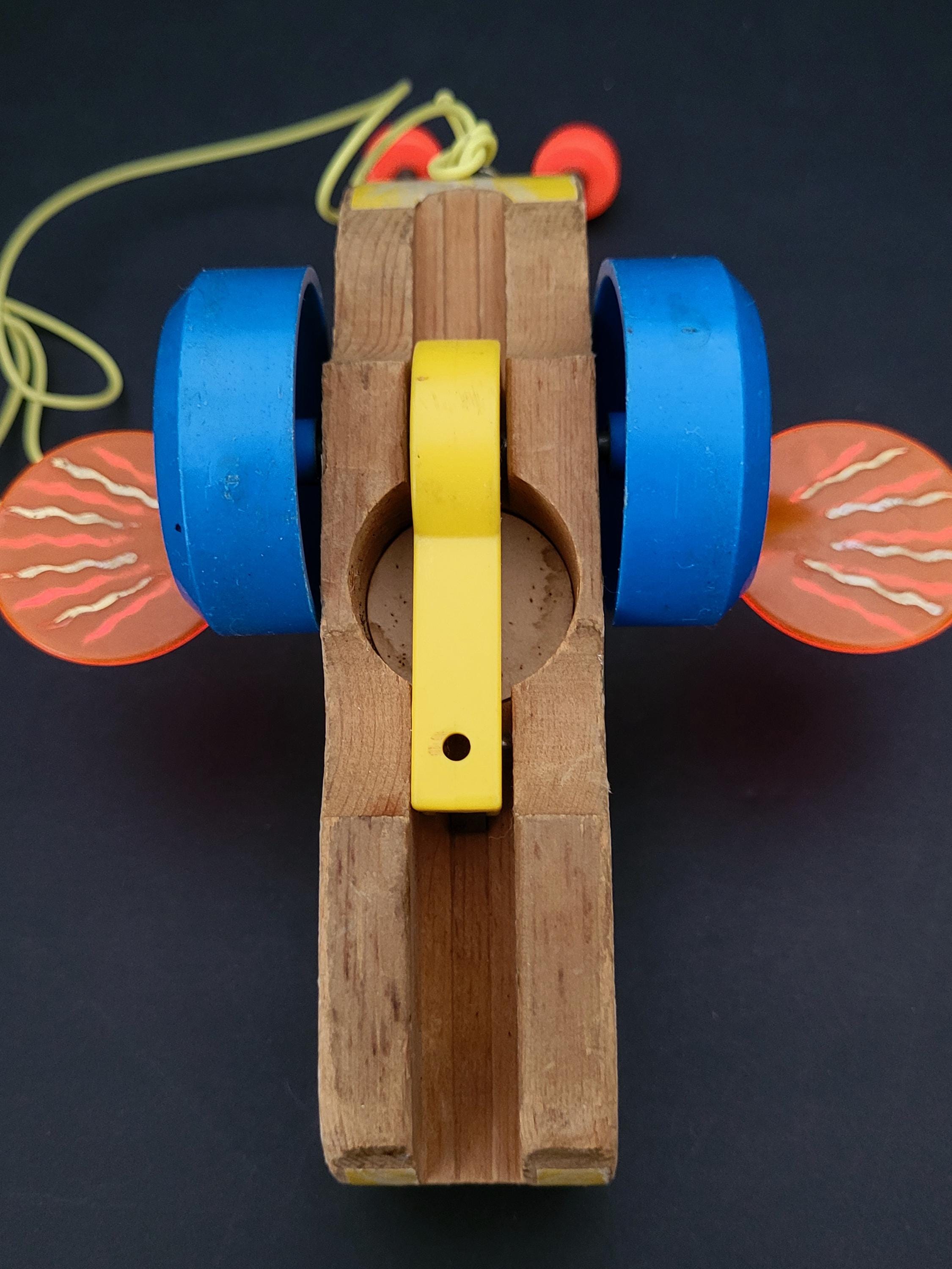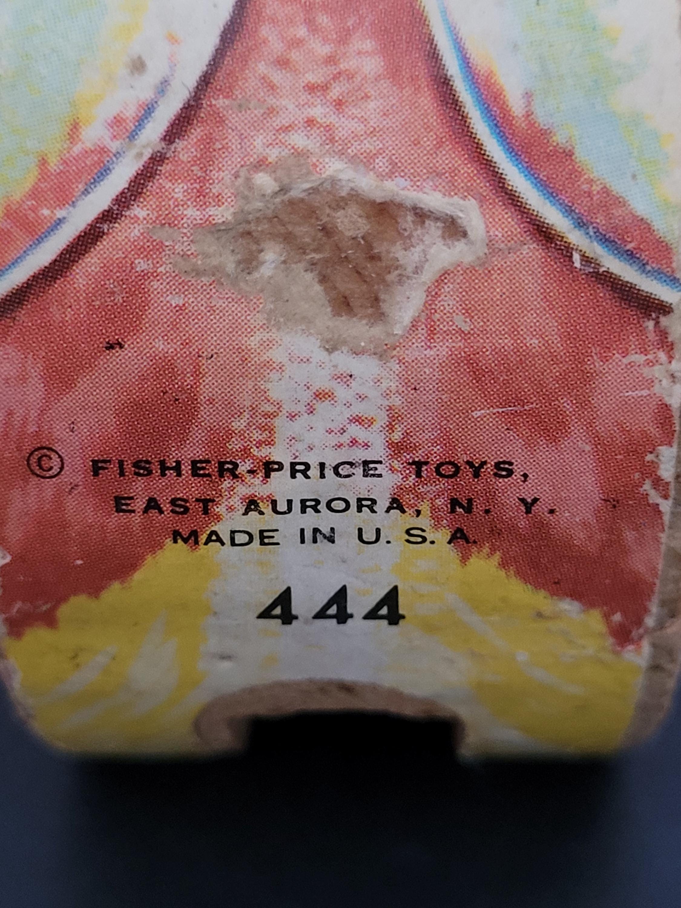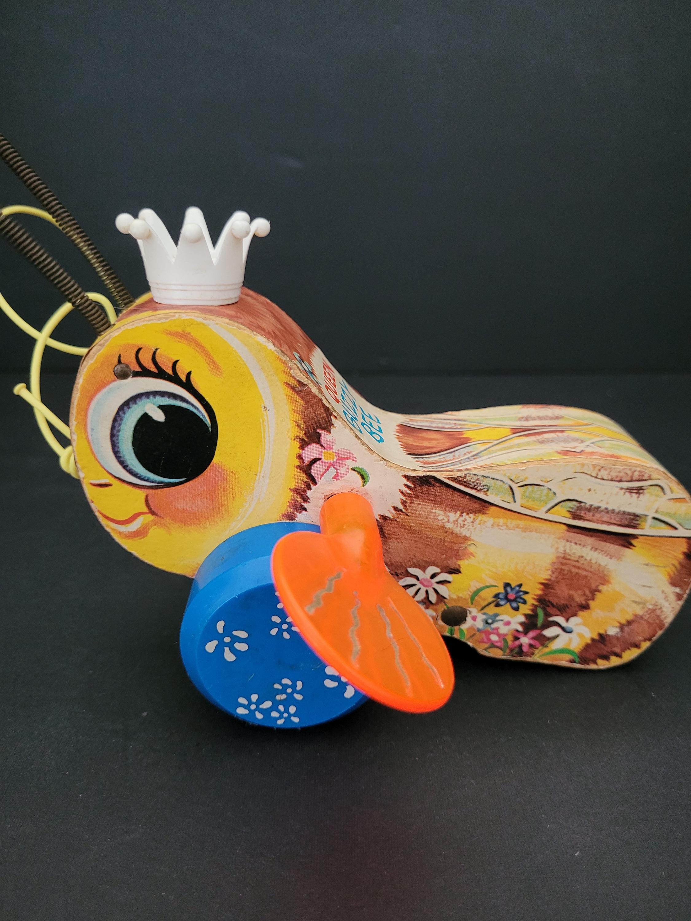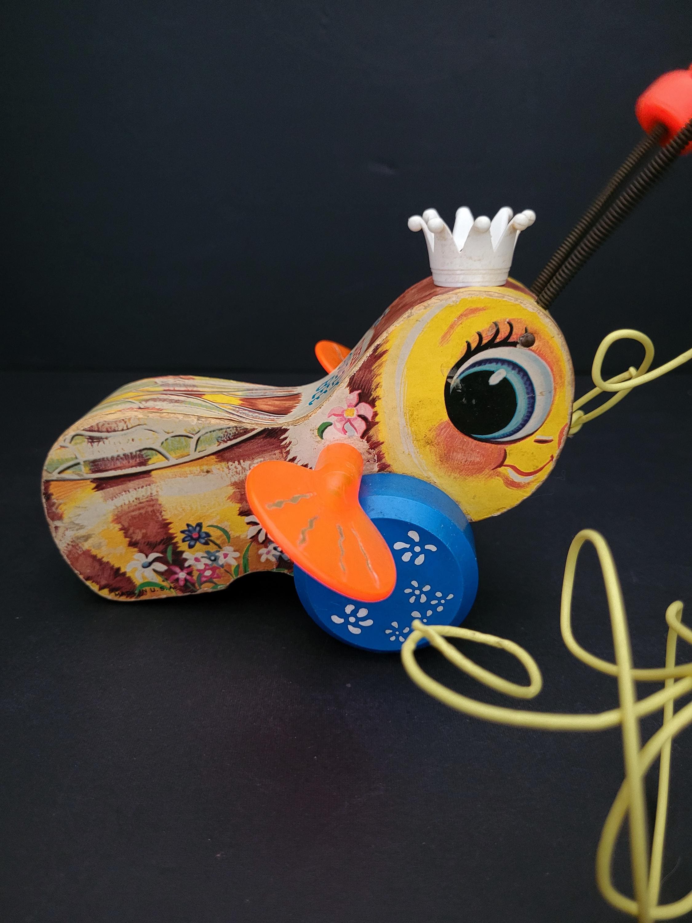 The Fisher Price #444 Queen Buzzy Bee was produced from 1962 - 1985, and featured a delightful buzzing sound, when pulled along. This adorable toy is in excellent condition: minimal wear to lithographs, save one very small worn/picked area on the rear (see photos); the white plastic crown is unbroken and clean, as are her vibrant orange wings; the blue plastic wheels indicate that the toy was gently played with; original yellow pull-string remains intact; orange/red beads atop metal spring antennae. An excellent addition to any vintage toy collection. Adult supervision recommended if played with by young children. Made in the USA.