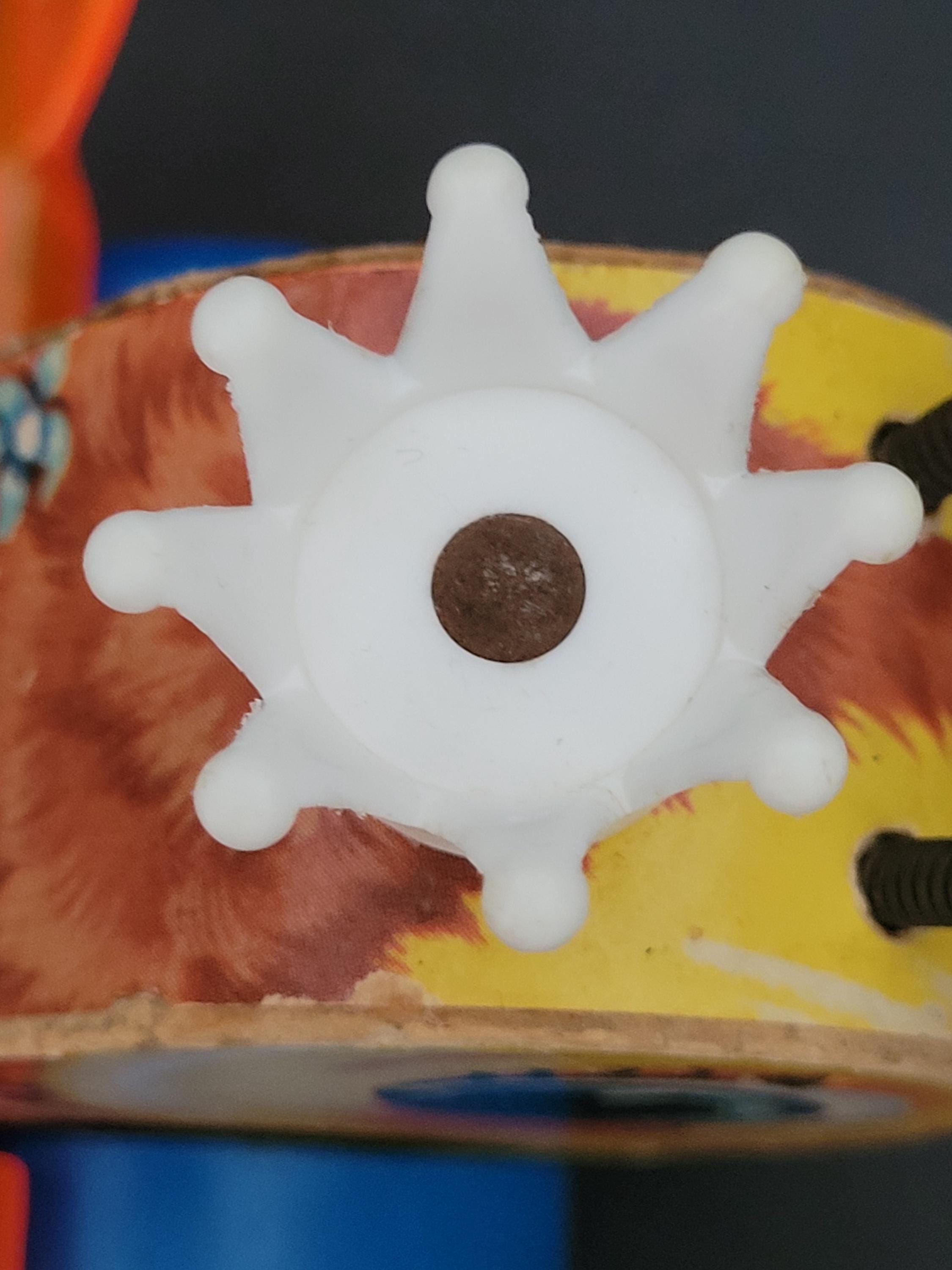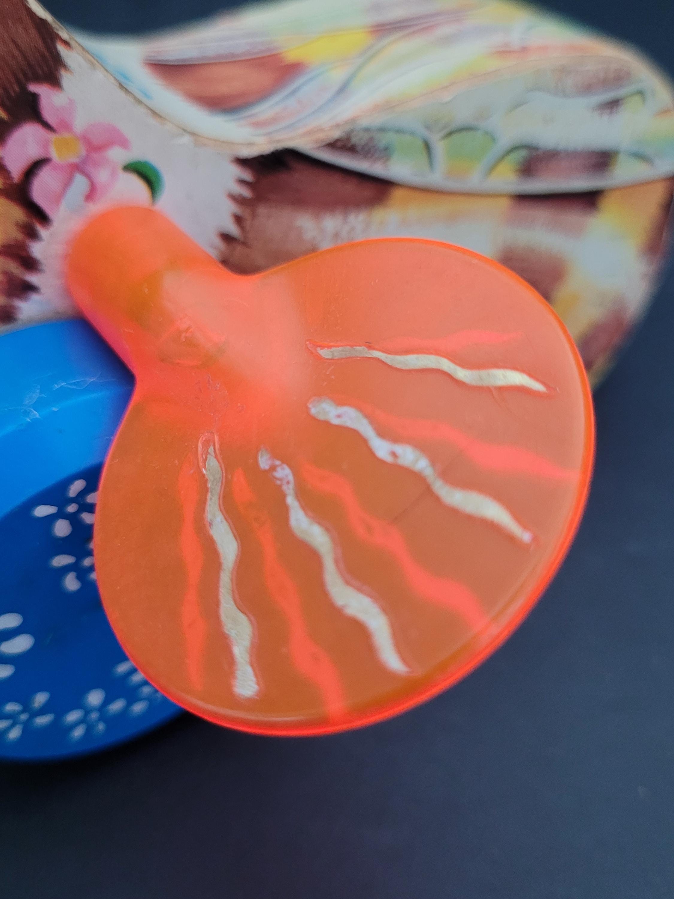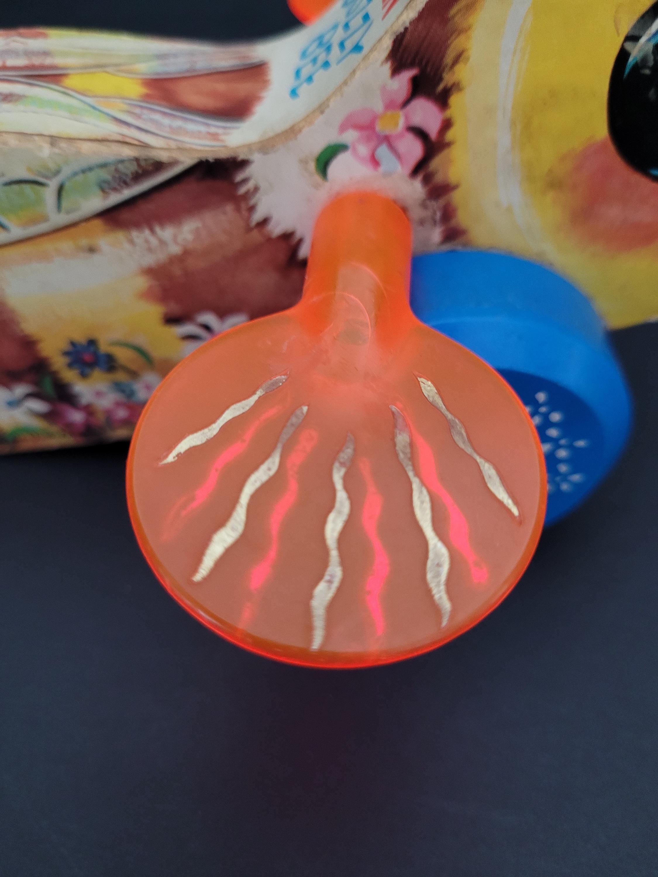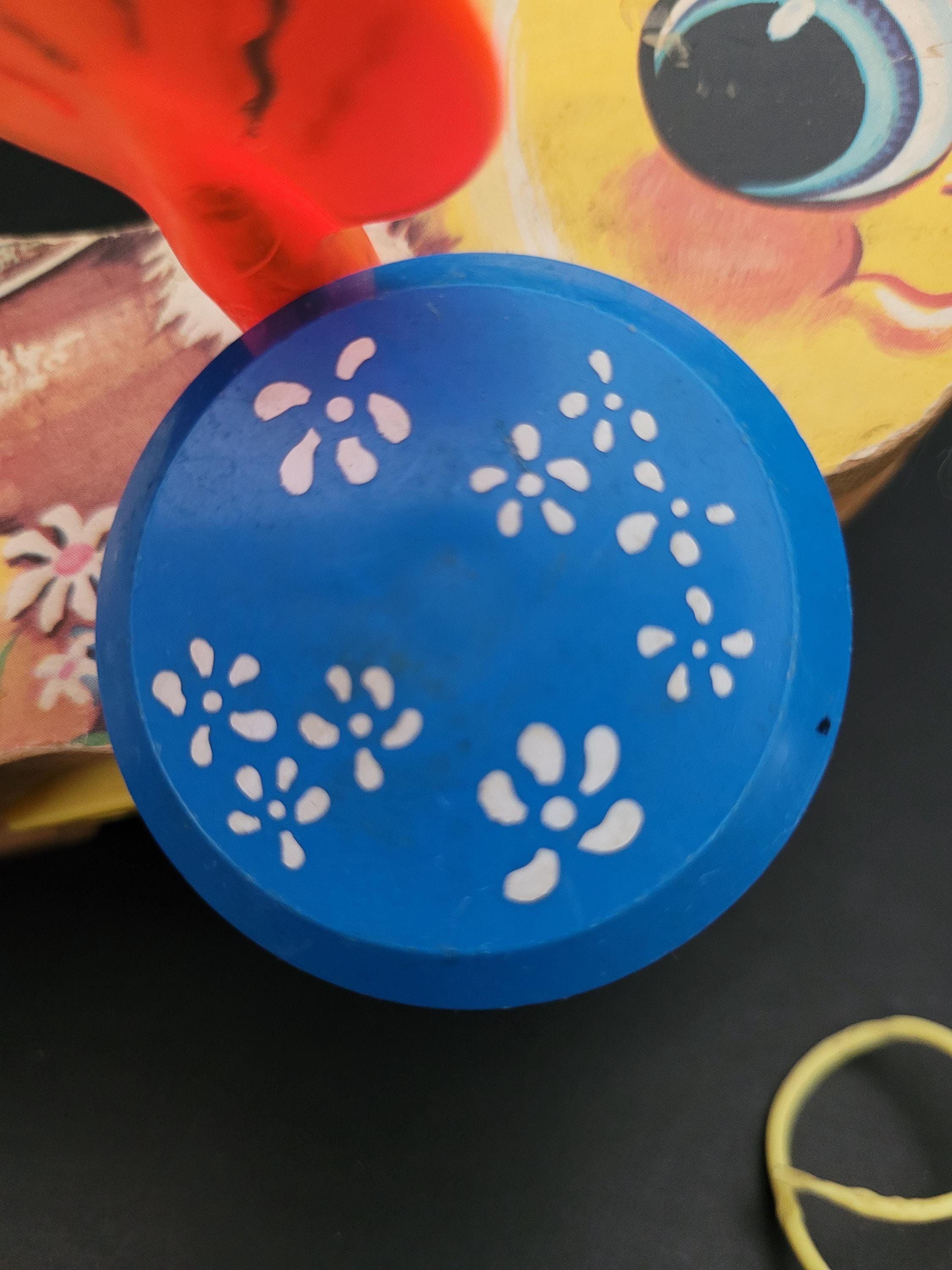 The Fisher Price #444 Queen Buzzy Bee was produced from 1962 - 1985, and featured a delightful buzzing sound, when pulled along. This adorable toy is in excellent condition: minimal wear to lithographs, save one very small worn/picked area on the rear (see photos); the white plastic crown is unbroken and clean, as are her vibrant orange wings; the blue plastic wheels indicate that the toy was gently played with; original yellow pull-string remains intact; orange/red beads atop metal spring antennae. An excellent addition to any vintage toy collection. Adult supervision recommended if played with by young children. Made in the USA.