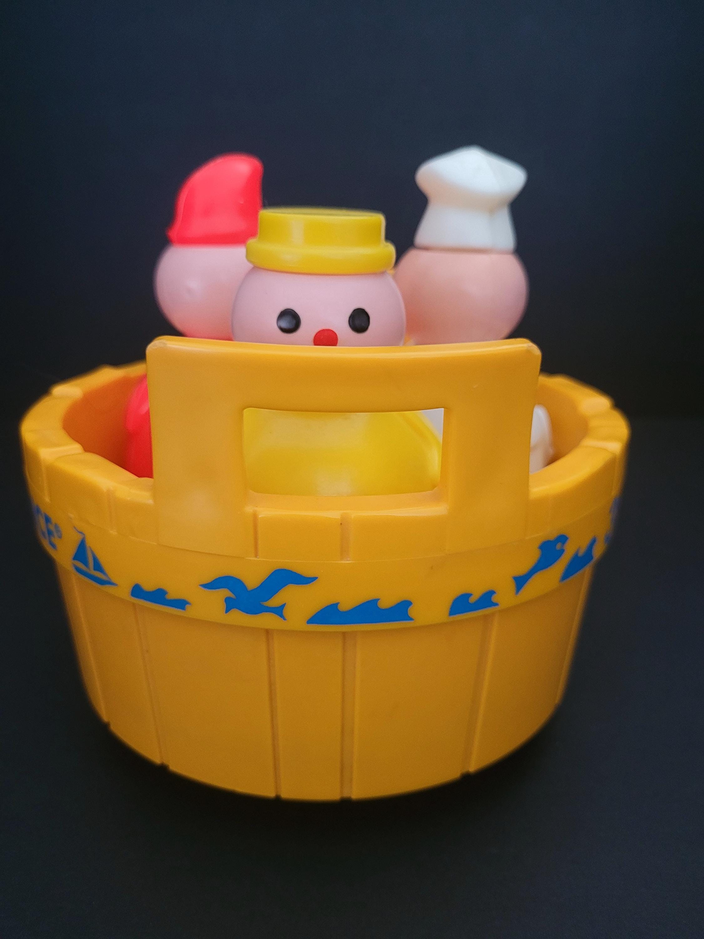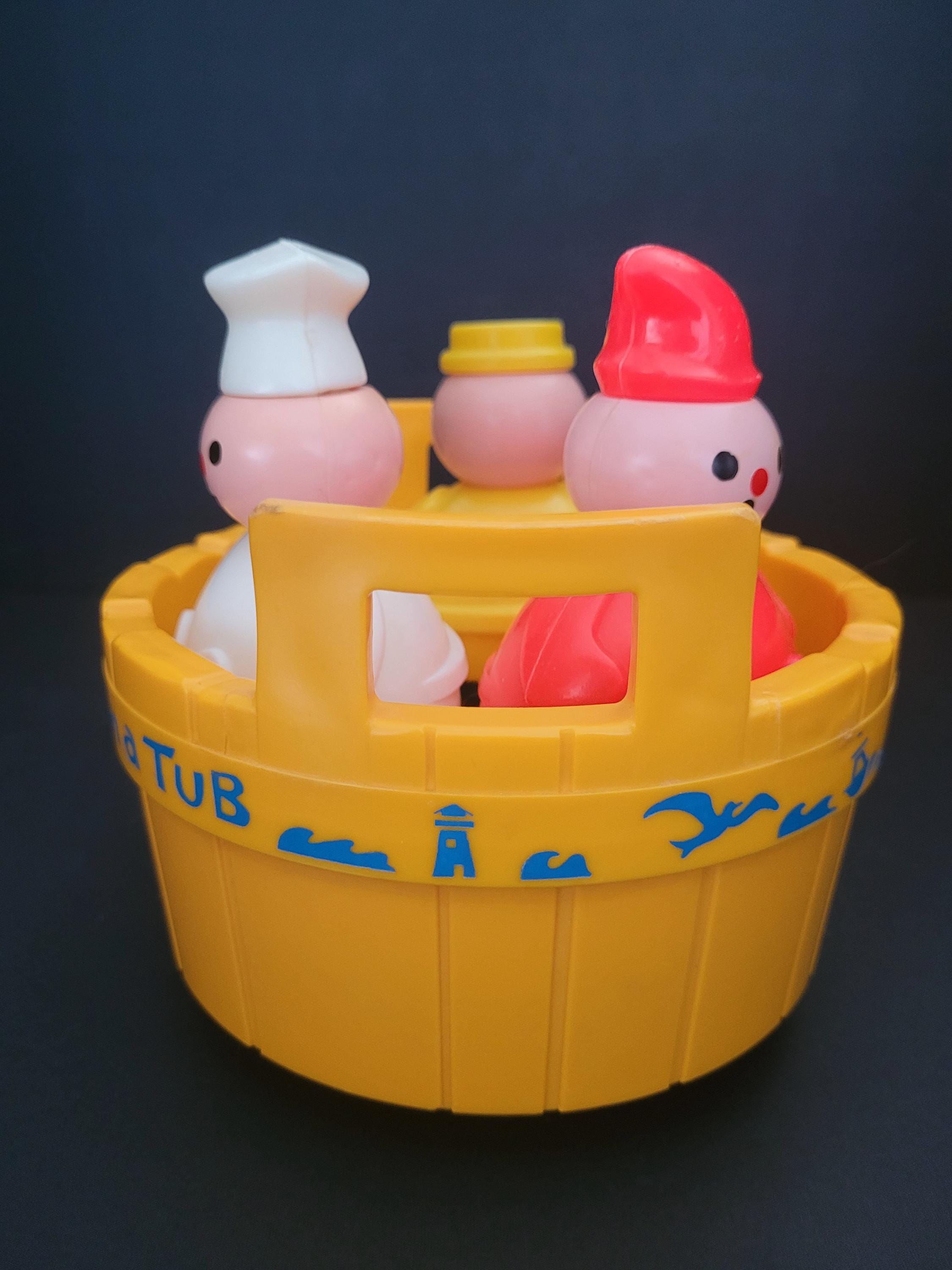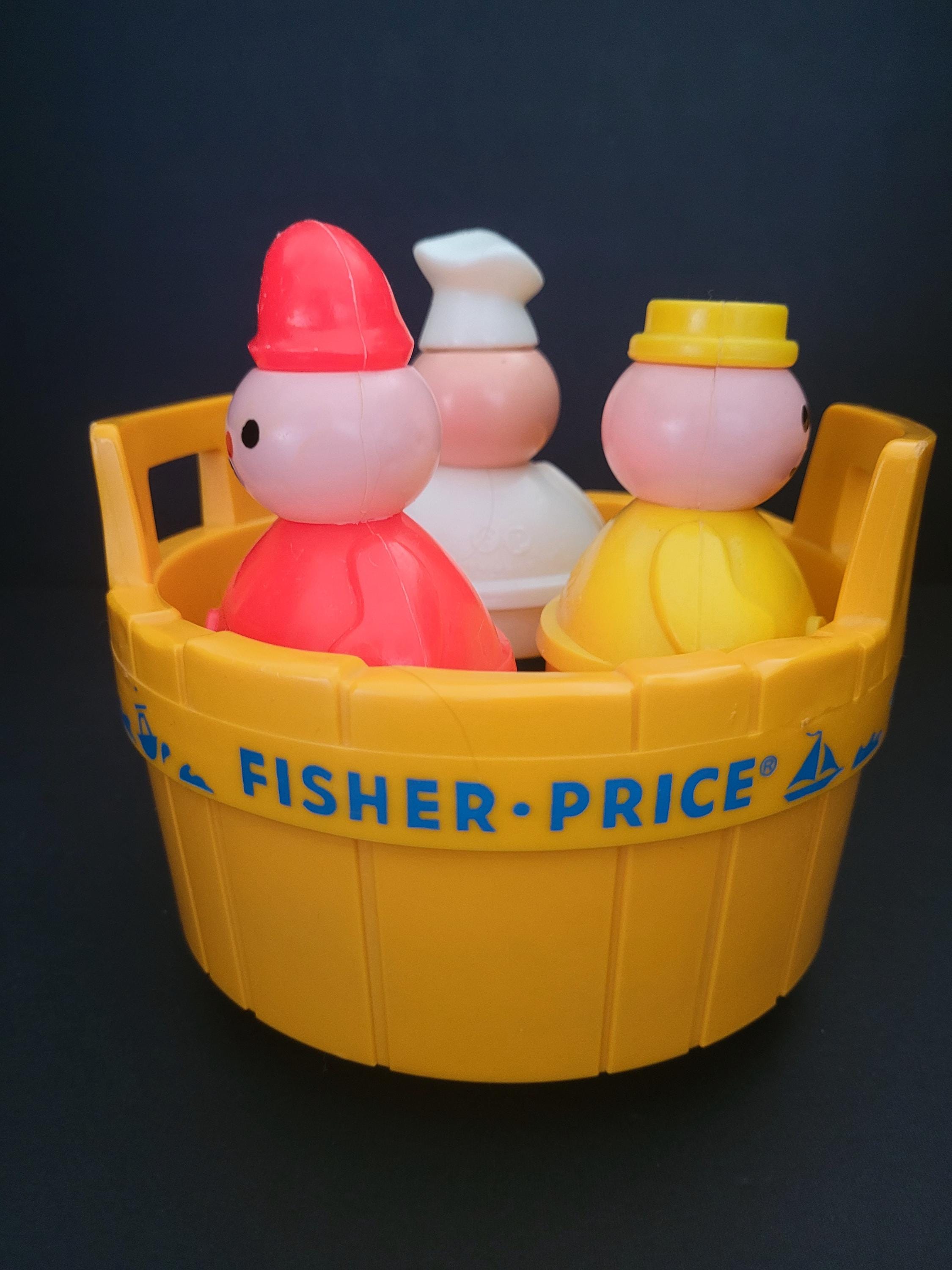 Rub-a-Dub-Dub, Three Men in a Tub! Featured is Fisher Price's #142 classic nursery rhyme themed toddler toy, suitable for bathtub play or dry land adventures! This version was produced between 1976 - 1985 - the only, of three iterations, without a mast - and is in excellent to outstanding condition. Each of the three figures - the butcher, baker, and candlestick maker - have drainage holes in their weighted bases, and the tub is water-tight. Note discoloration/corrosion of bell (see photos). An excellent gift for expectant parents, a special child, or vintage toy collector. You won't be disappointed with this one! Children should be supervised, at all times, when playing in, or near, water. Made in the USA.