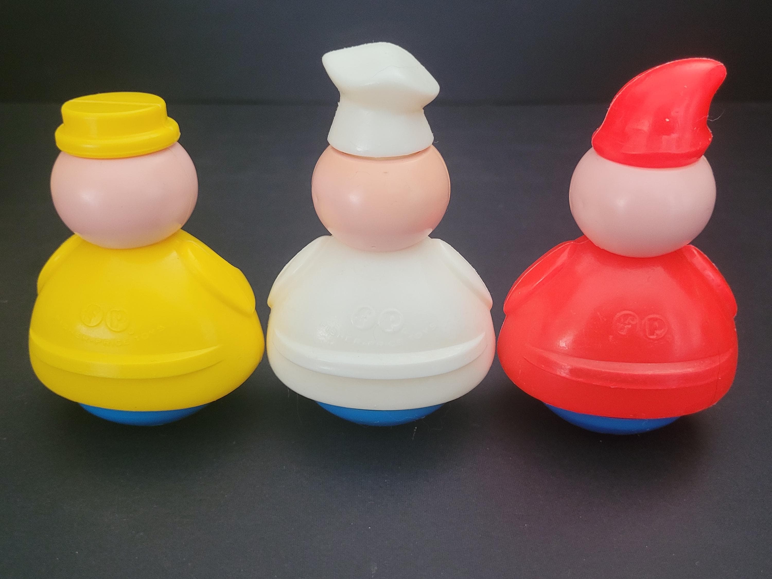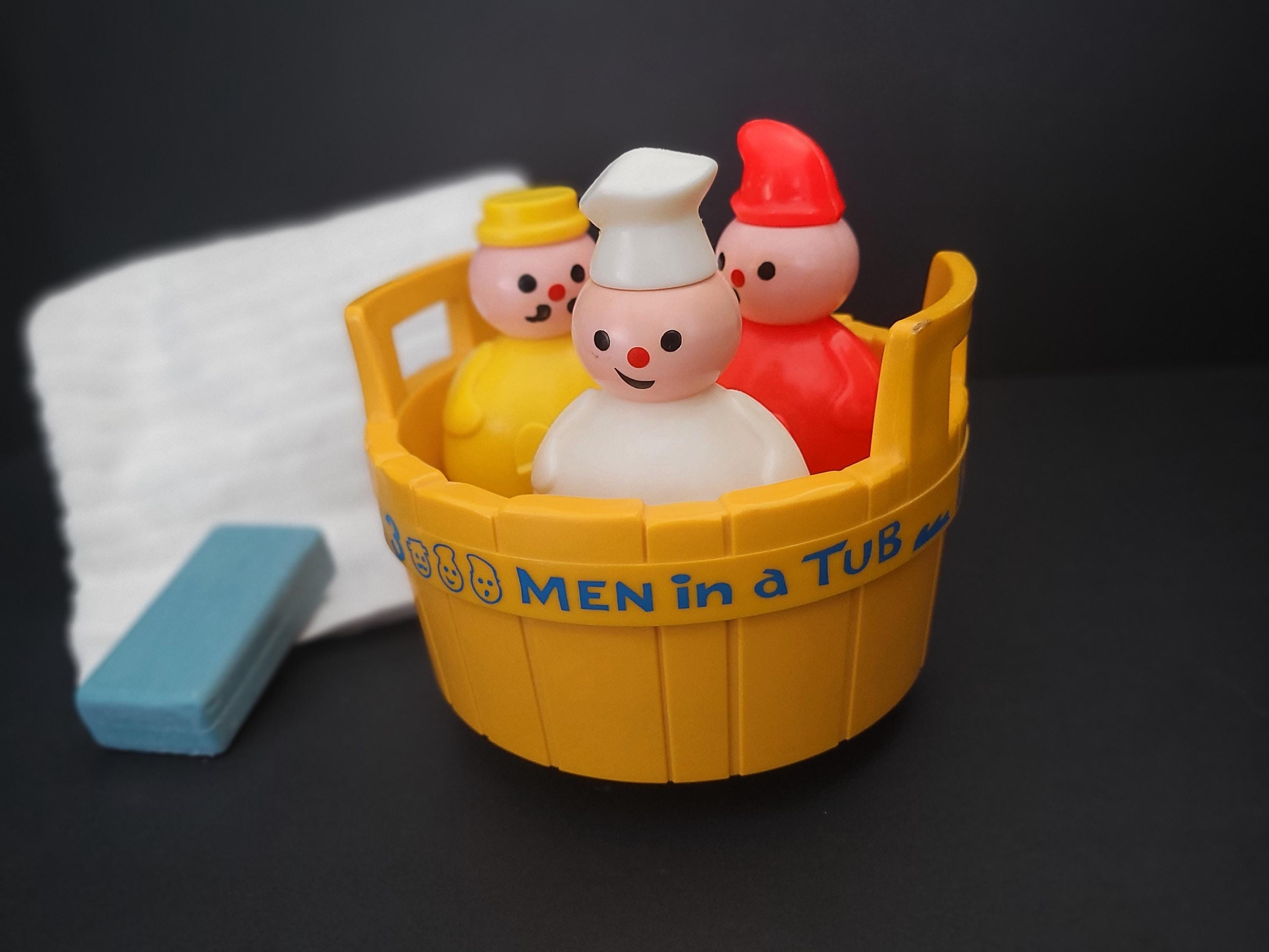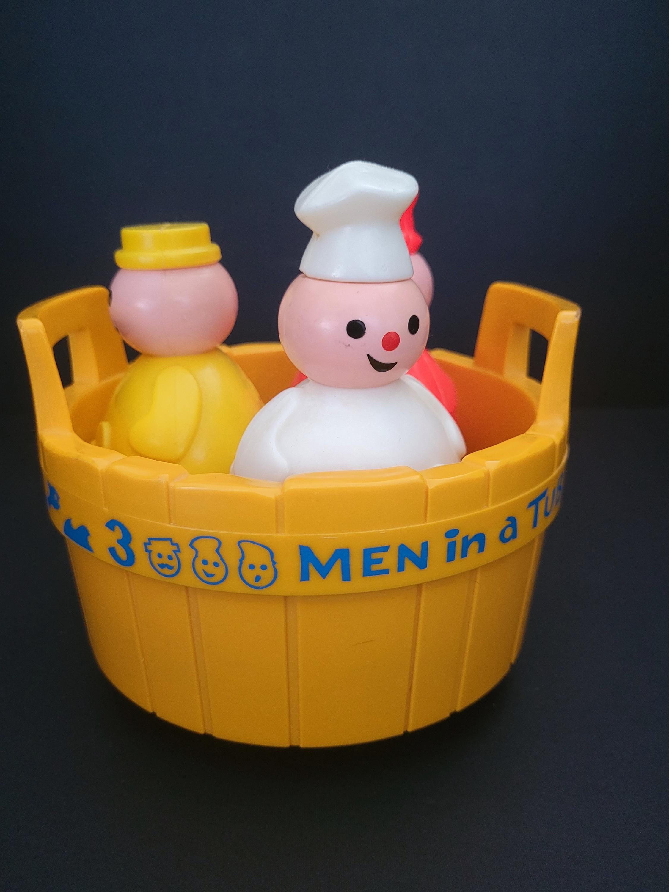 Rub-a-Dub-Dub, Three Men in a Tub! Featured is Fisher Price's #142 classic nursery rhyme themed toddler toy, suitable for bathtub play or dry land adventures! This version was produced between 1976 - 1985 - the only, of three iterations, without a mast - and is in excellent to outstanding condition. Each of the three figures - the butcher, baker, and candlestick maker - have drainage holes in their weighted bases, and the tub is water-tight. Note discoloration/corrosion of bell (see photos). An excellent gift for expectant parents, a special child, or vintage toy collector. You won't be disappointed with this one! Children should be supervised, at all times, when playing in, or near, water. Made in the USA.