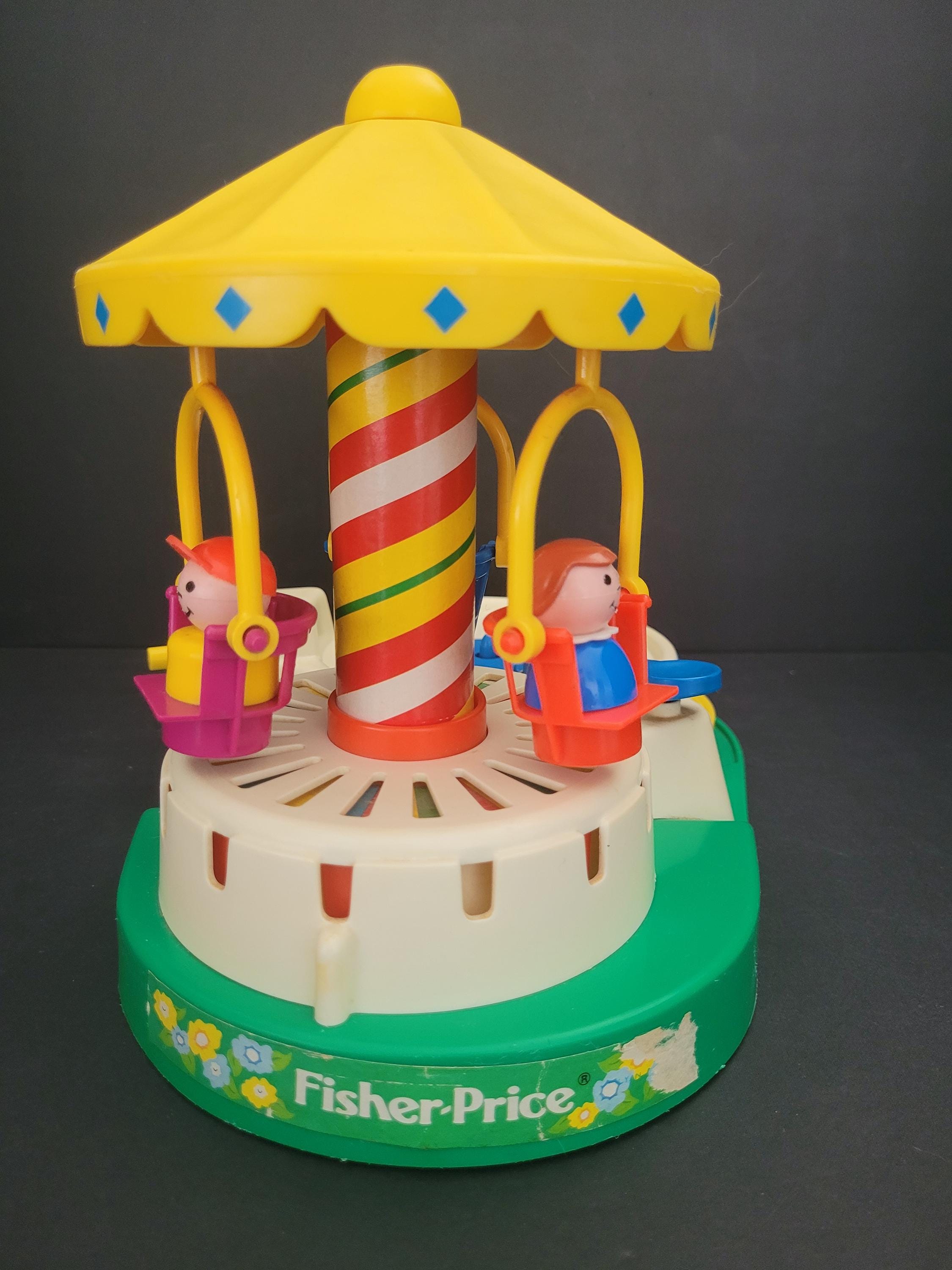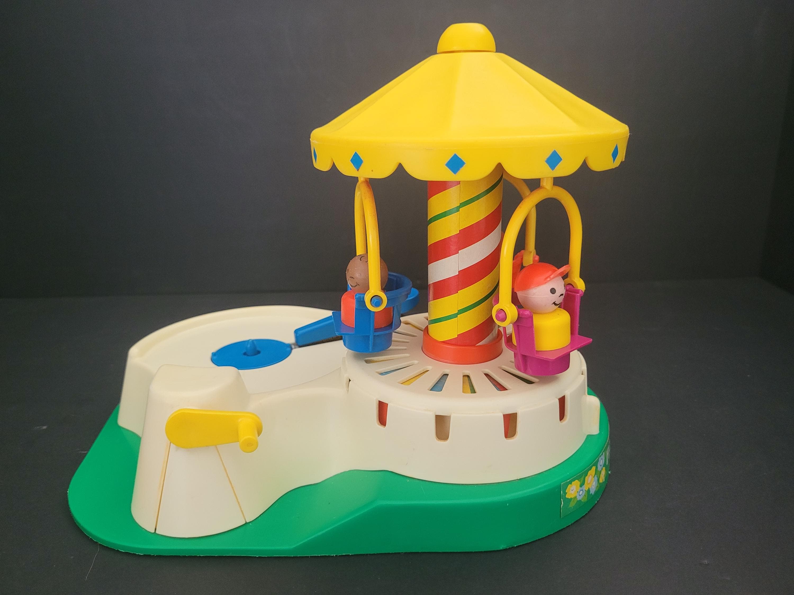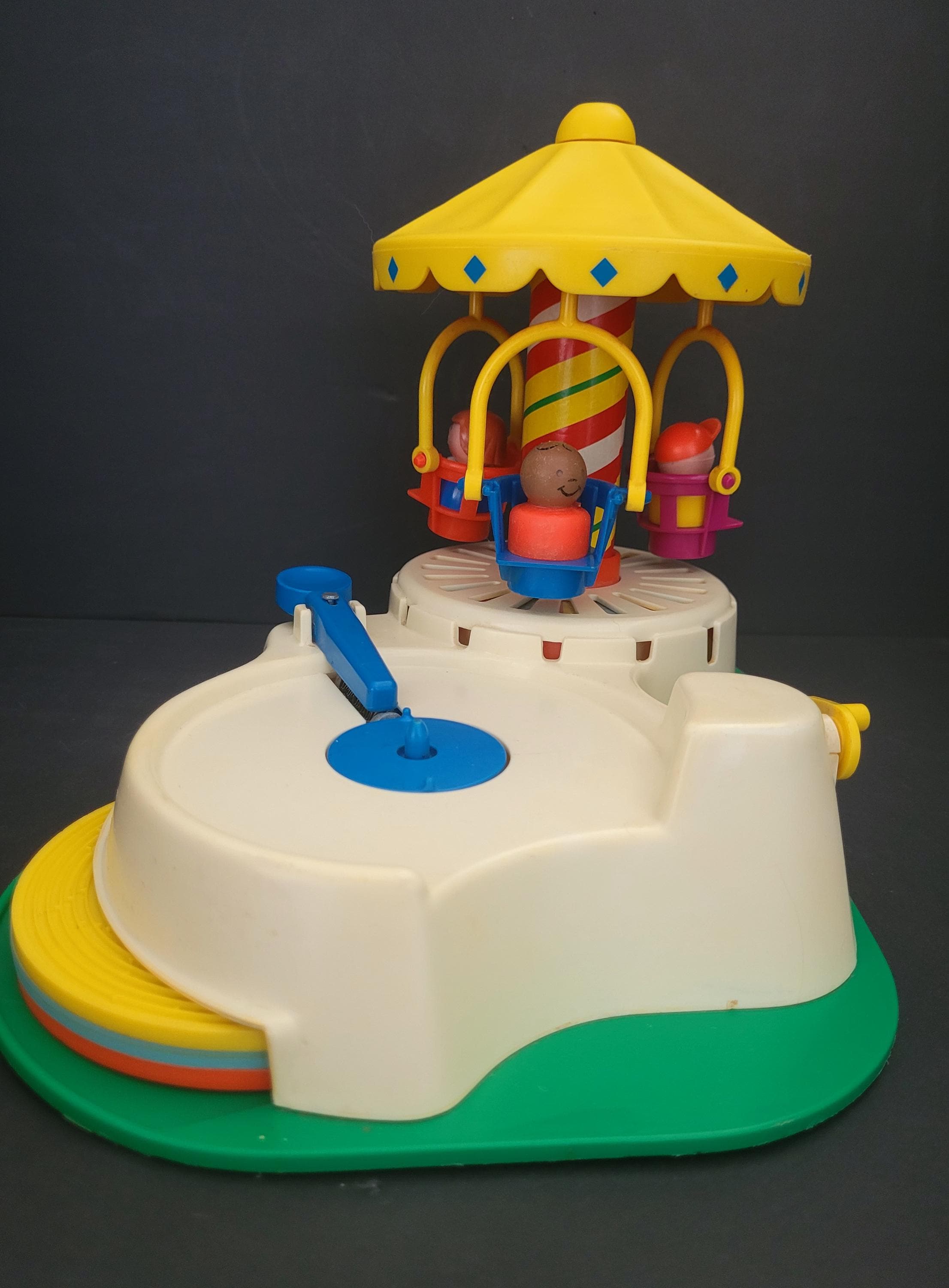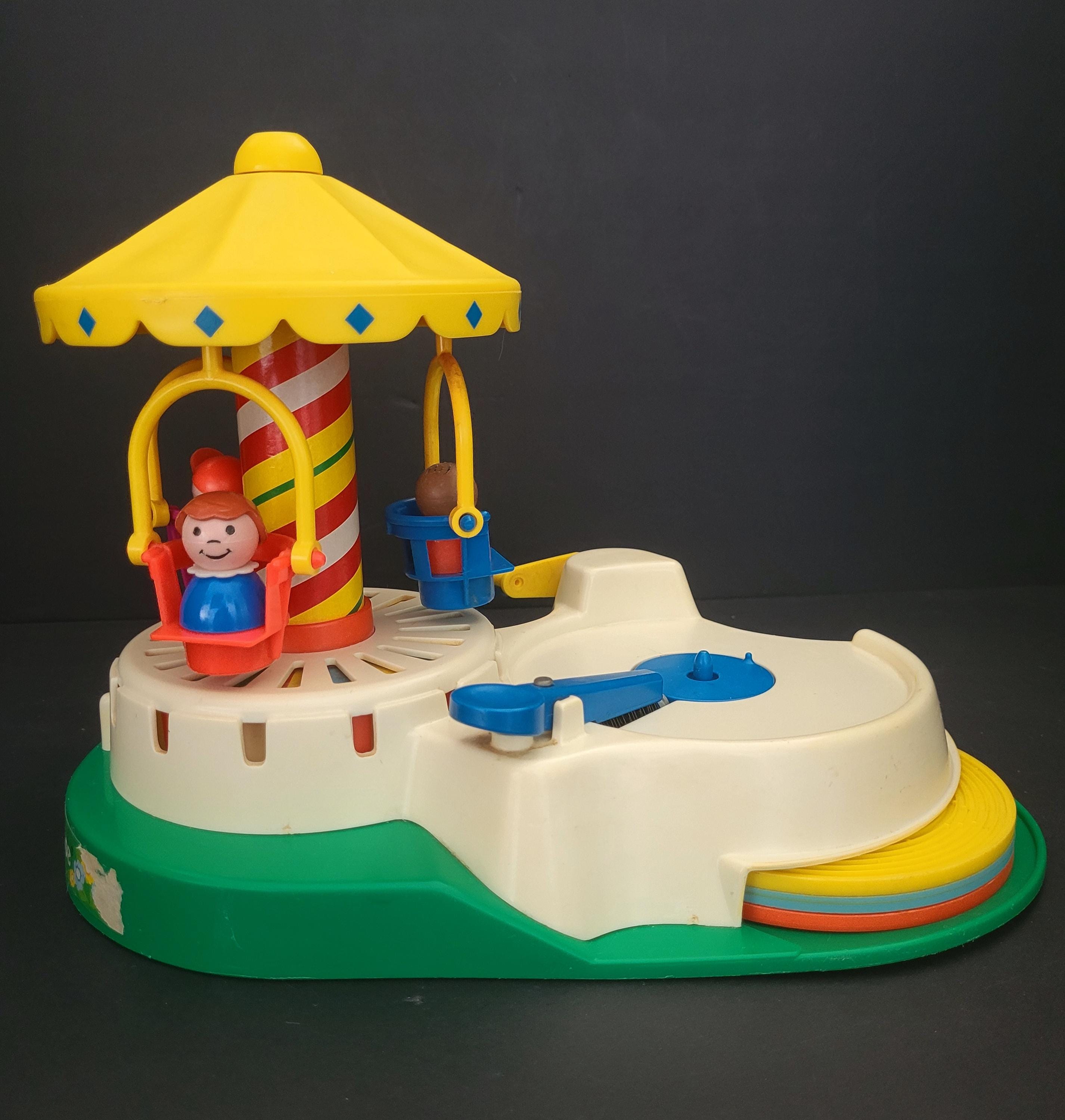A marriage of the 1970's Little People Merry-Go-Round, and the Music Box Record Player, the Change-a-Tune Carousel # 170, produced from 1981 - 1983, features a hand-crank record player, three interchangeable records (six songs), a three-seat swinging carousel, and three figures. Please note that while the music box mechanism is in working order, it IS a little slow/wonky: I believe some of the teeth may be slightly out of alignment. Please take a few moments to carefully examine the photos provided, noting some damage to lithograph. Adult supervision recommended for play by small children due to potential choking hazard. Made in USA.