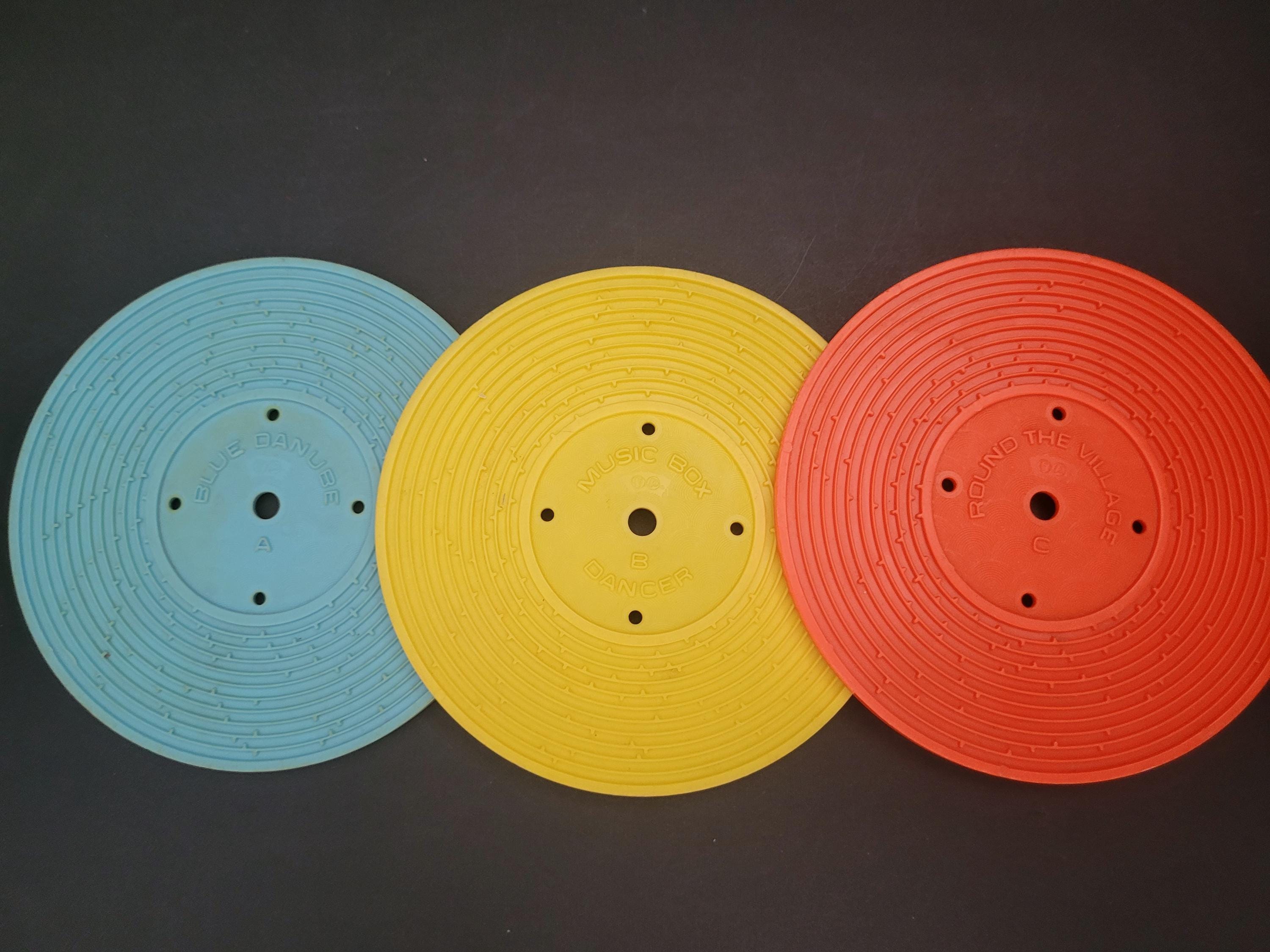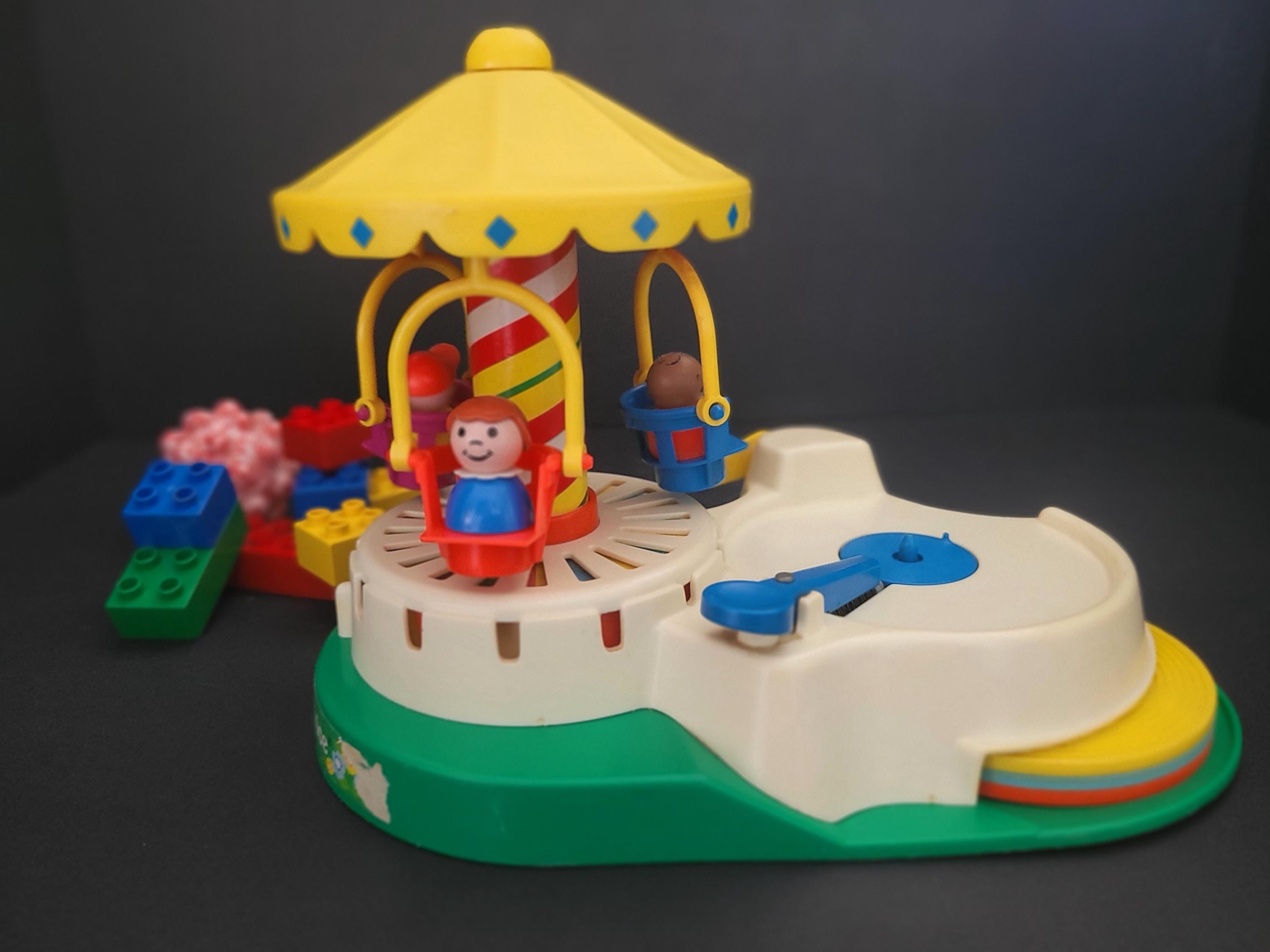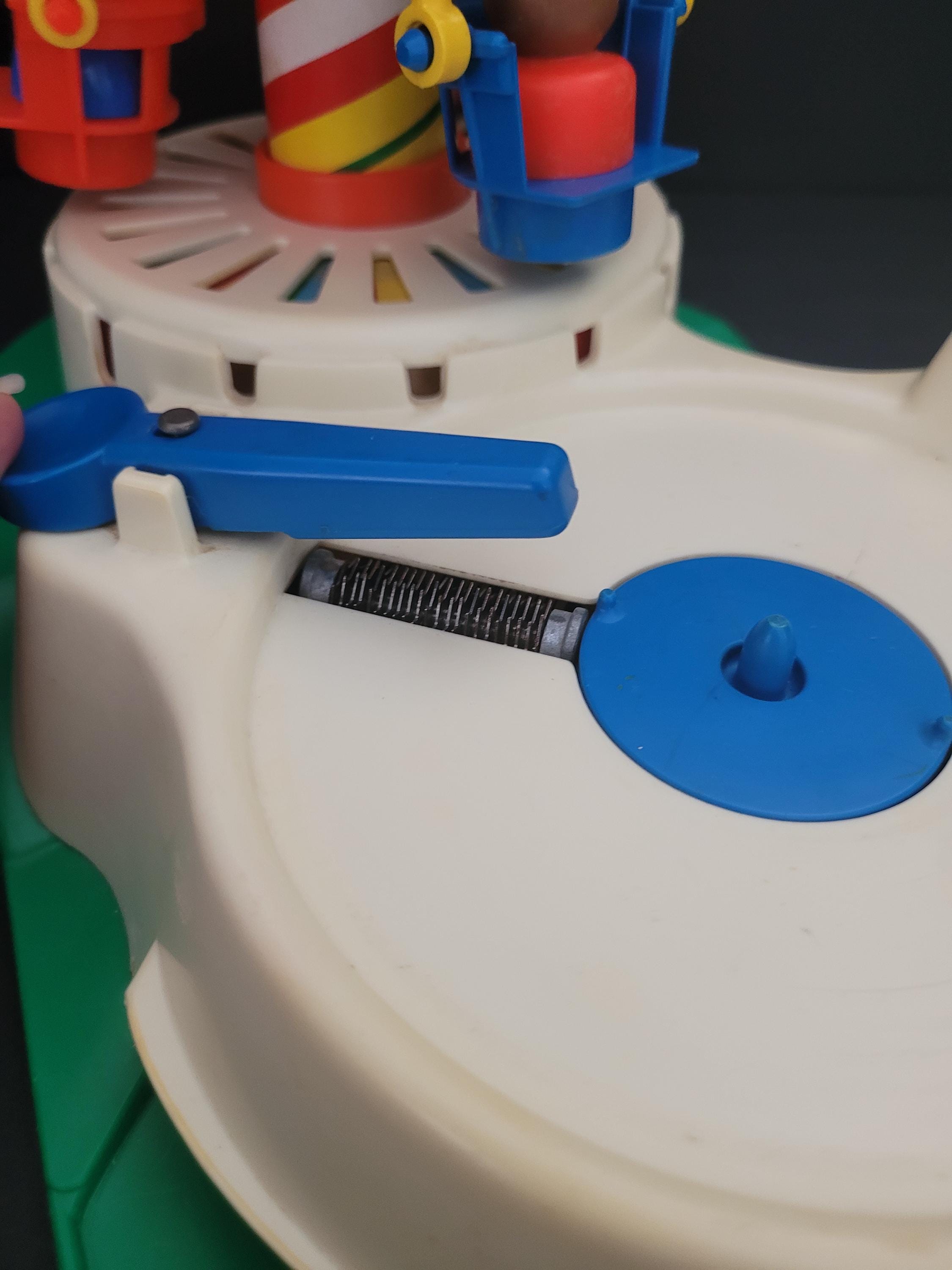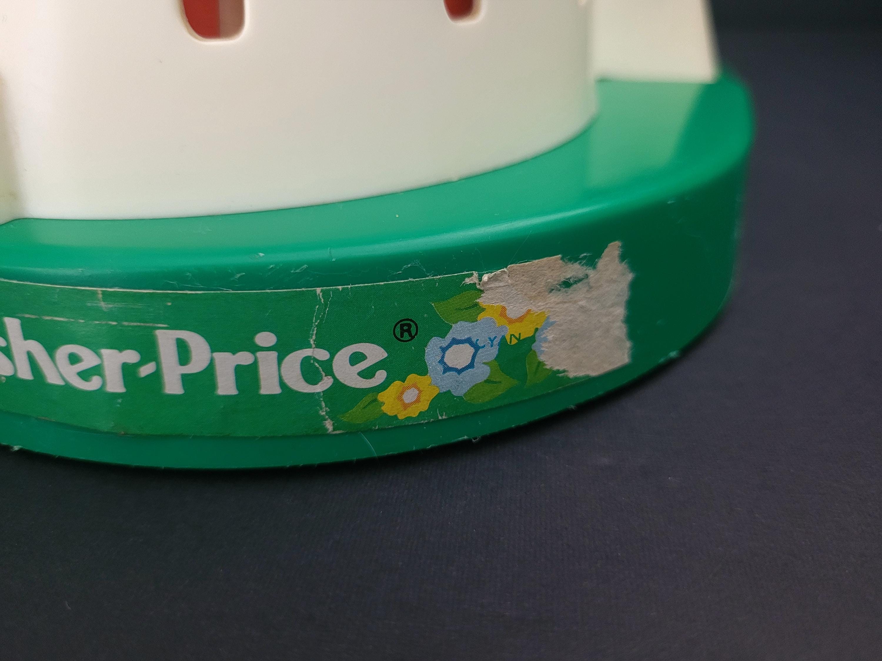 A marriage of the 1970's Little People Merry-Go-Round, and the Music Box Record Player, the Change-a-Tune Carousel # 170, produced from 1981 - 1983, features a hand-crank record player, three interchangeable records (six songs), a three-seat swinging carousel, and three figures. Please note that while the music box mechanism is in working order, it IS a little slow/wonky: I believe some of the teeth may be slightly out of alignment. Please take a few moments to carefully examine the photos provided, noting some damage to lithograph. Adult supervision recommended for play by small children due to potential choking hazard. Made in USA.