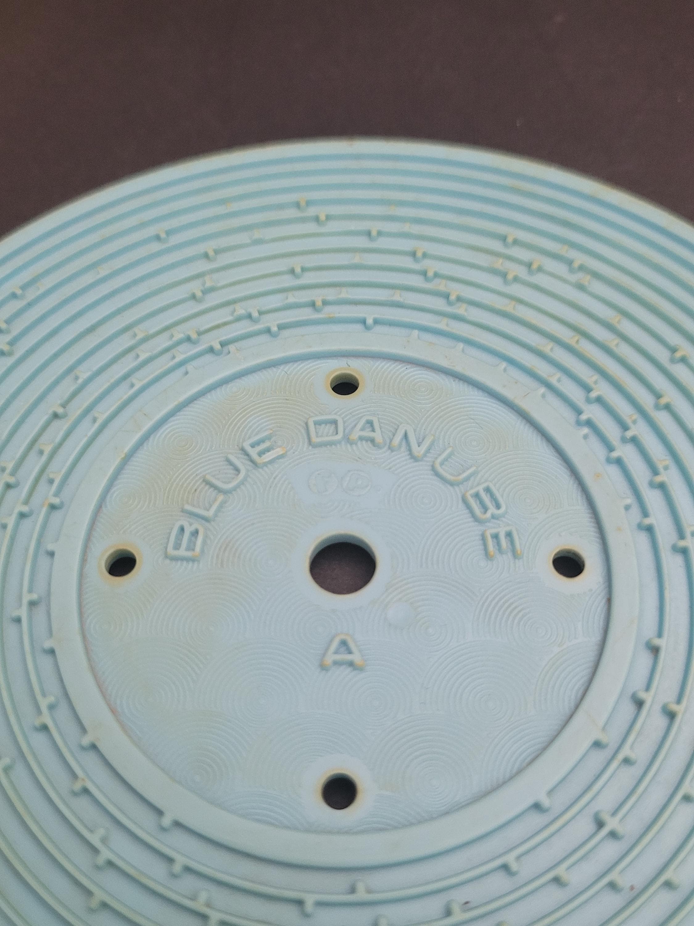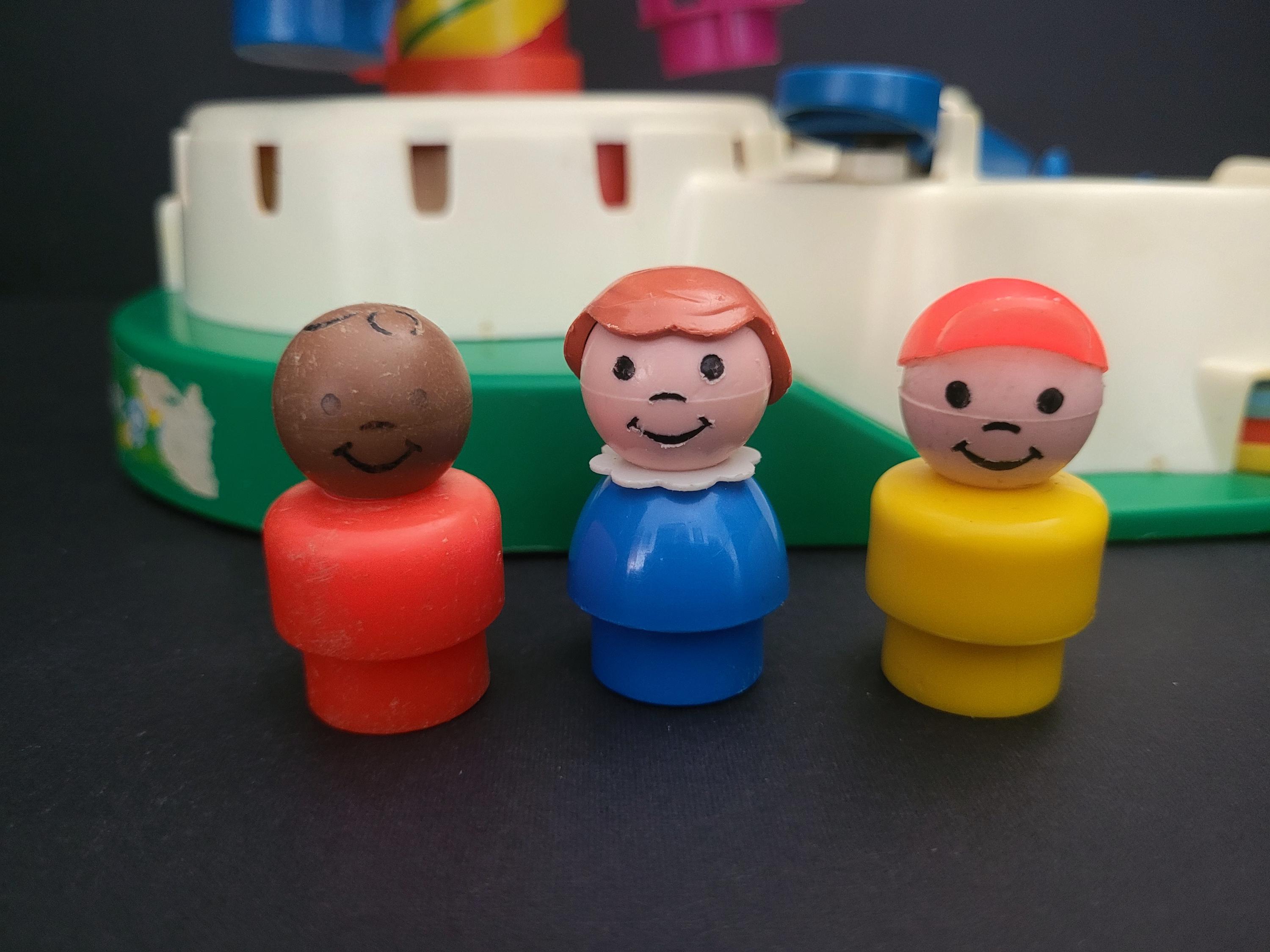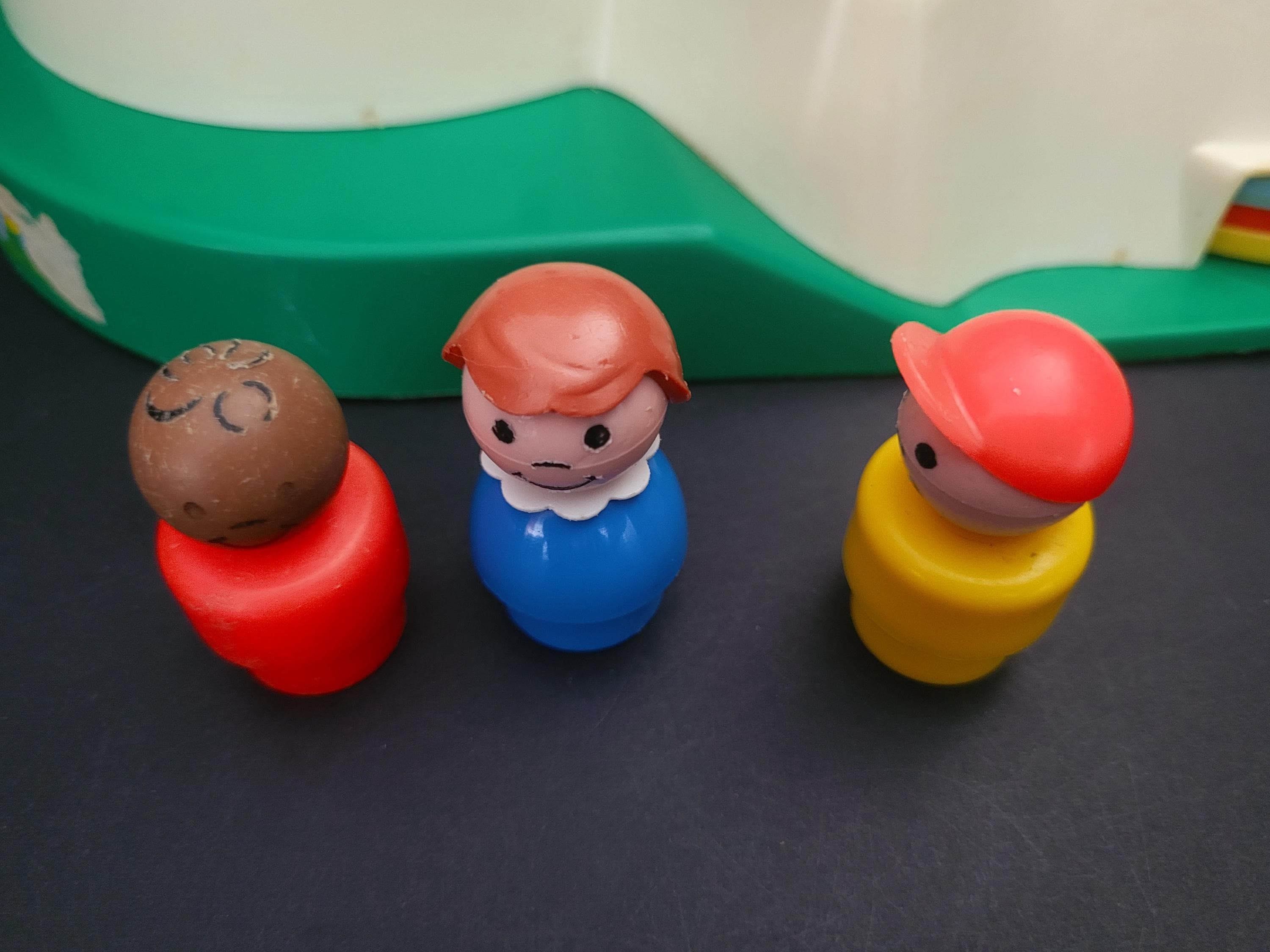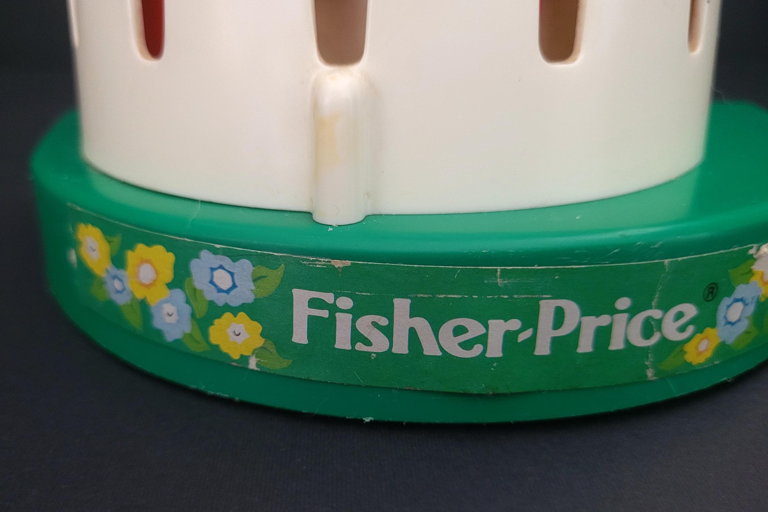 A marriage of the 1970's Little People Merry-Go-Round, and the Music Box Record Player, the Change-a-Tune Carousel # 170, produced from 1981 - 1983, features a hand-crank record player, three interchangeable records (six songs), a three-seat swinging carousel, and three figures. Please note that while the music box mechanism is in working order, it IS a little slow/wonky: I believe some of the teeth may be slightly out of alignment. Please take a few moments to carefully examine the photos provided, noting some damage to lithograph. Adult supervision recommended for play by small children due to potential choking hazard. Made in USA.