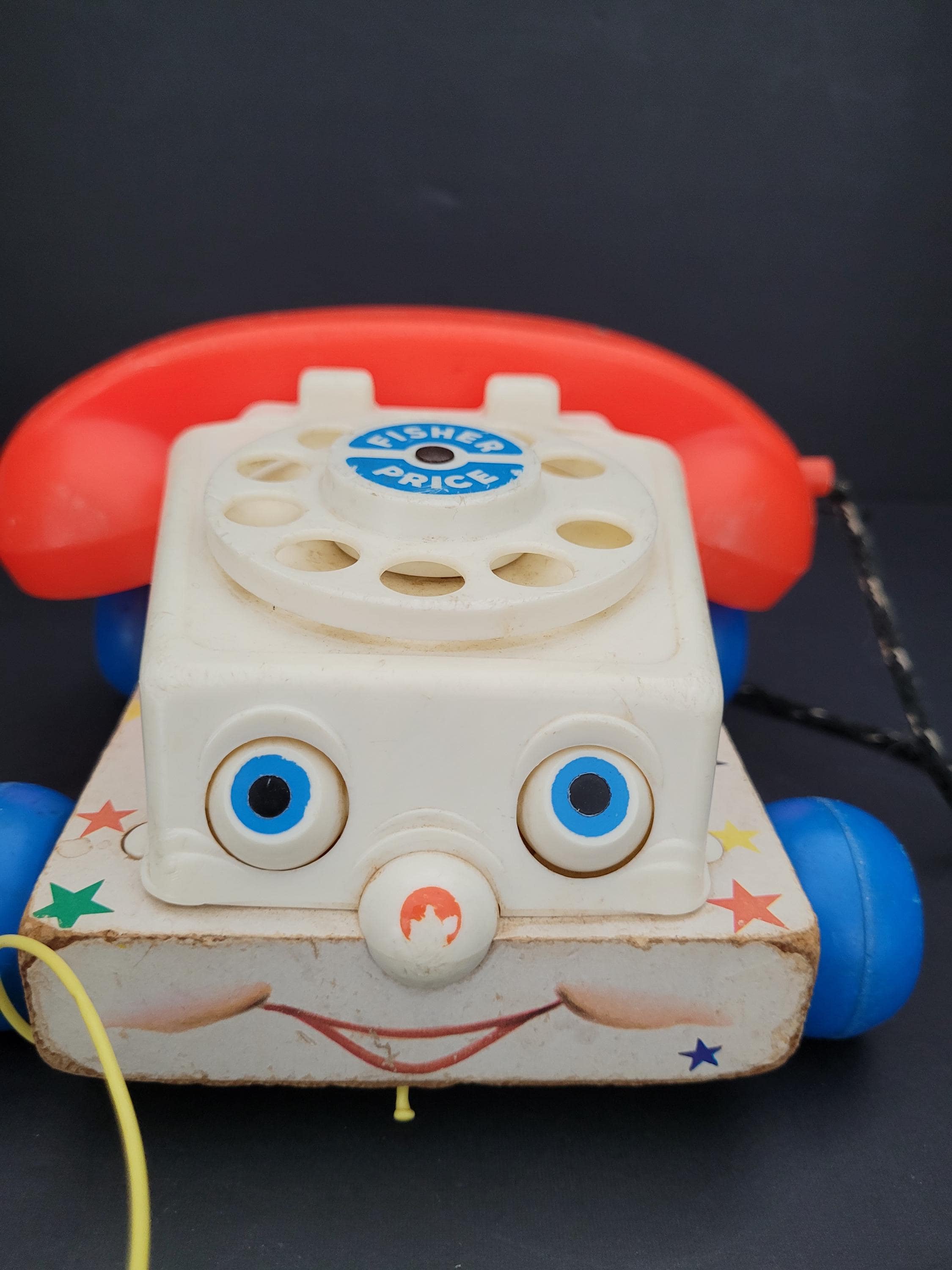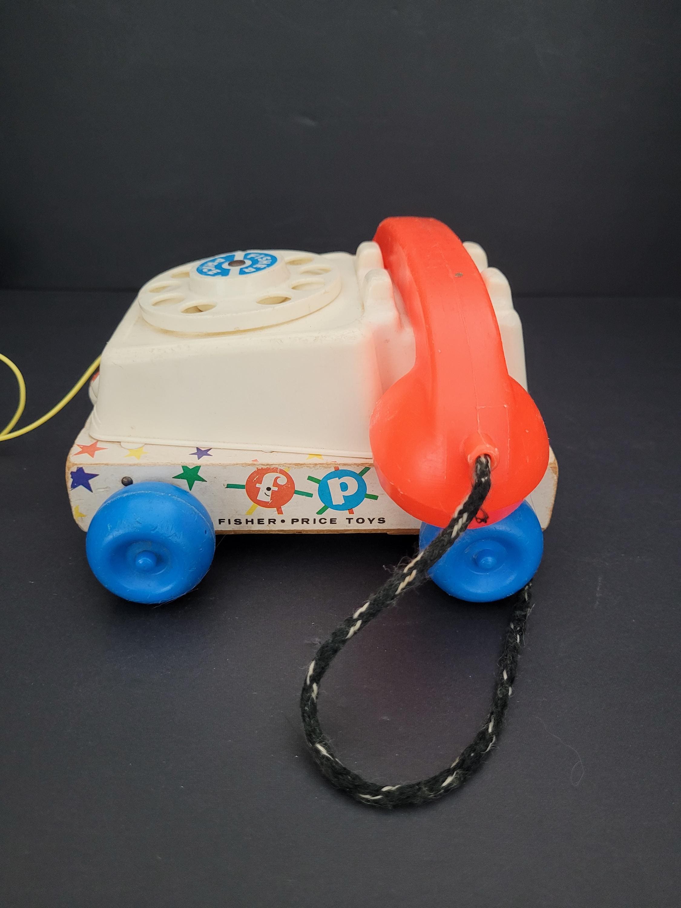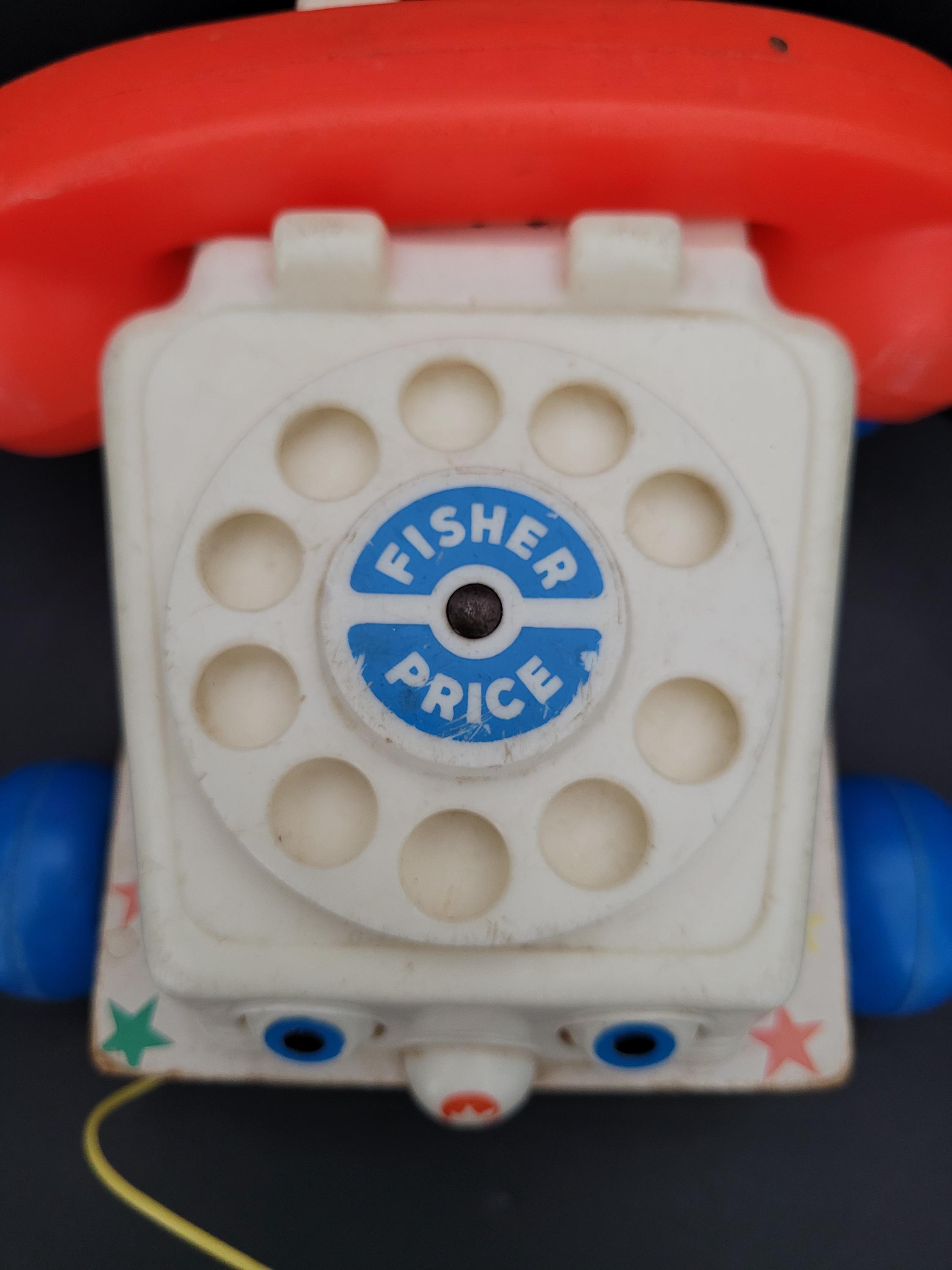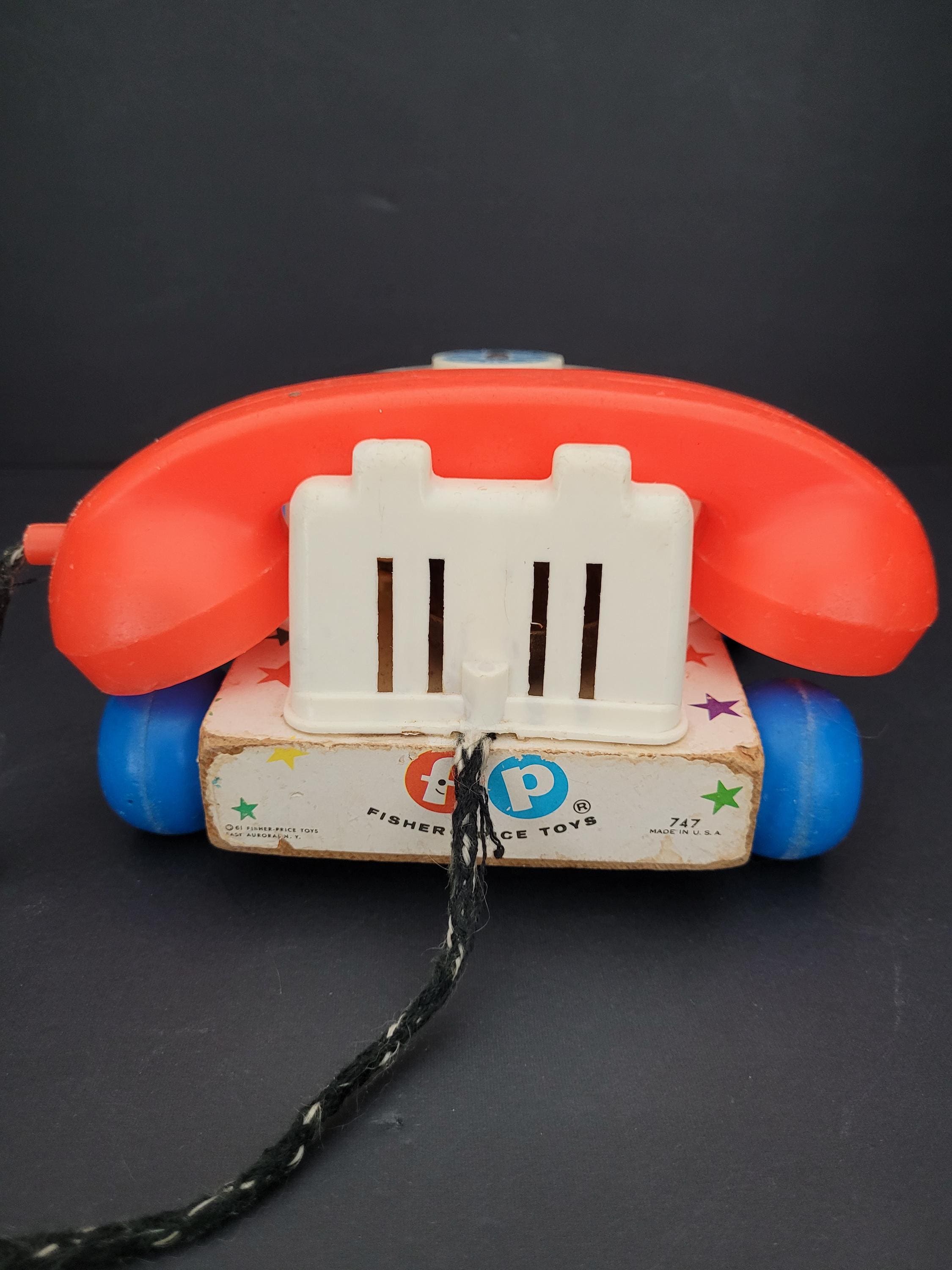 Still a classic, over 60 years after it was introduced, Fisher Price's Chatter Telephone # 747. Obviously well loved, this piece shows it's age, but still has countless hours of play to offer! Of note: the dial decal is missing; lithograph edges are quite worn; some fraying of the fabric chord. Please take a careful look at all of the photos provided. Children should be supervised during play as pull string and phone chord pose risk. Made in USA.