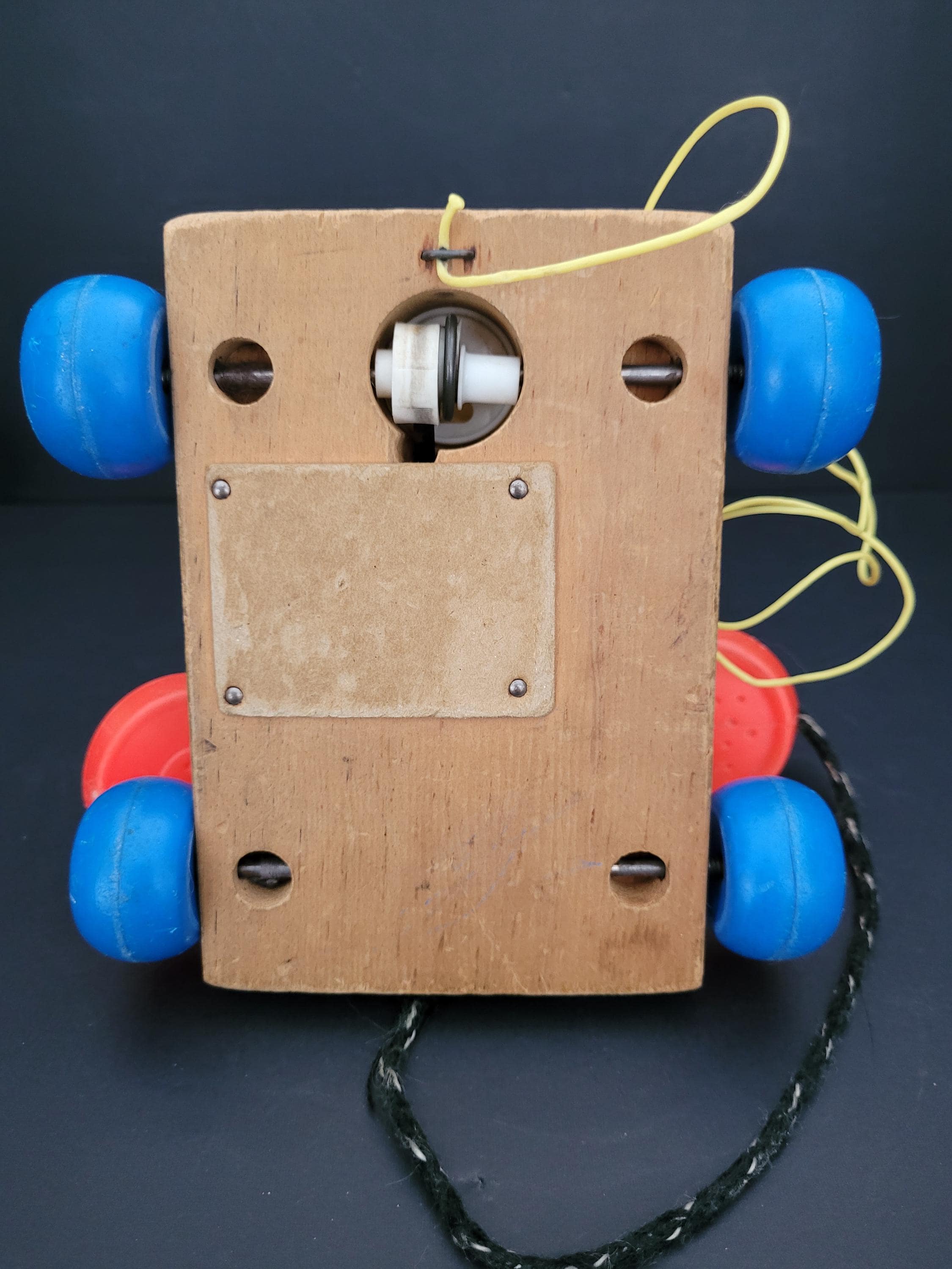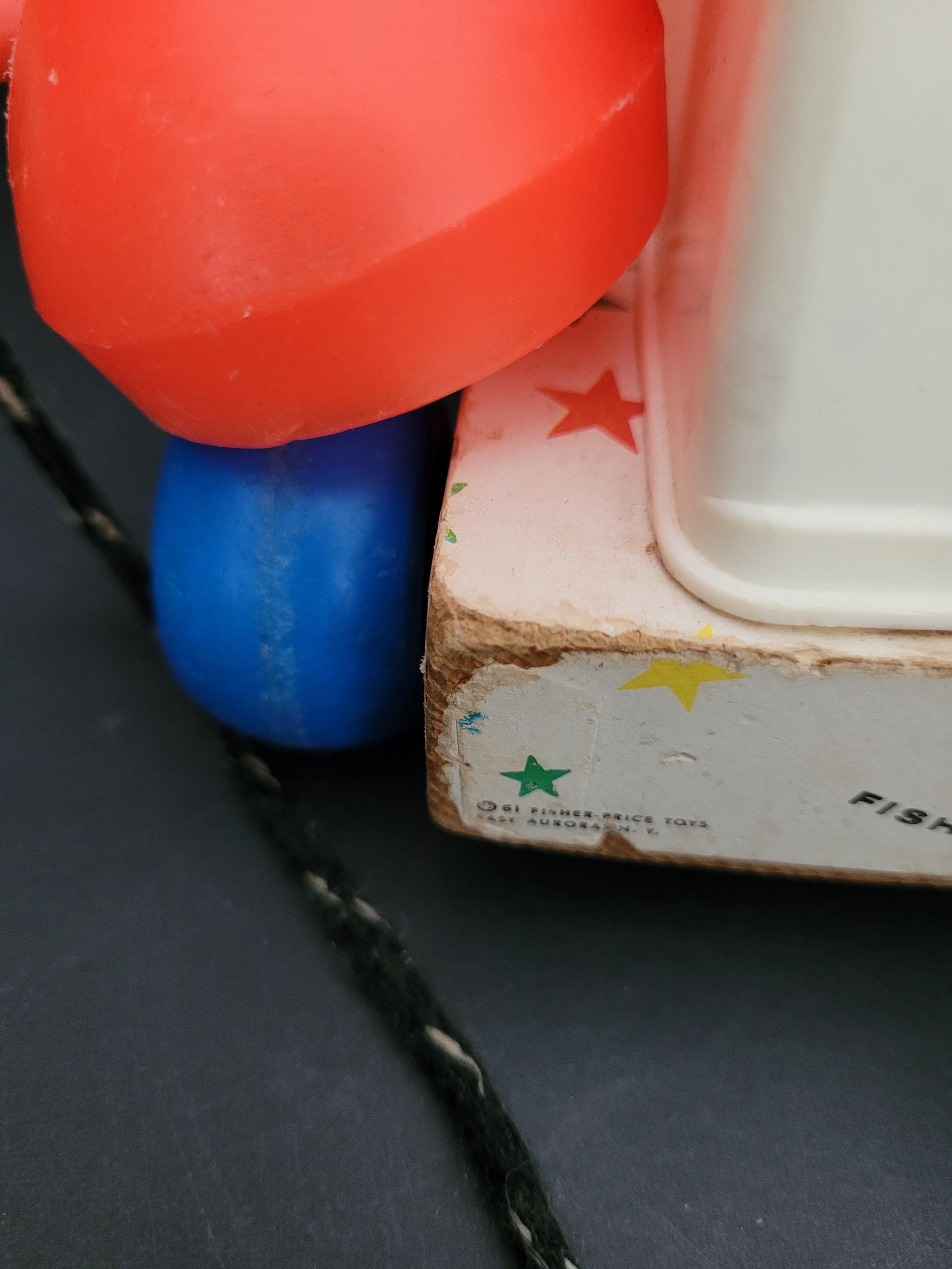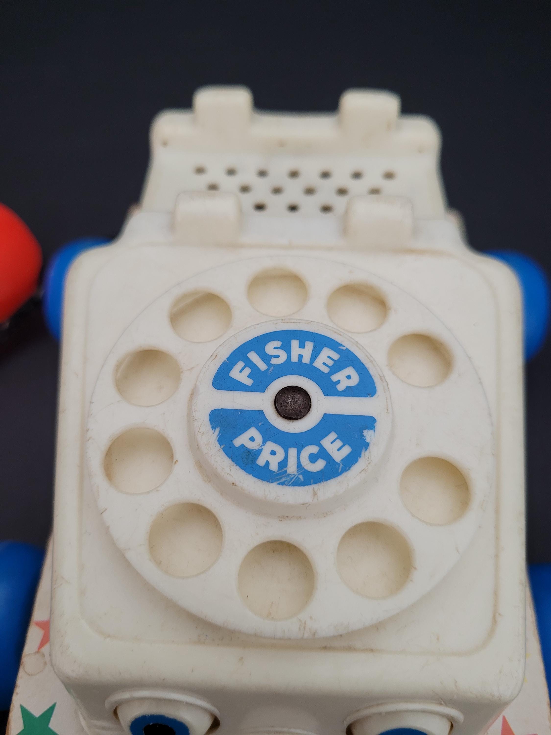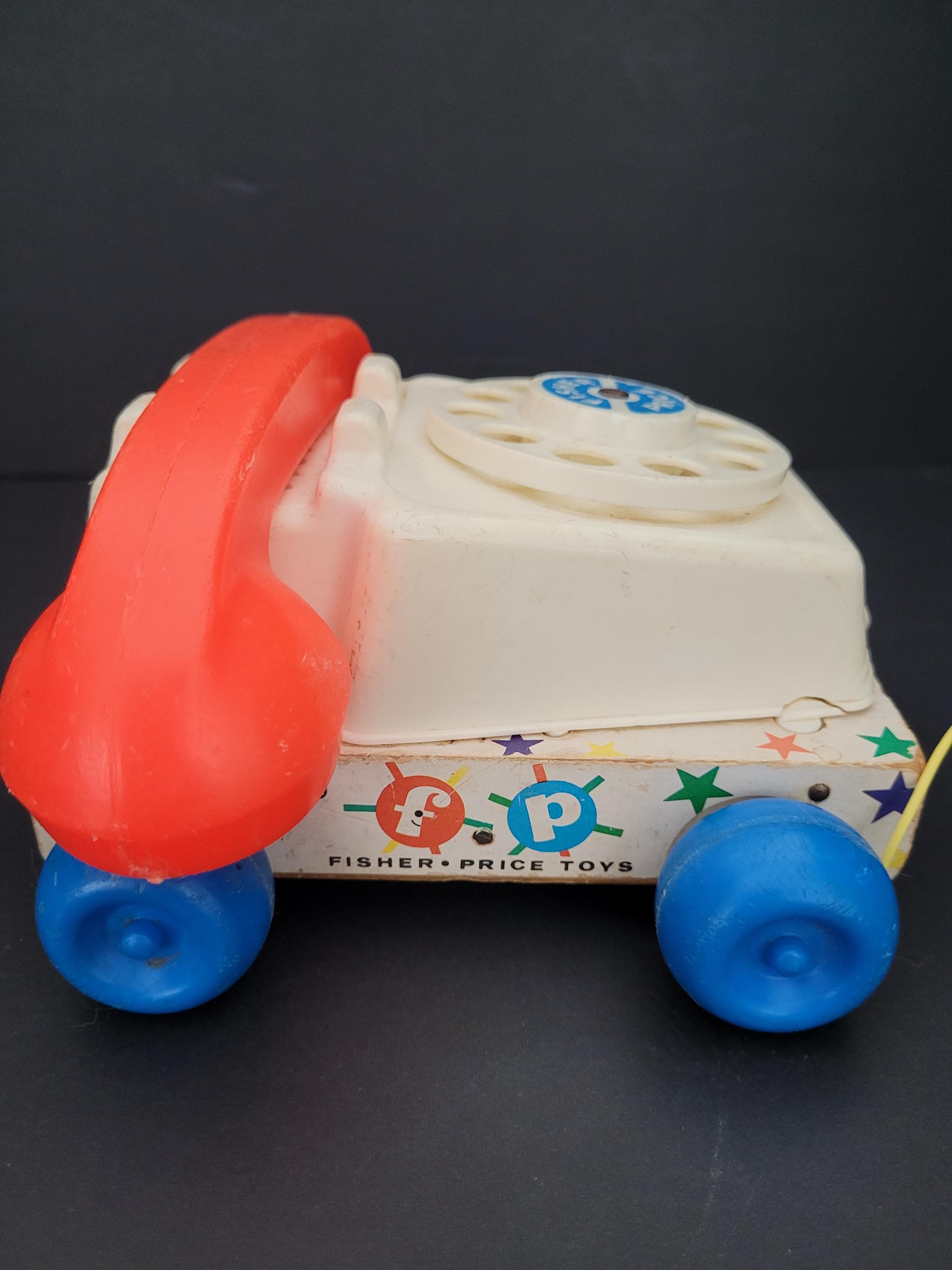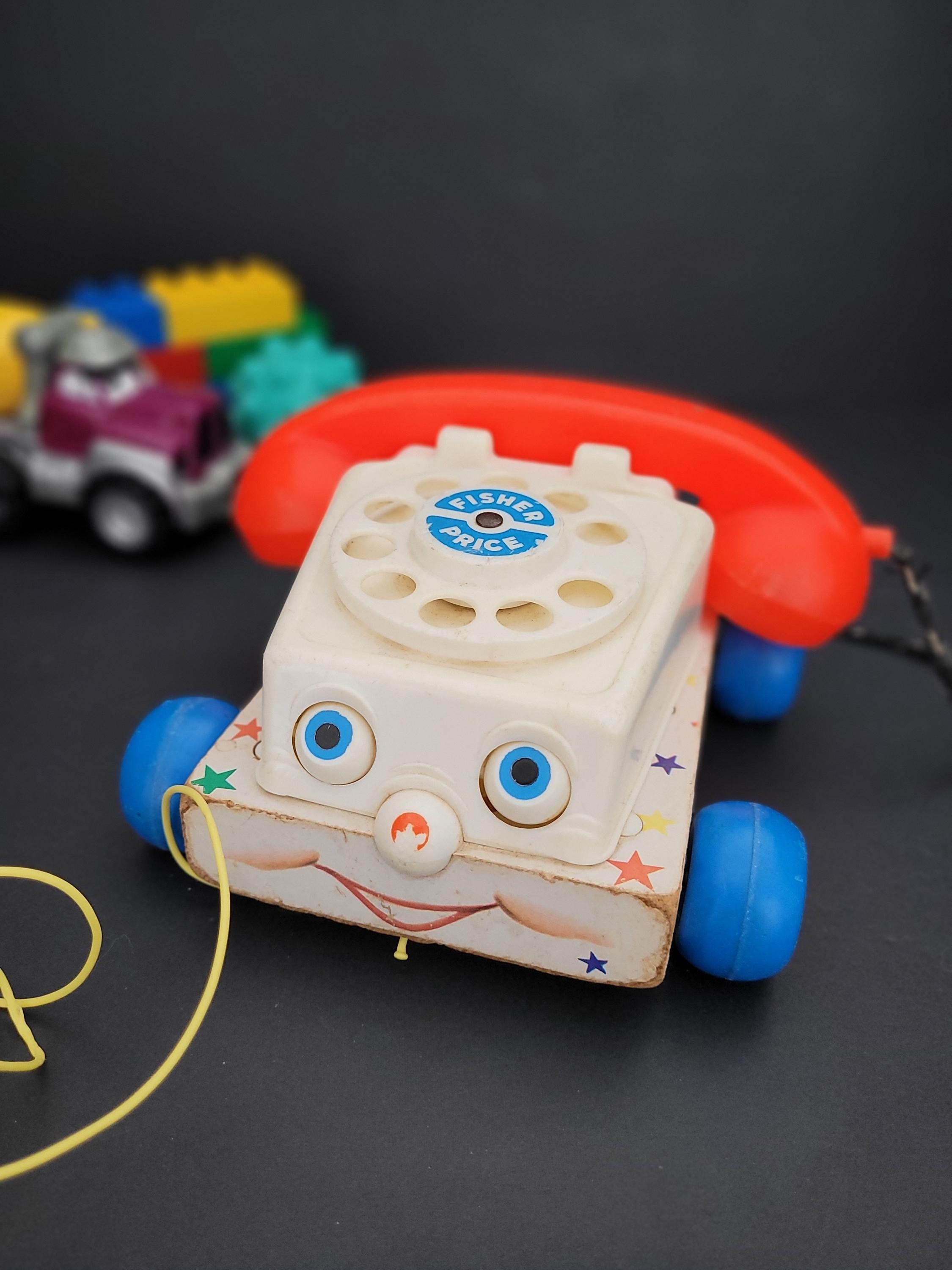 Still a classic, over 60 years after it was introduced, Fisher Price's Chatter Telephone # 747. Obviously well loved, this piece shows it's age, but still has countless hours of play to offer! Of note: the dial decal is missing; lithograph edges are quite worn; some fraying of the fabric chord. Please take a careful look at all of the photos provided. Children should be supervised during play as pull string and phone chord pose risk. Made in USA.