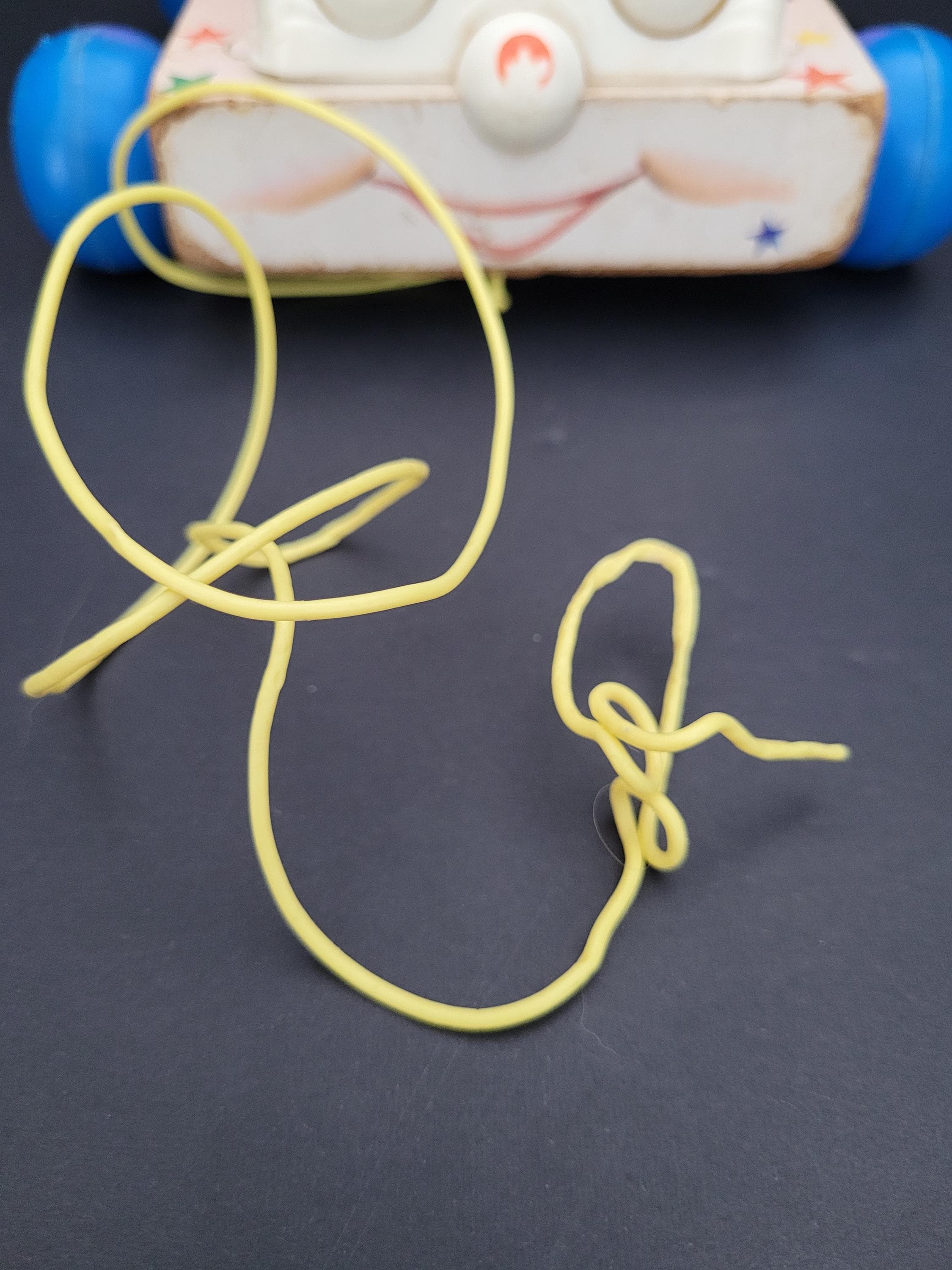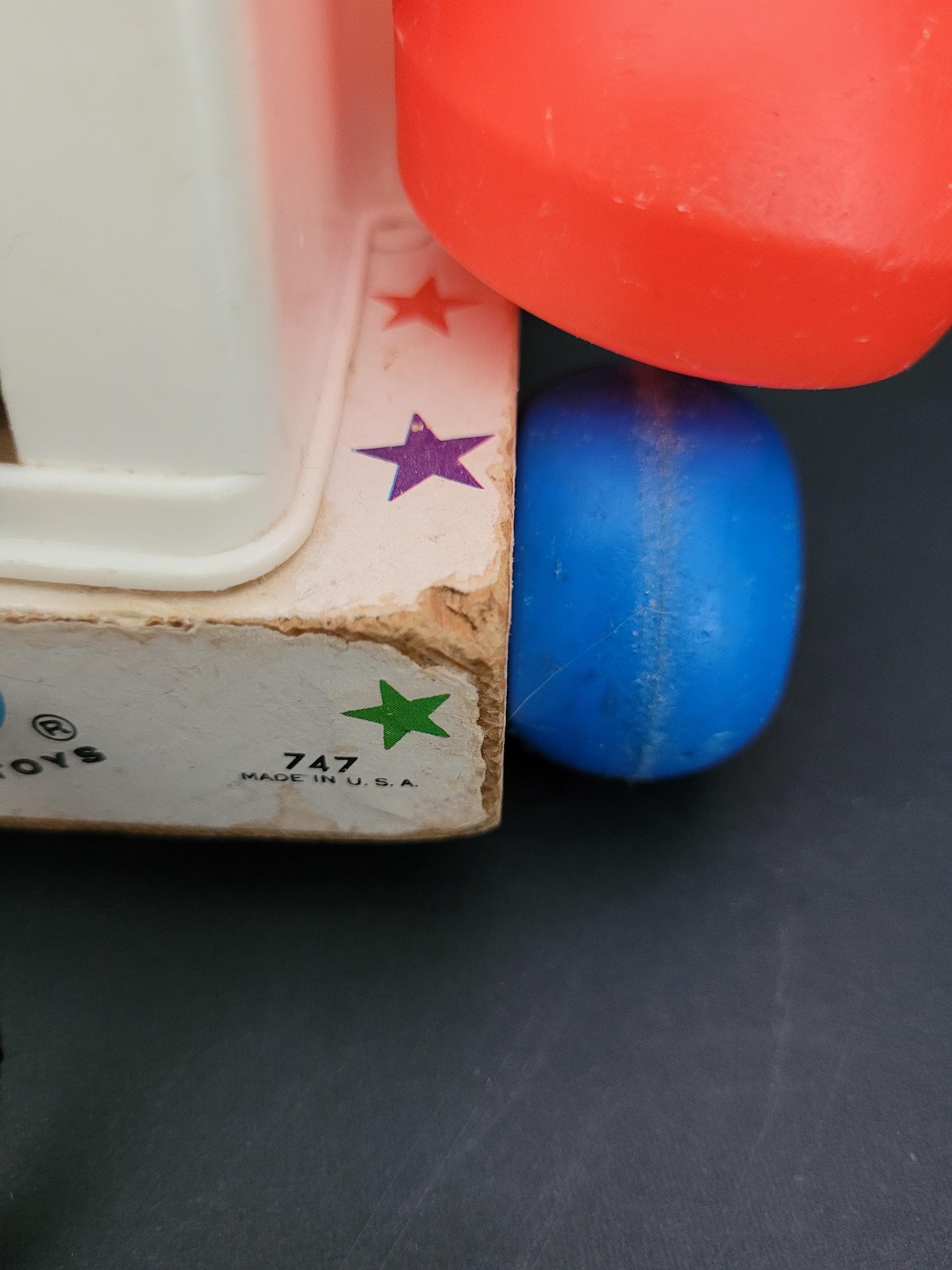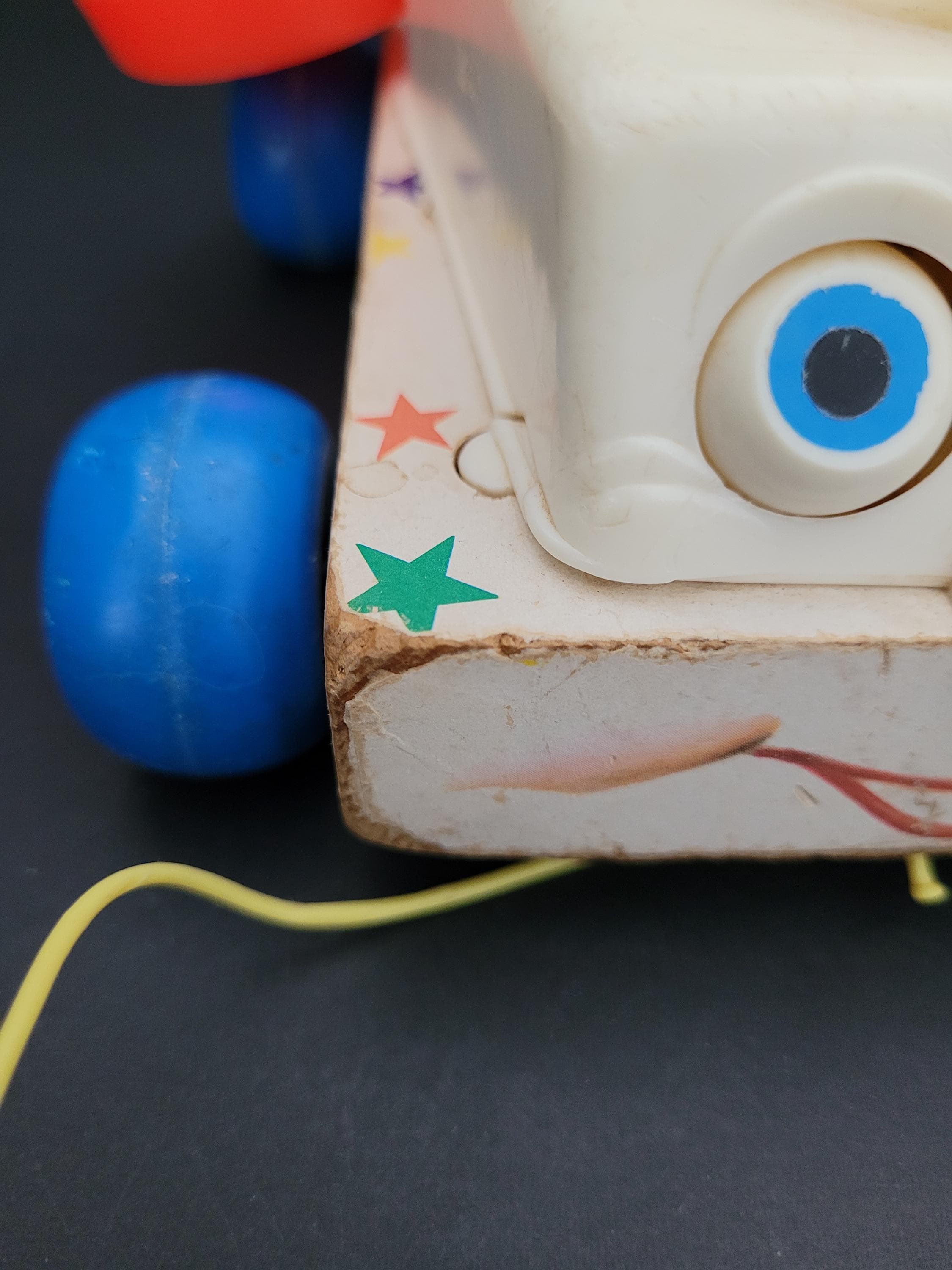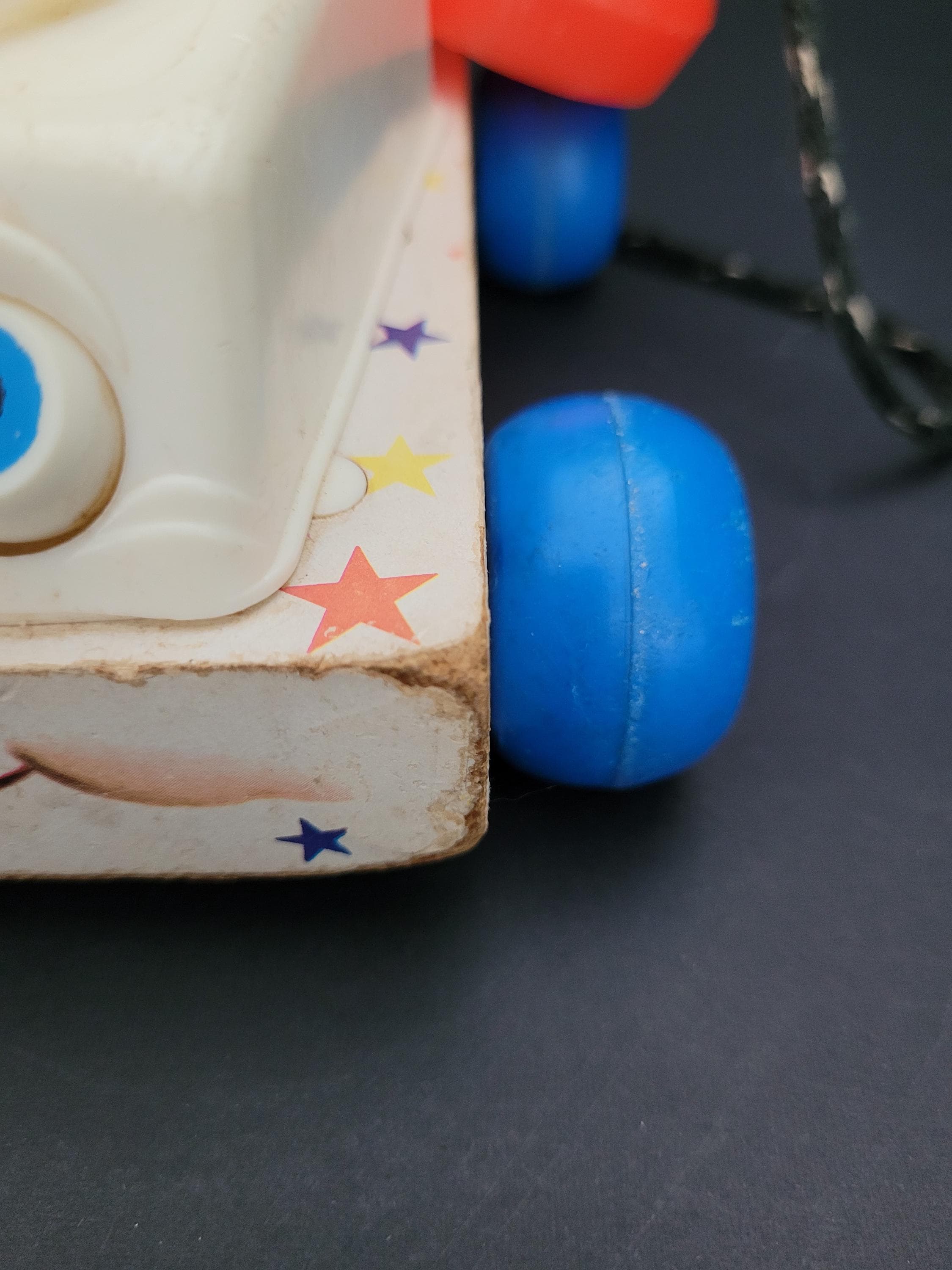 Still a classic, over 60 years after it was introduced, Fisher Price's Chatter Telephone # 747. Obviously well loved, this piece shows it's age, but still has countless hours of play to offer! Of note: the dial decal is missing; lithograph edges are quite worn; some fraying of the fabric chord. Please take a careful look at all of the photos provided. Children should be supervised during play as pull string and phone chord pose risk. Made in USA.