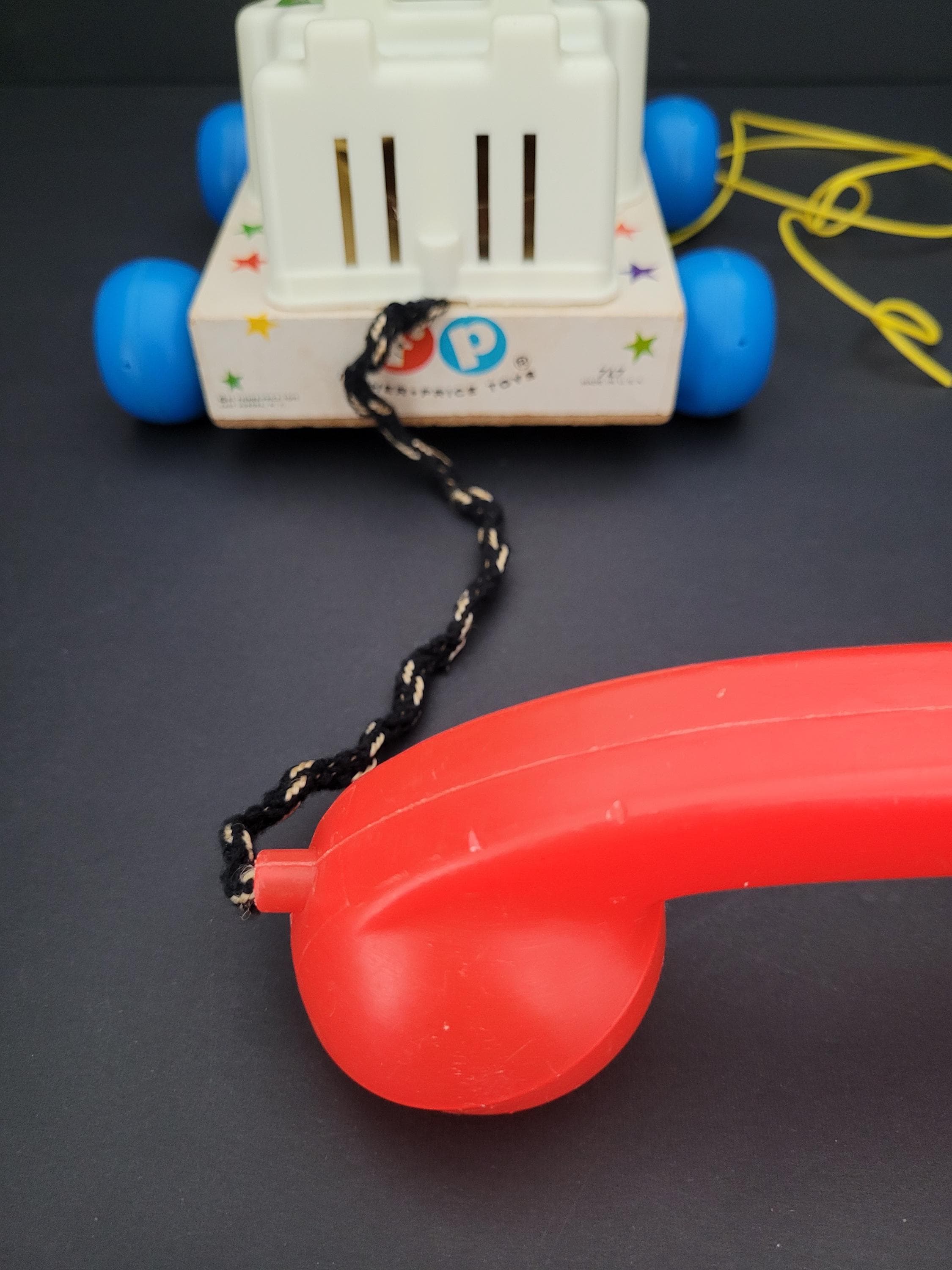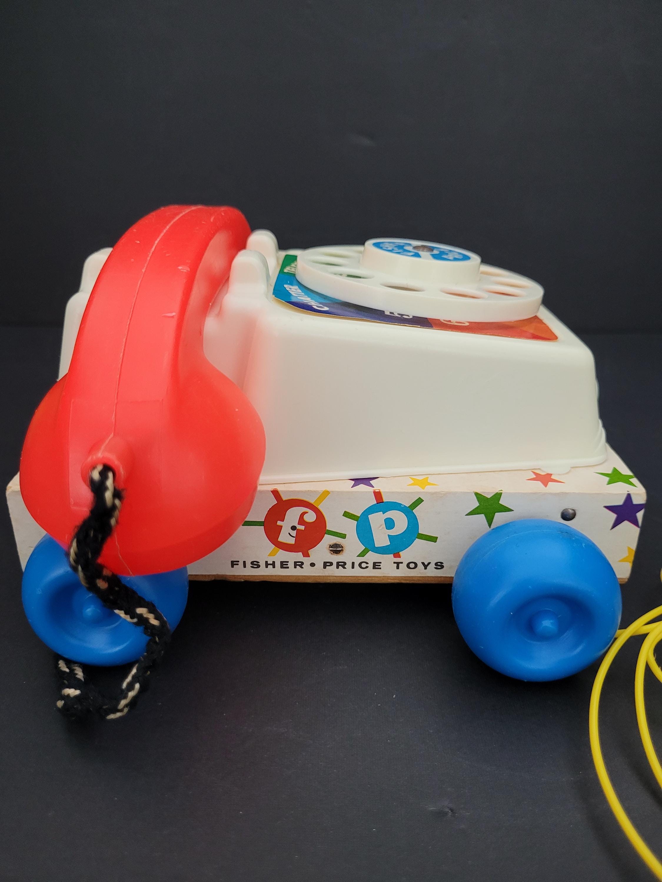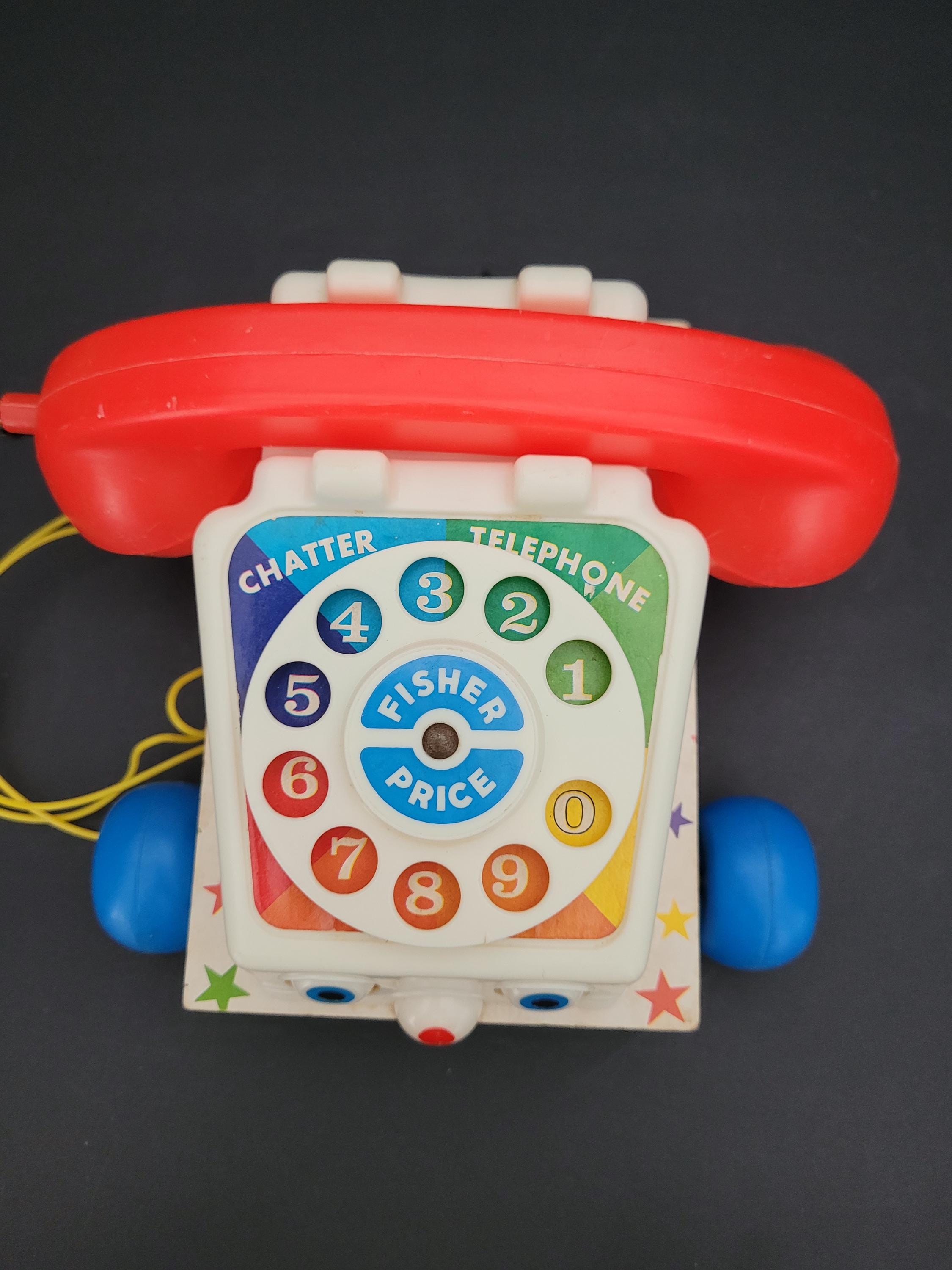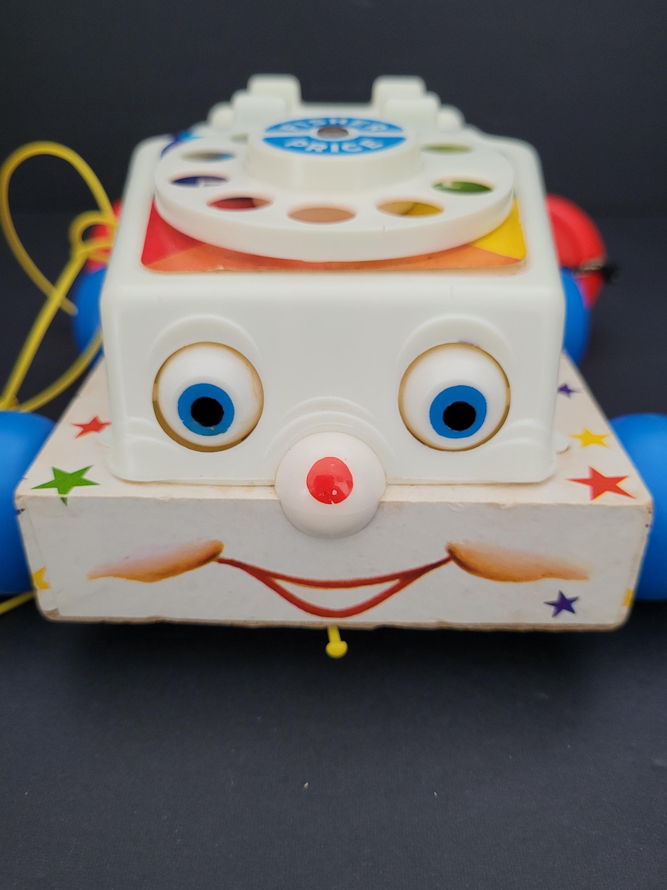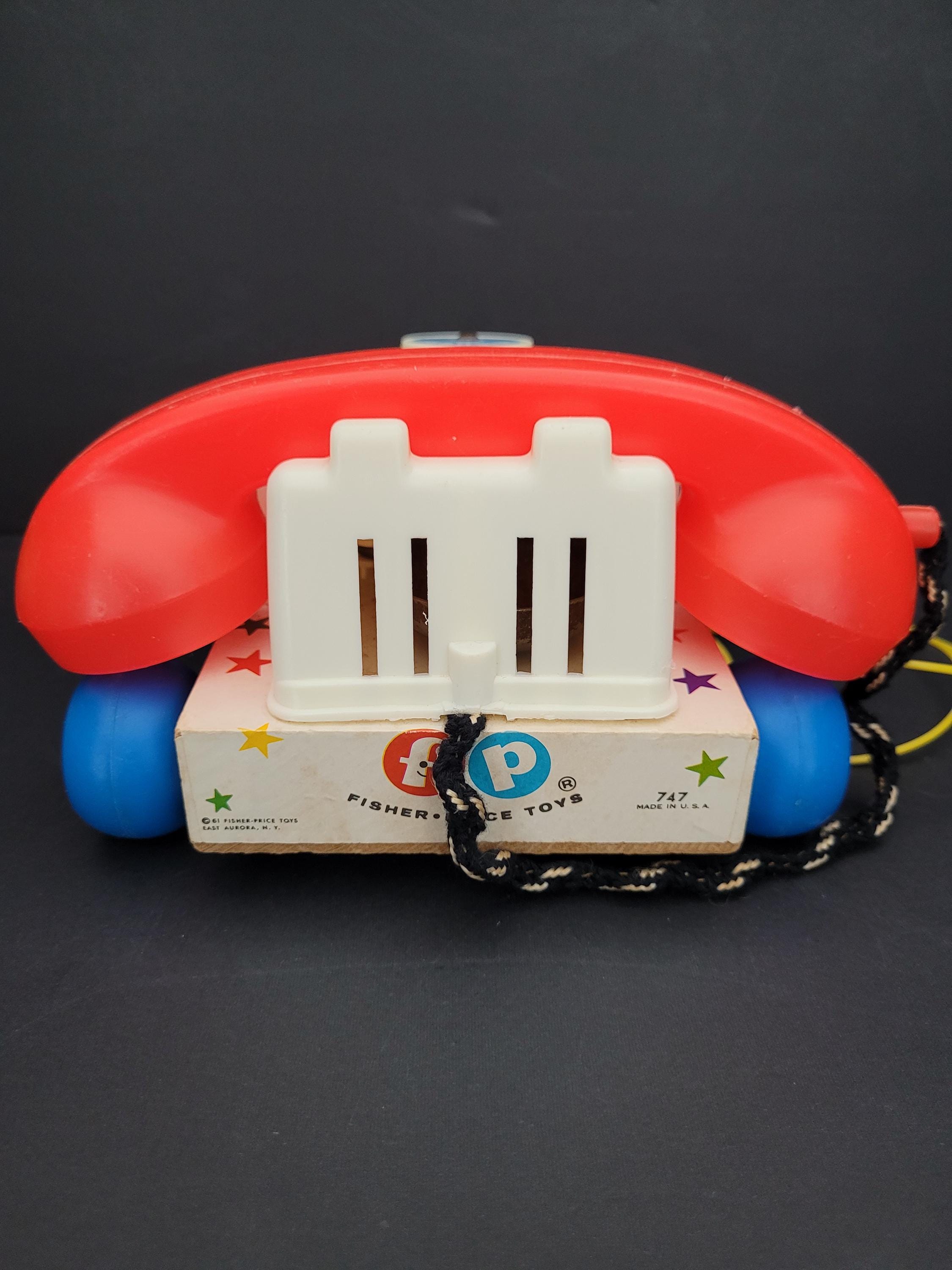 WOW! This Fisher Price #747 Chatter Telephone is in outstanding condition for it's age - were it not for two tiny marks, and very minor foxing on rear lithograph, I would say "pristine" or "un-played with". Produced from 1967 - 1985, this example would be from earlier in that time frame based on the rear lithograph information. Visible "flaws" include a teeny tiny white mark on the nose, and a 2mm or 2/16" white mark under the dial lithograph's "o". The original fabric cord is unfrayed, and the plastic pull string, unknotted. Truly a fabulous exemplar of this classic toy - perfect for the collector's shelf! Please note young children should be supervised during play due to the potential safety hazard of both the pull string, and phone cord. Made in the USA.