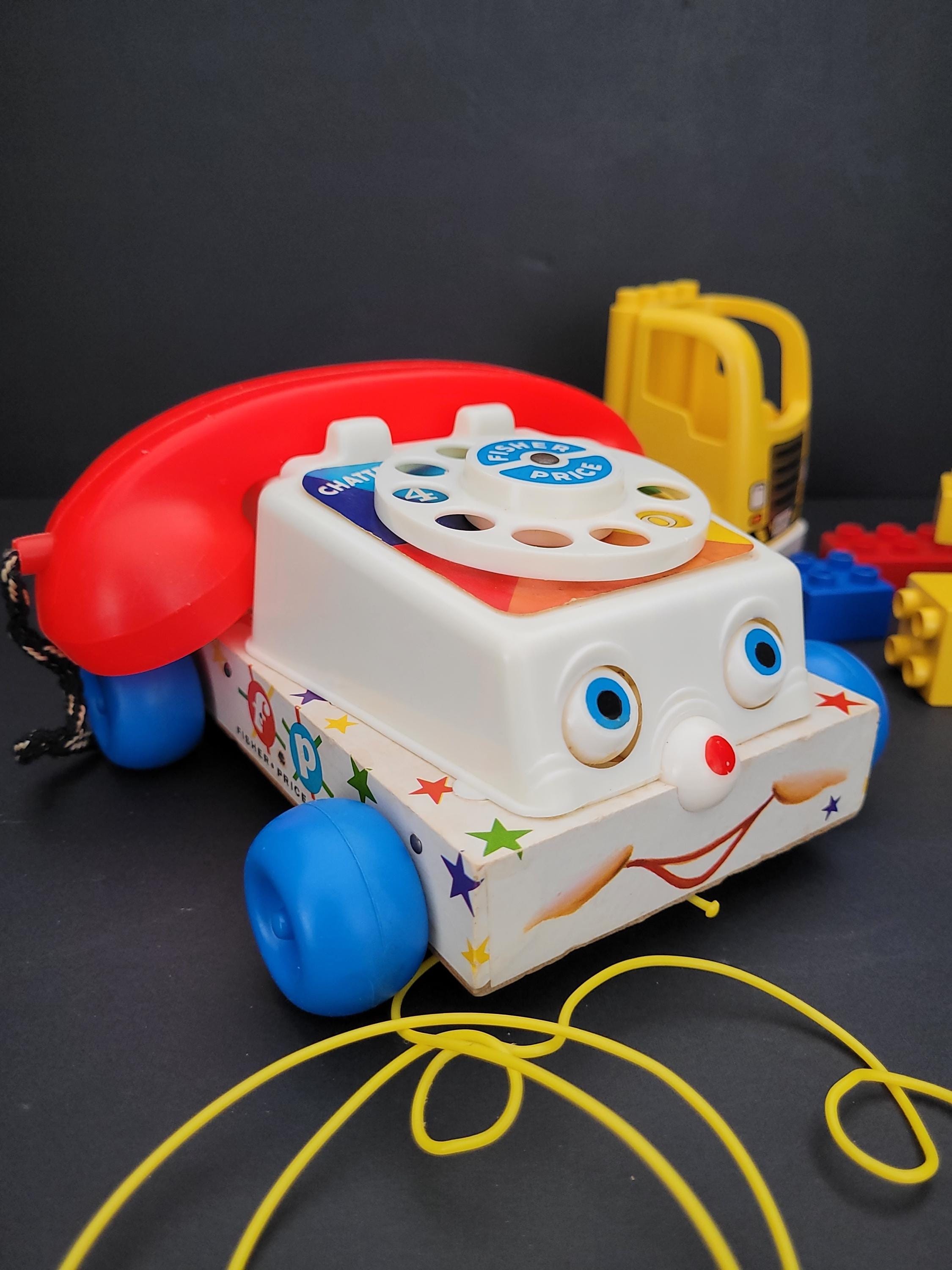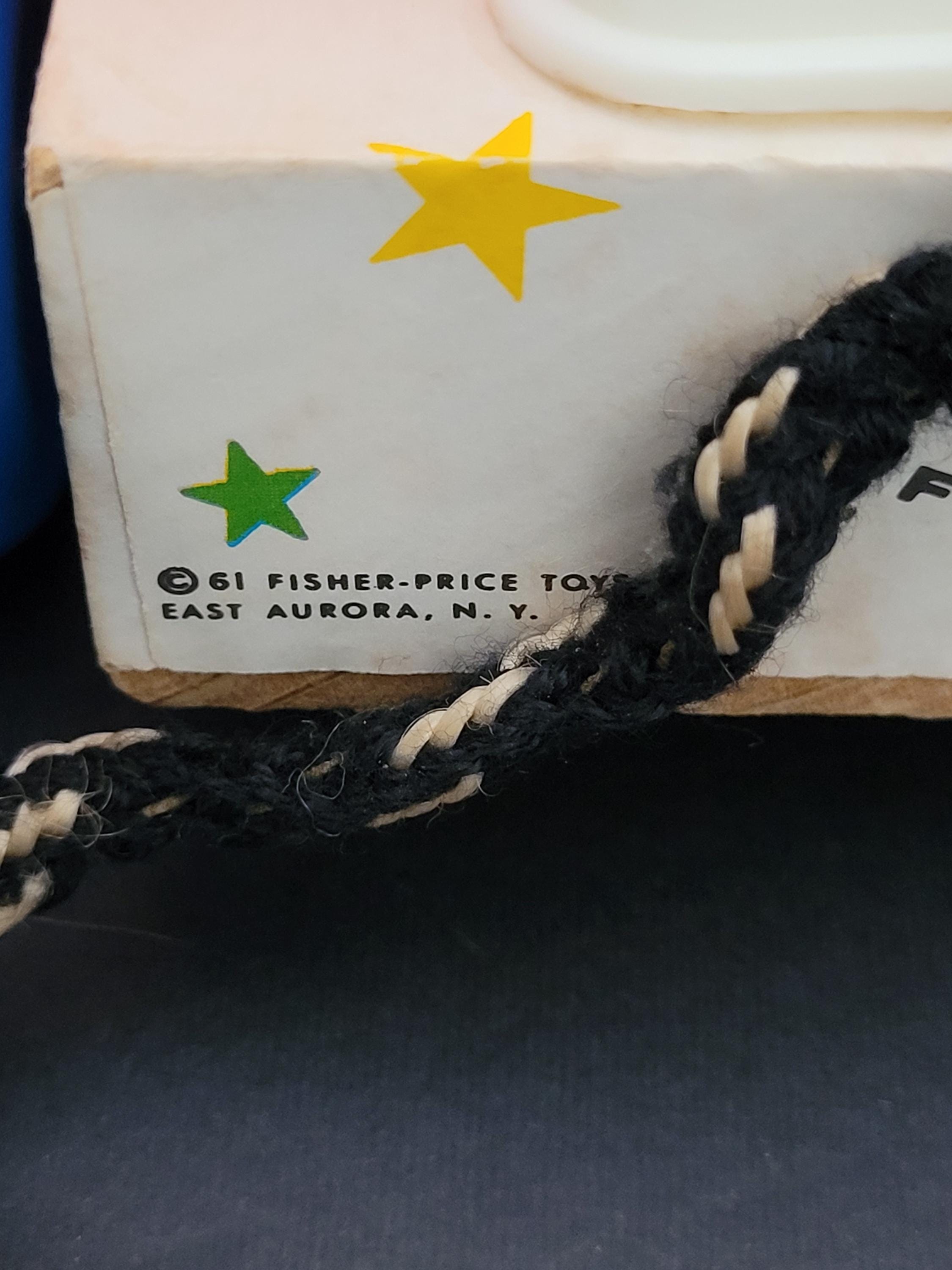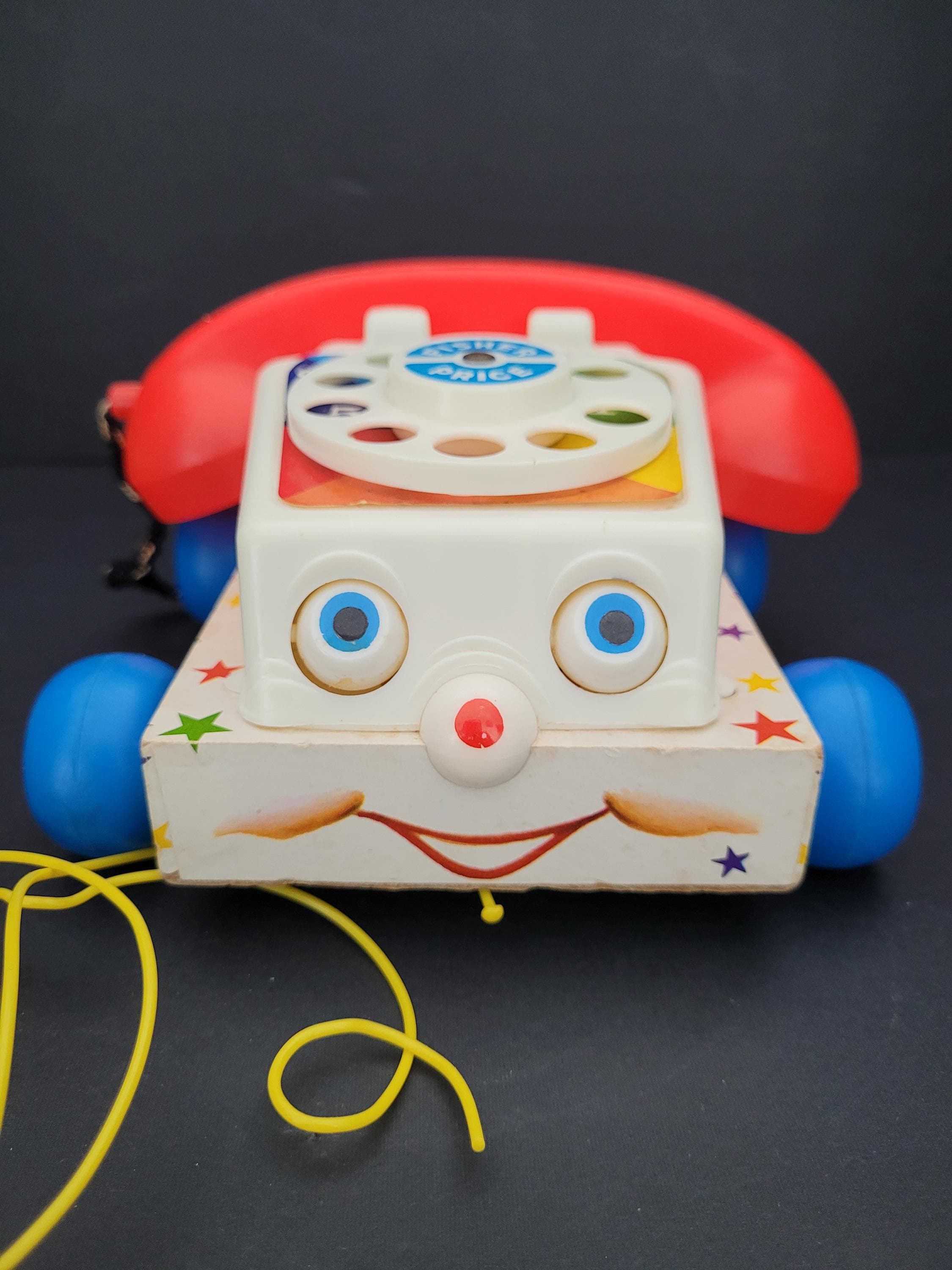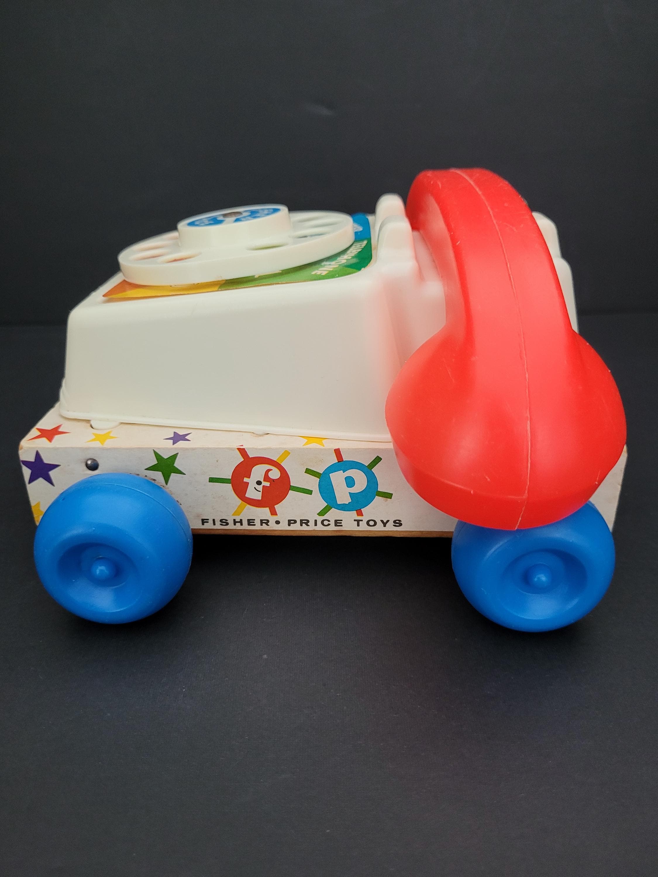WOW! This Fisher Price #747 Chatter Telephone is in outstanding condition for it's age - were it not for two tiny marks, and very minor foxing on rear lithograph, I would say "pristine" or "un-played with". Produced from 1967 - 1985, this example would be from earlier in that time frame based on the rear lithograph information. Visible "flaws" include a teeny tiny white mark on the nose, and a 2mm or 2/16" white mark under the dial lithograph's "o". The original fabric cord is unfrayed, and the plastic pull string, unknotted. Truly a fabulous exemplar of this classic toy - perfect for the collector's shelf! Please note young children should be supervised during play due to the potential safety hazard of both the pull string, and phone cord. Made in the USA.