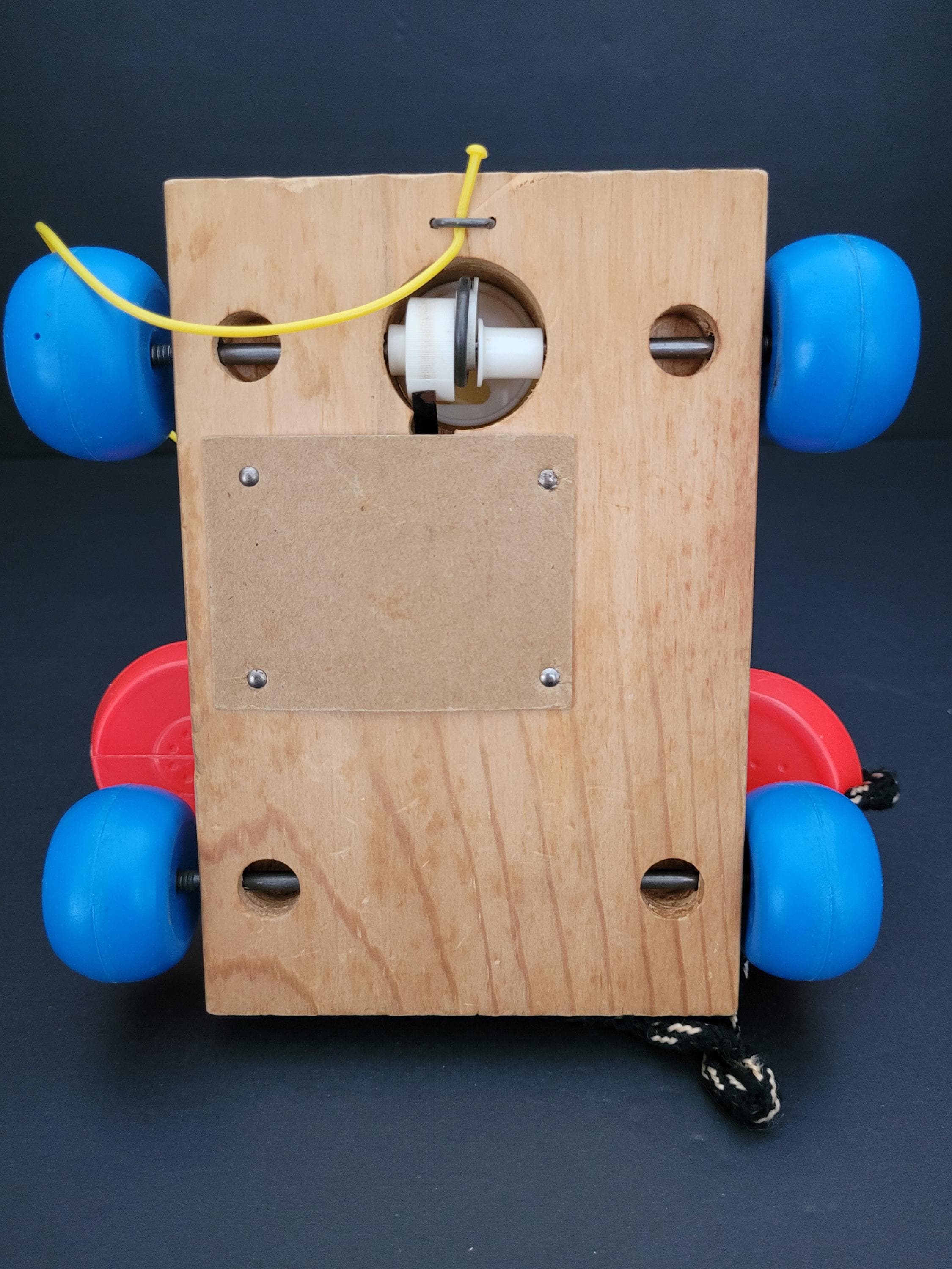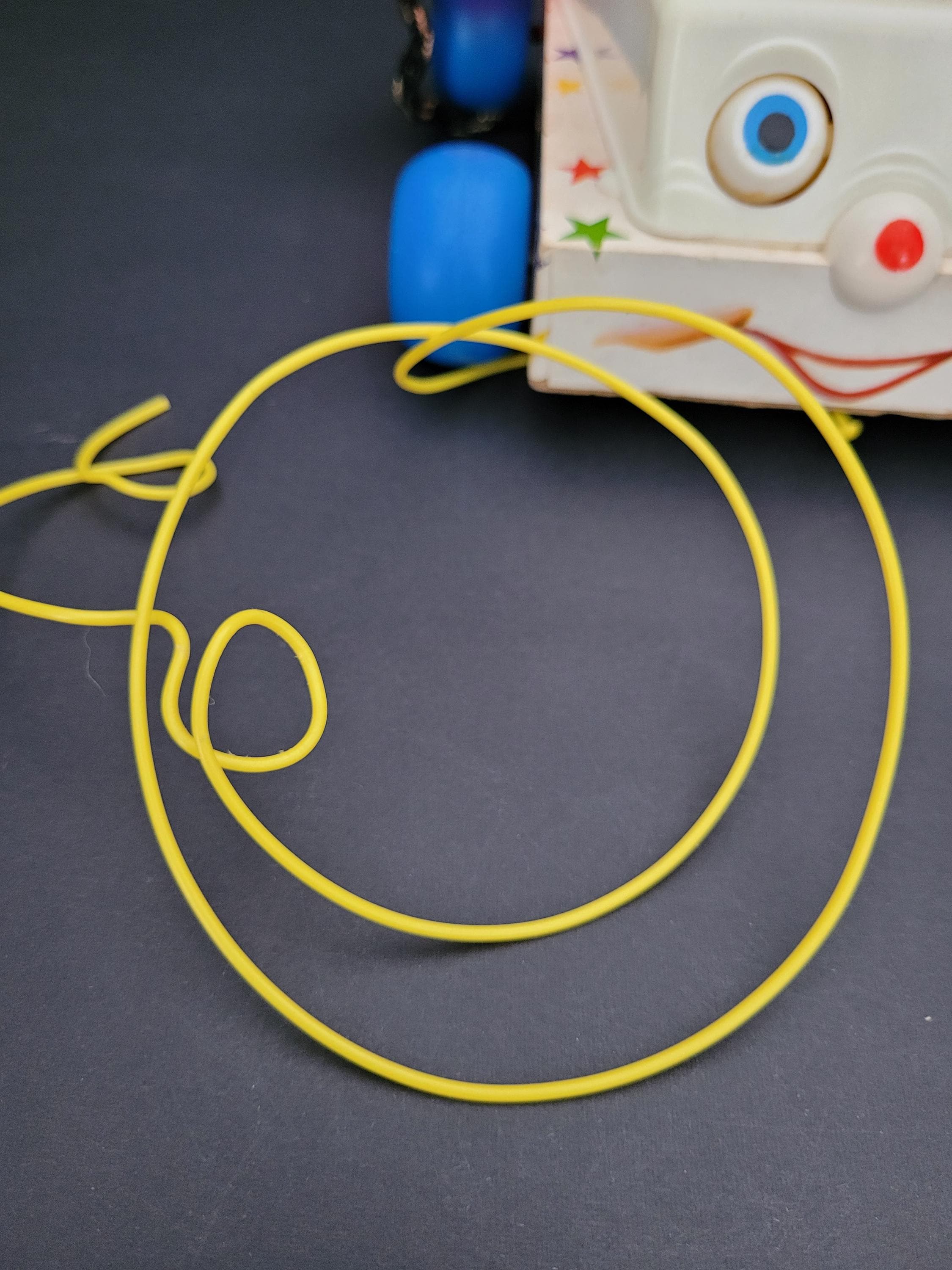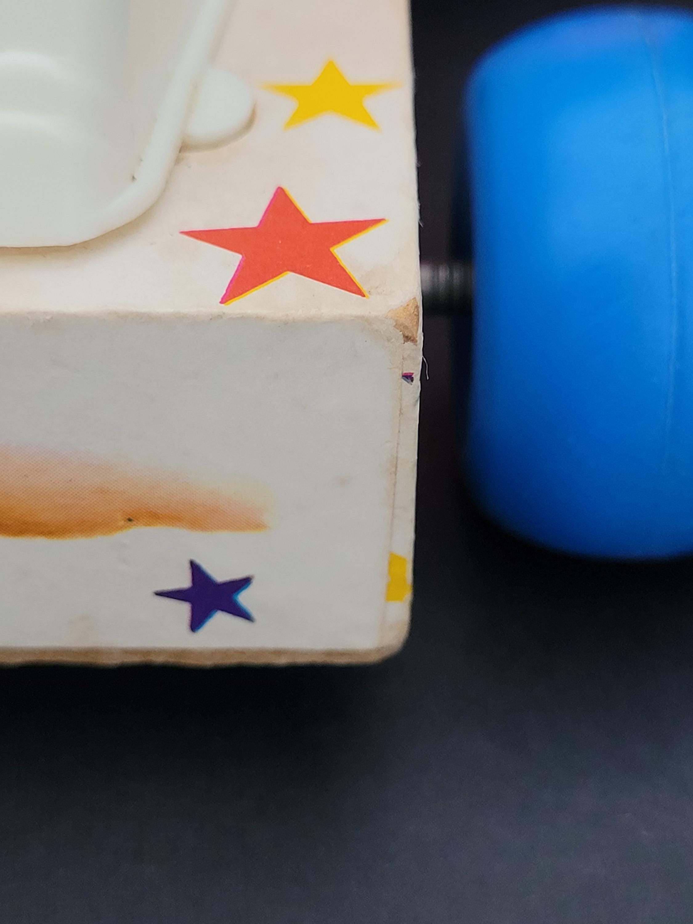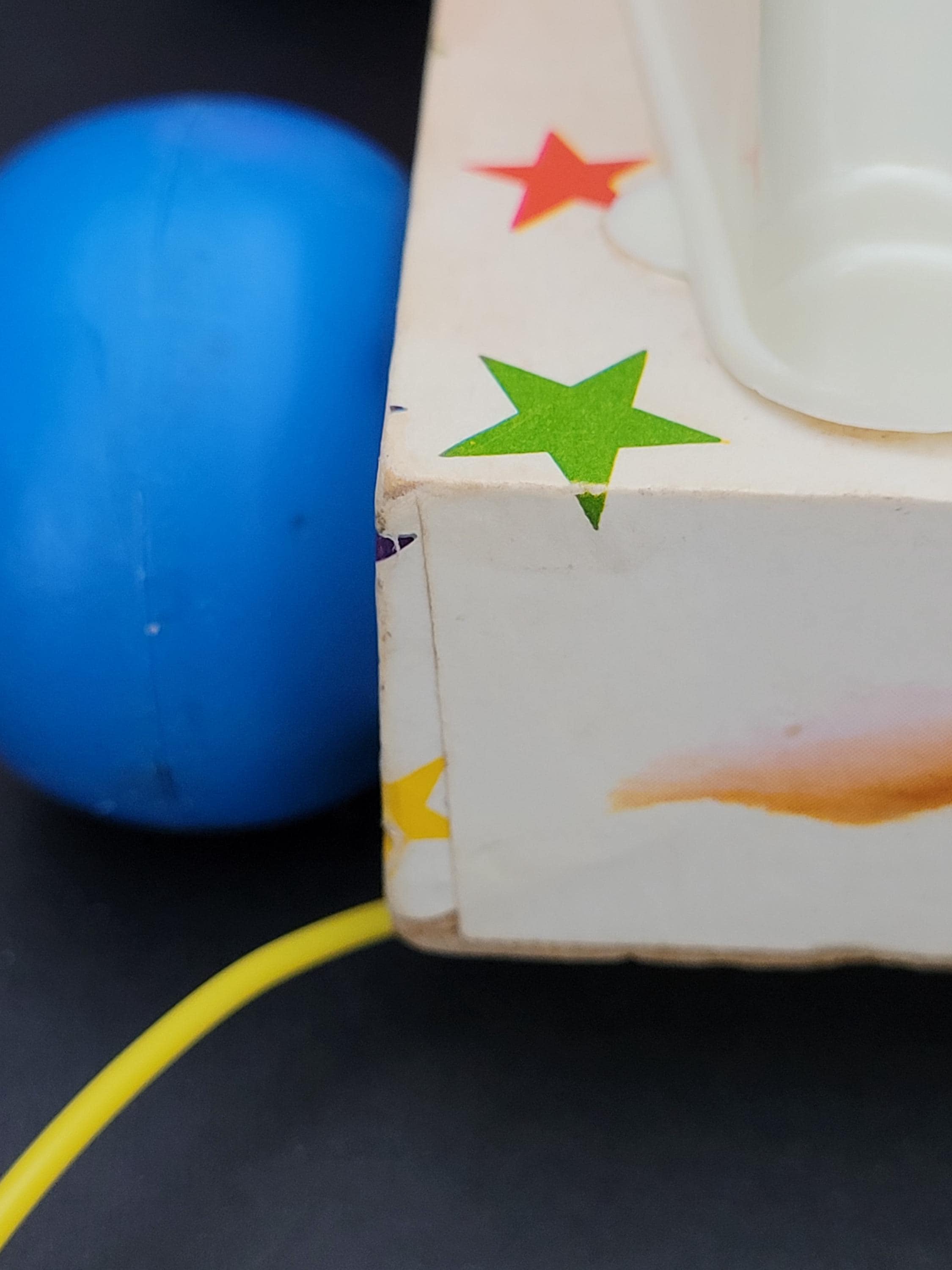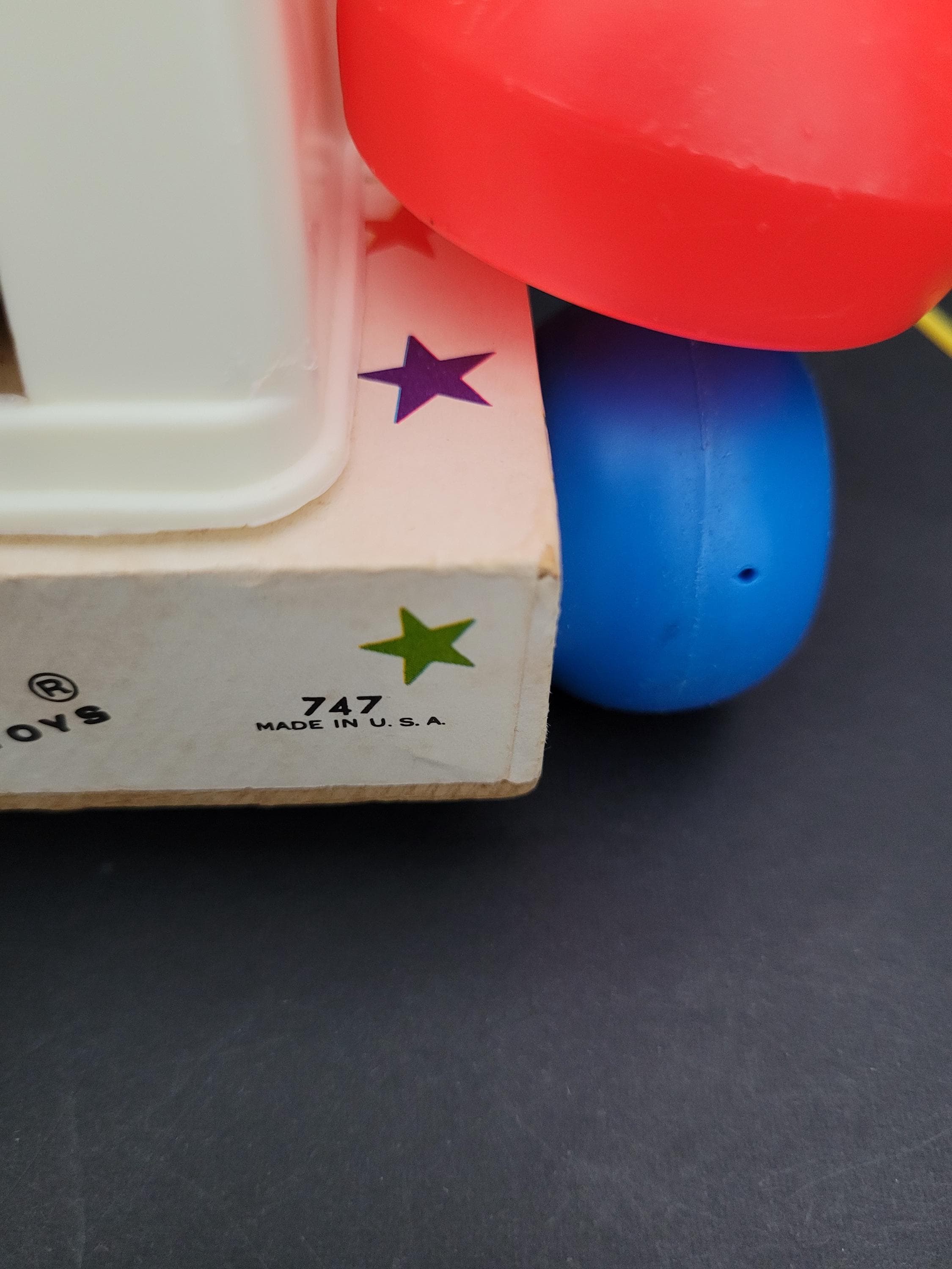 WOW! This Fisher Price #747 Chatter Telephone is in outstanding condition for it's age - were it not for two tiny marks, and very minor foxing on rear lithograph, I would say "pristine" or "un-played with". Produced from 1967 - 1985, this example would be from earlier in that time frame based on the rear lithograph information. Visible "flaws" include a teeny tiny white mark on the nose, and a 2mm or 2/16" white mark under the dial lithograph's "o". The original fabric cord is unfrayed, and the plastic pull string, unknotted. Truly a fabulous exemplar of this classic toy - perfect for the collector's shelf! Please note young children should be supervised during play due to the potential safety hazard of both the pull string, and phone cord. Made in the USA.